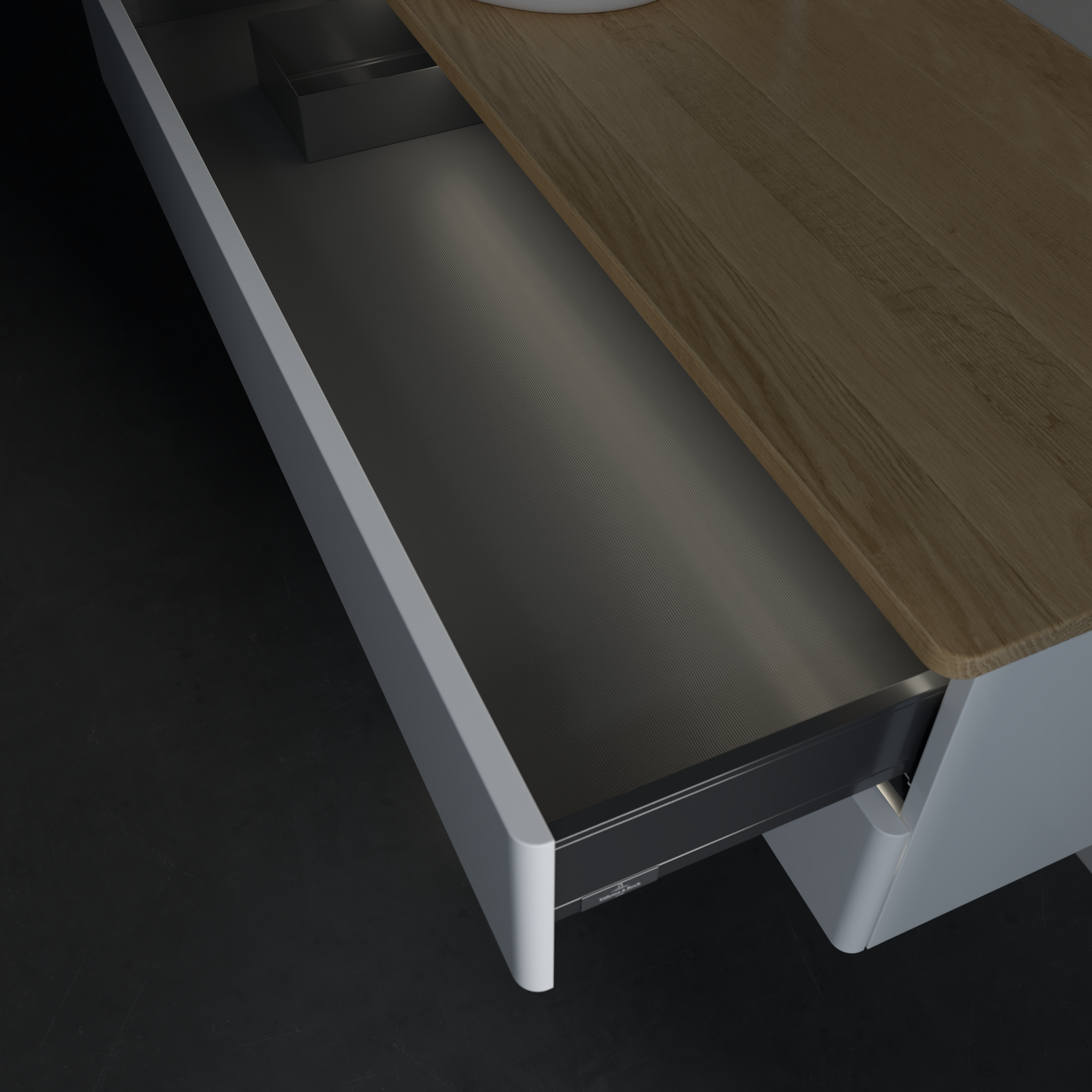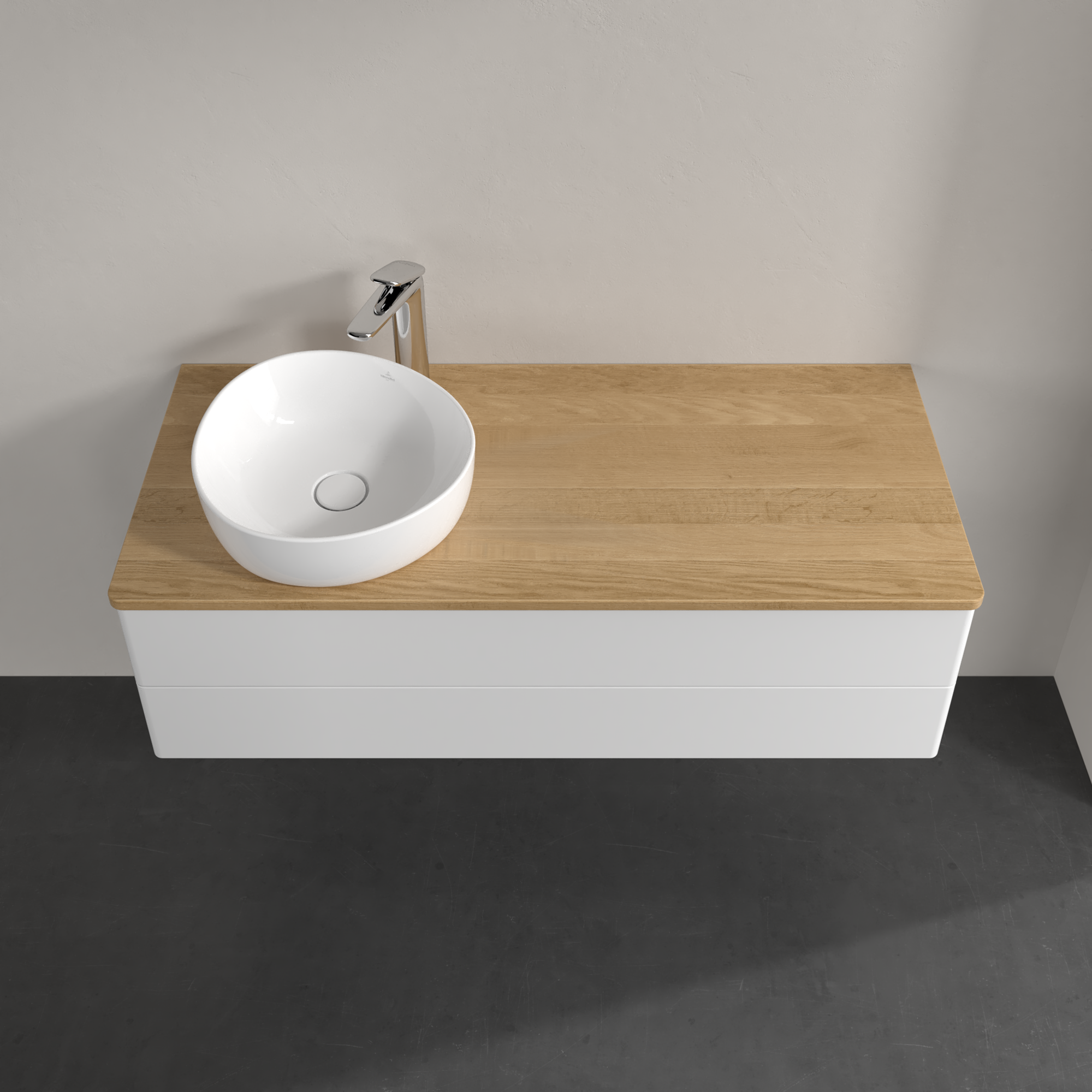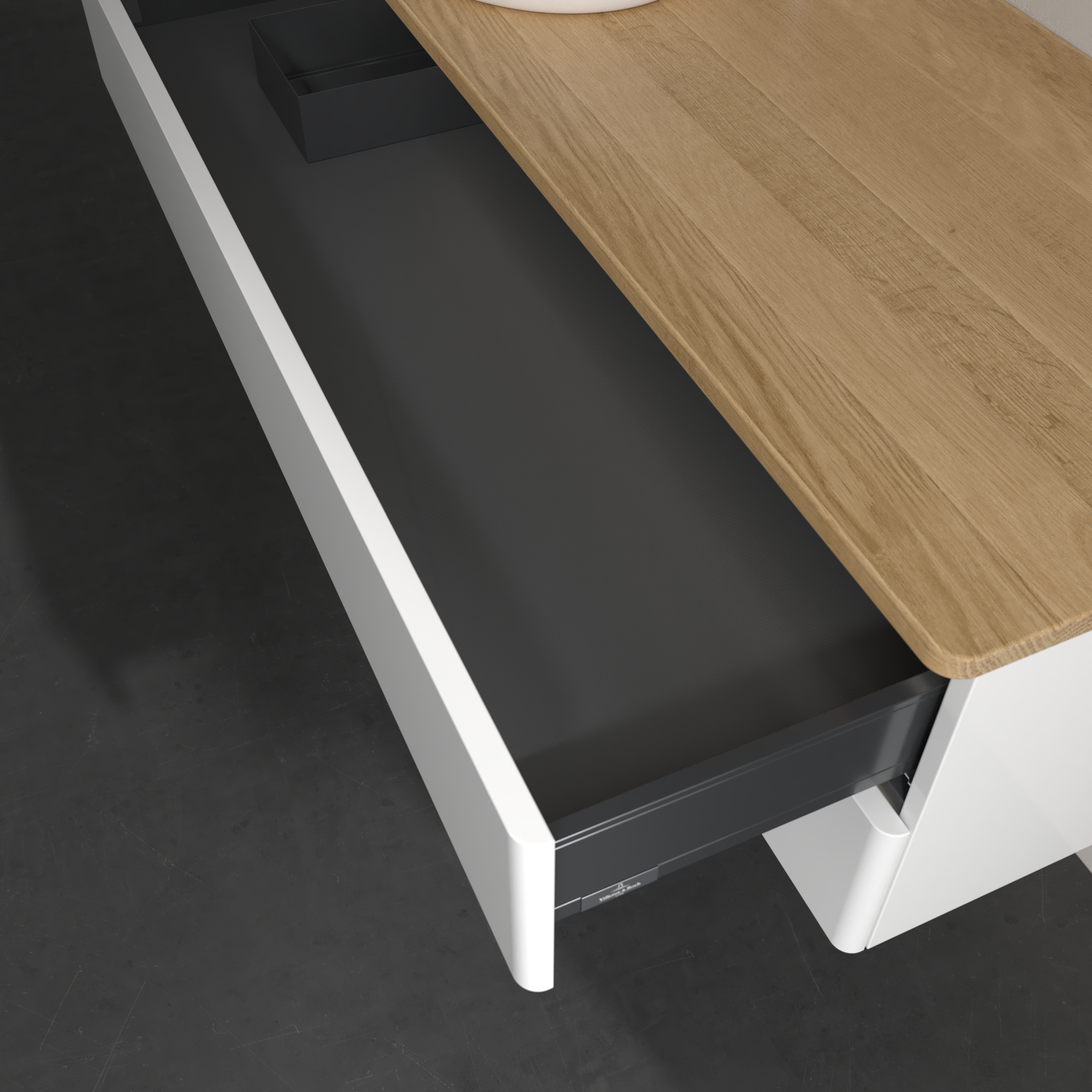 Antao Meuble sous plan, avec éclairage, 2 tiroirs sur rails, 1200x360x500mm, Façade sans structure, Caisson: Glossy White Lacquer, Façade: Glossy White Lacquer, Plaque de recouvrement: Honey Oak