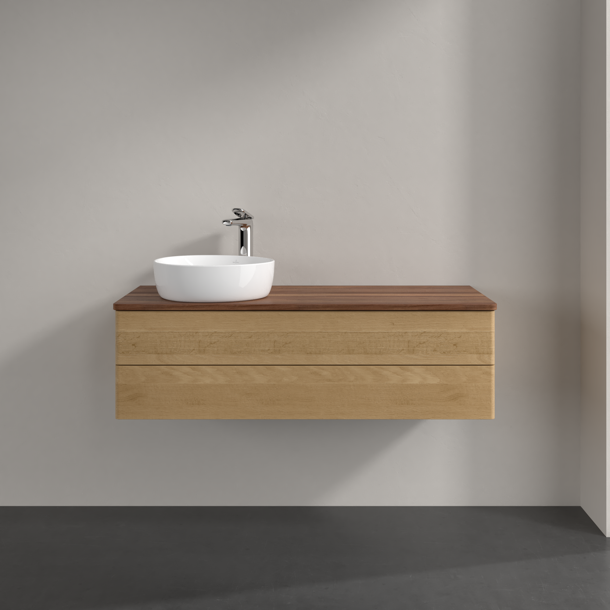Antao Meuble sous plan, avec éclairage, 2 tiroirs sur rails, 1200x360x500mm, Façade sans structure, Caisson: Honey Oak, Façade: Honey Oak, Plaque de recouvrement: Warm Walnut