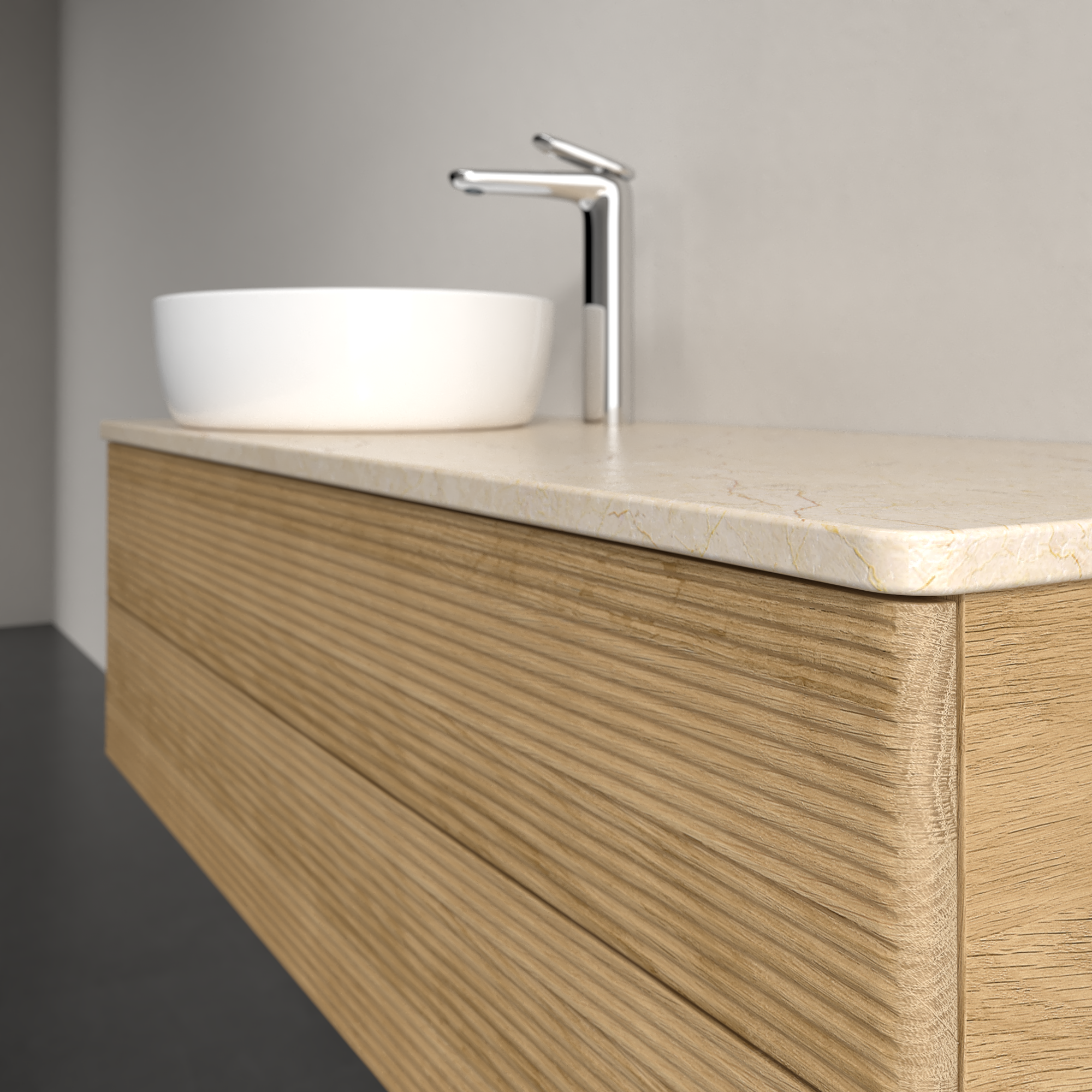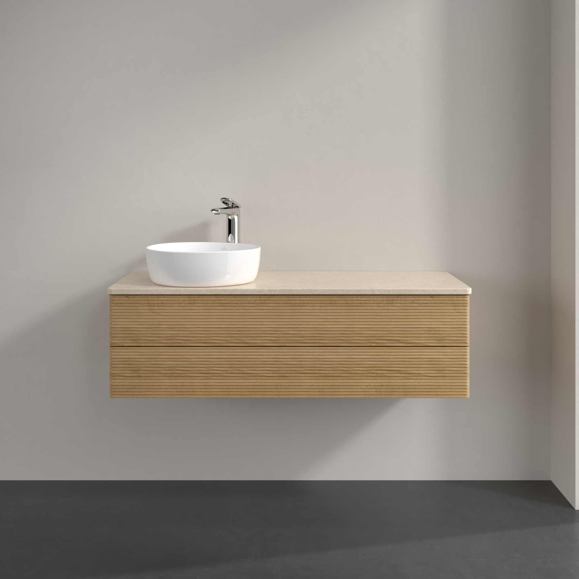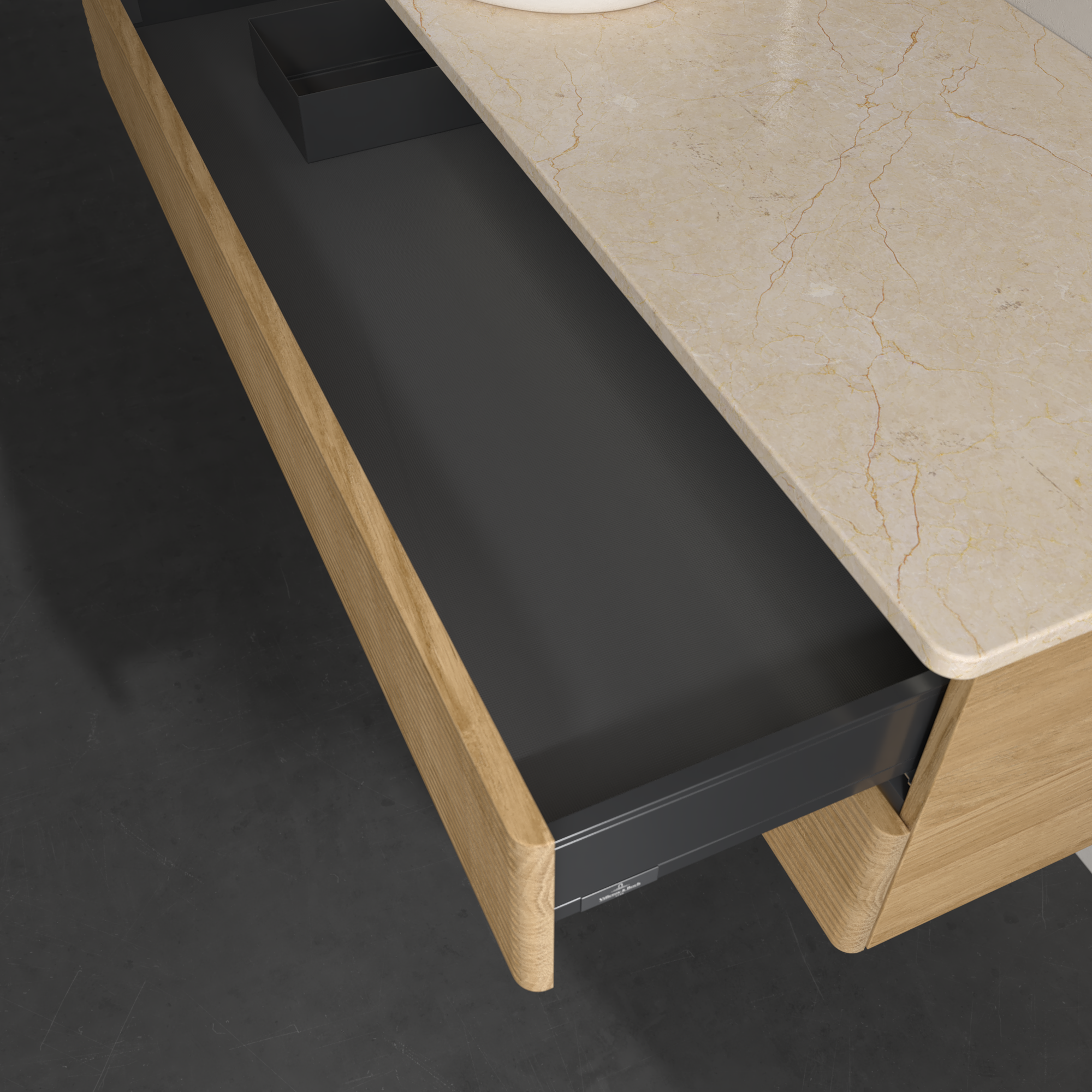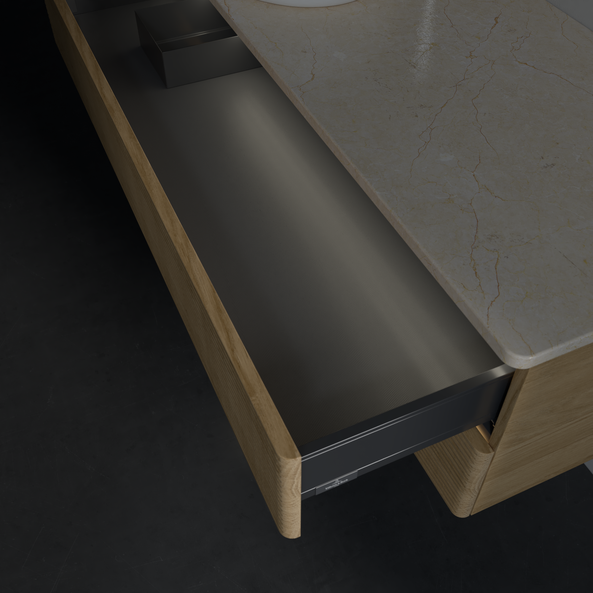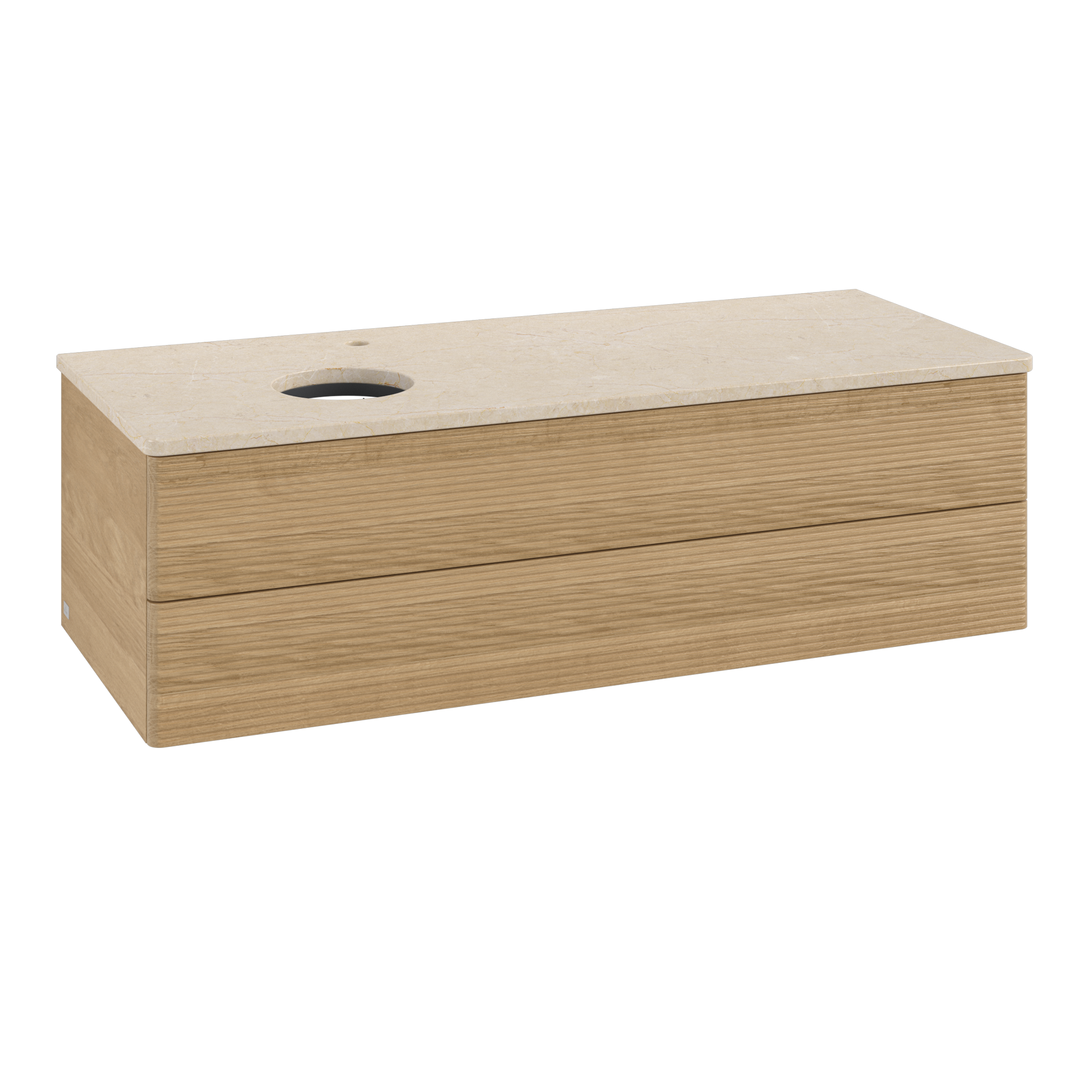 Antao Meuble sous plan, avec éclairage, 2 tiroirs sur rails, 1200x360x500mm, Façade avec structure, Caisson: Honey Oak, Façade: Honey Oak, Plaque de recouvrement: Botticino
