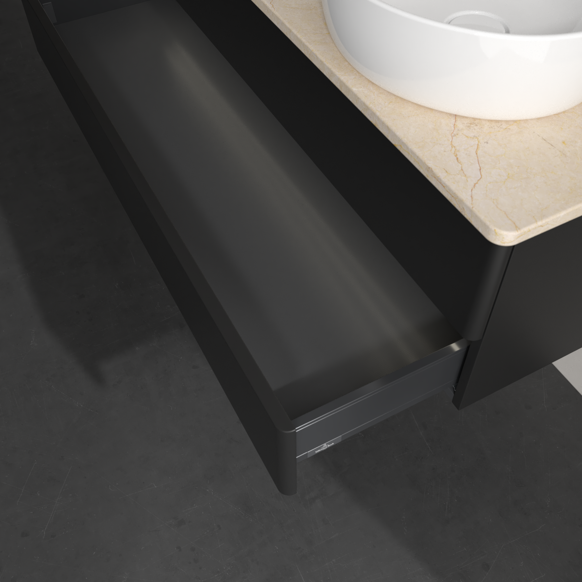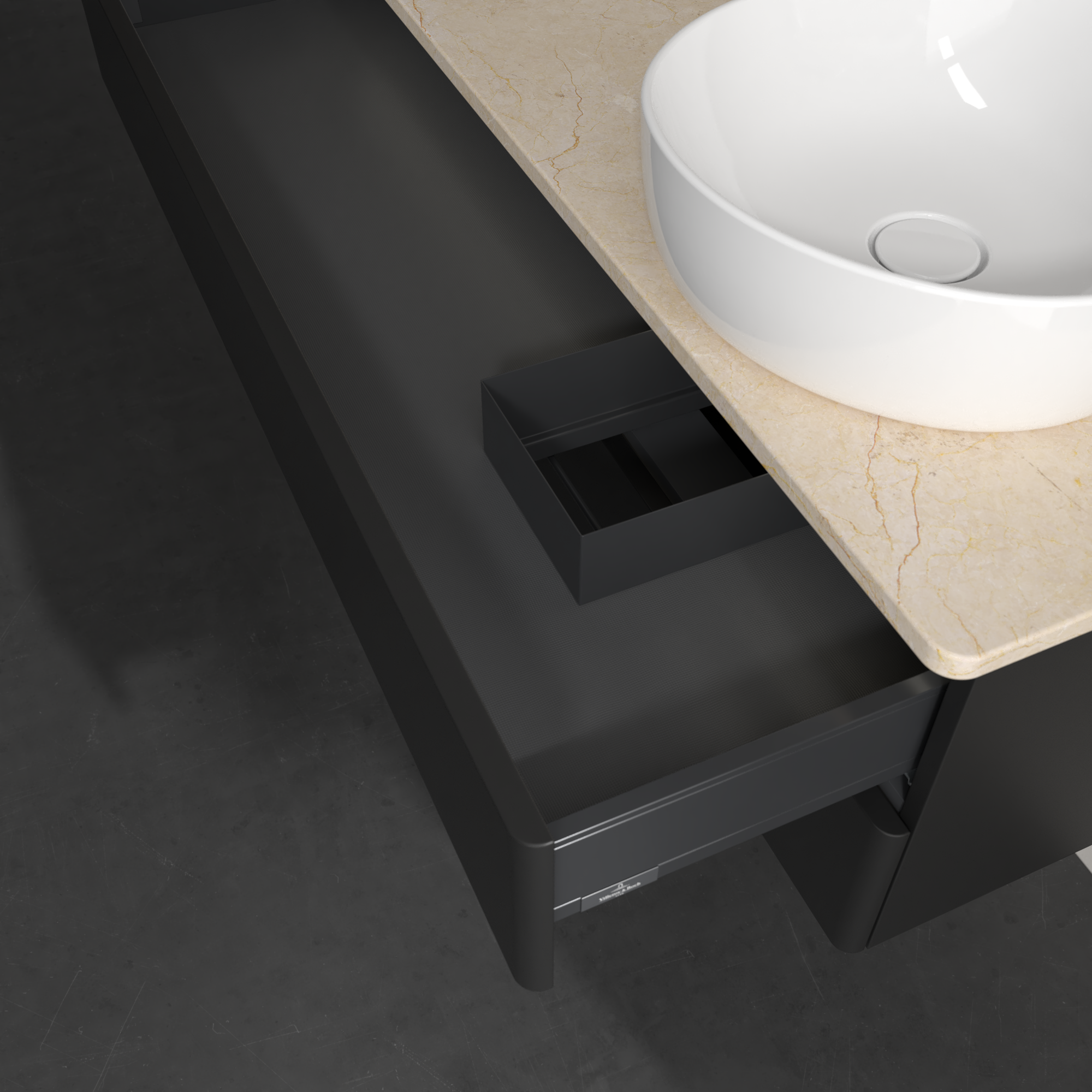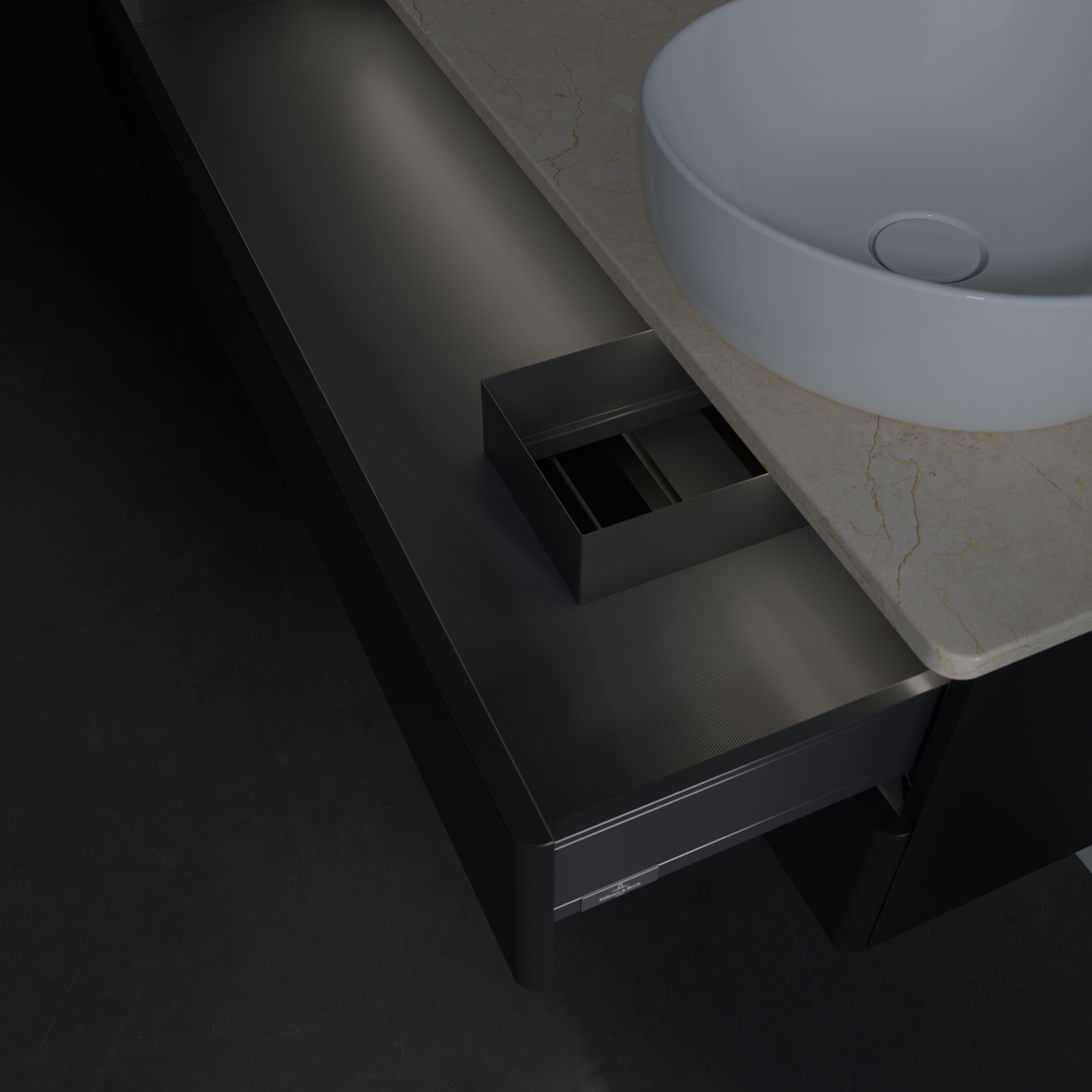 Antao Meuble sous plan, avec éclairage, 2 tiroirs sur rails, 1200x360x500mm, Façade sans structure, Caisson: Black Matt Lacquer, Façade: Black Matt Lacquer, Plaque de recouvrement: Botticino
