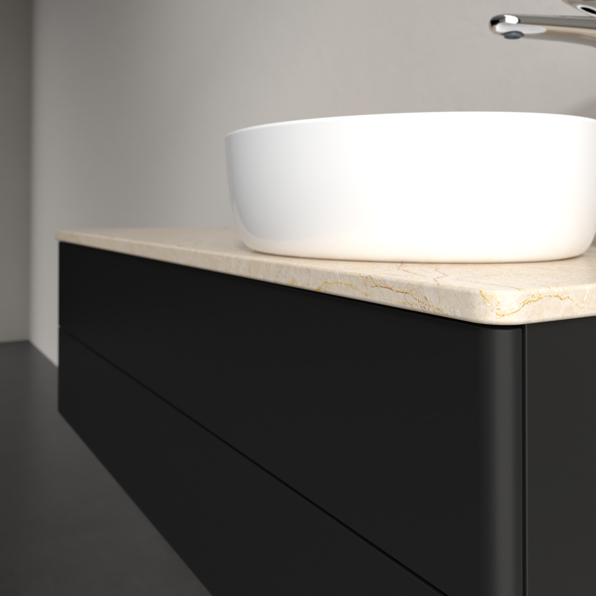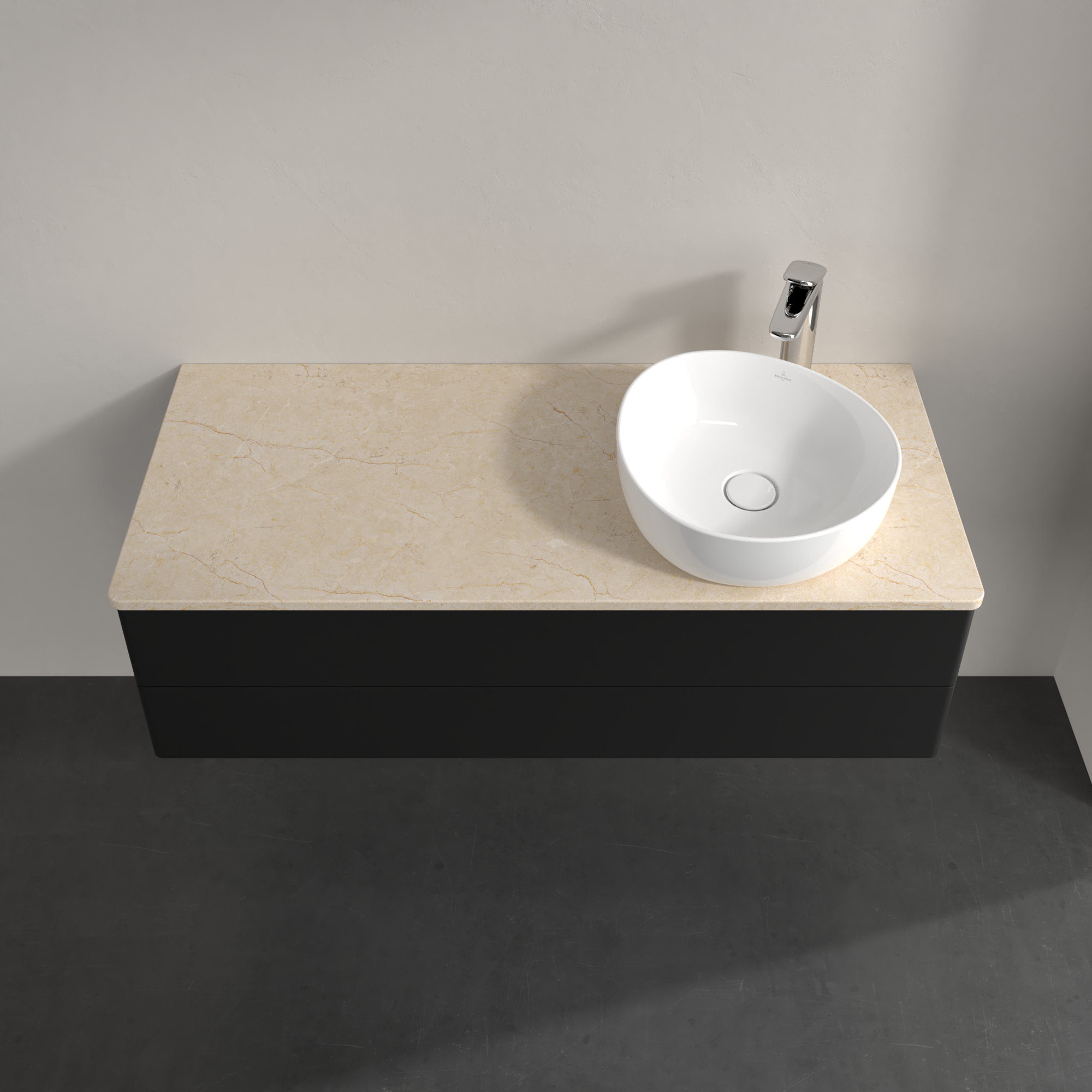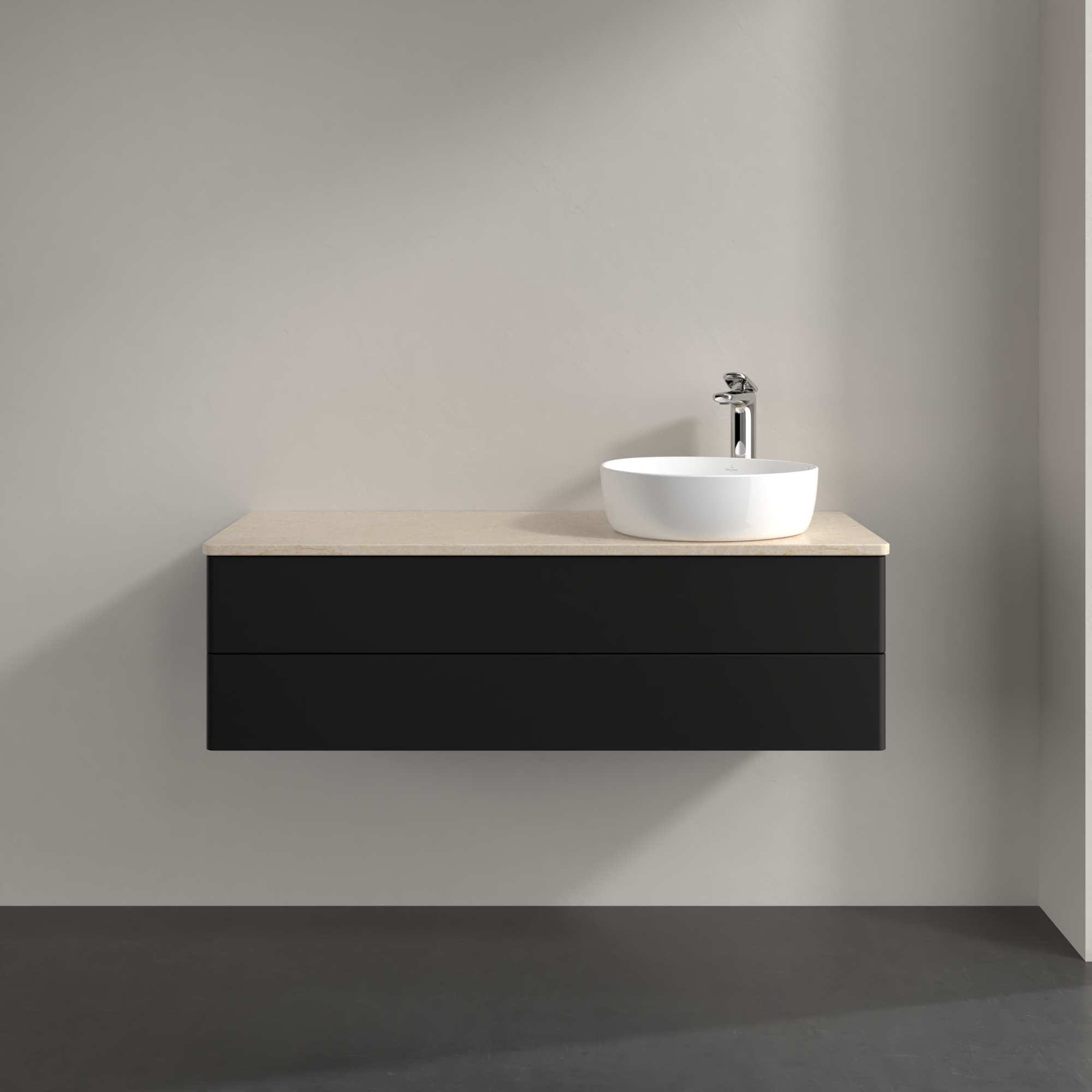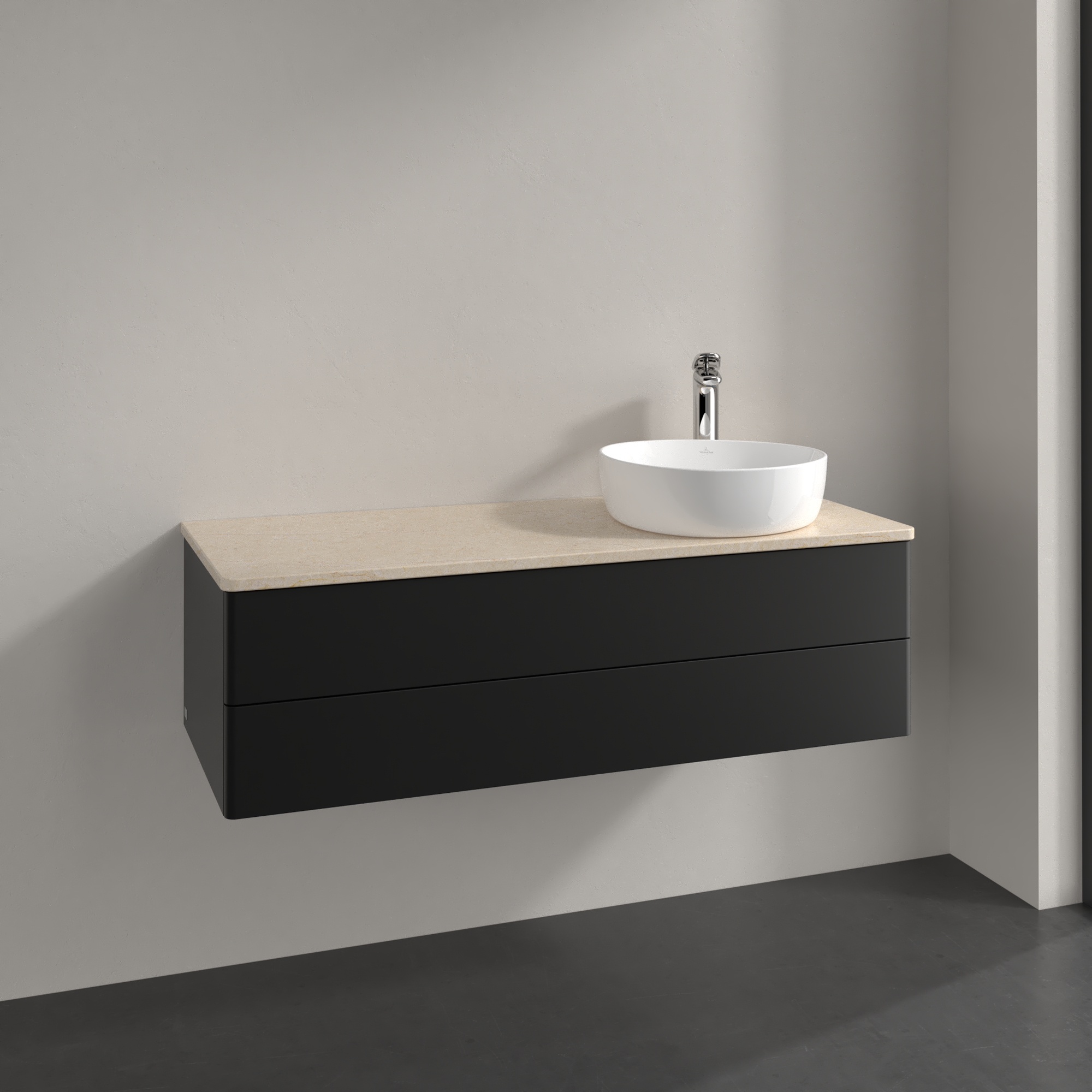 Antao Meuble sous plan, avec éclairage, 2 tiroirs sur rails, 1200x360x500mm, Façade sans structure, Caisson: Black Matt Lacquer, Façade: Black Matt Lacquer, Plaque de recouvrement: Botticino