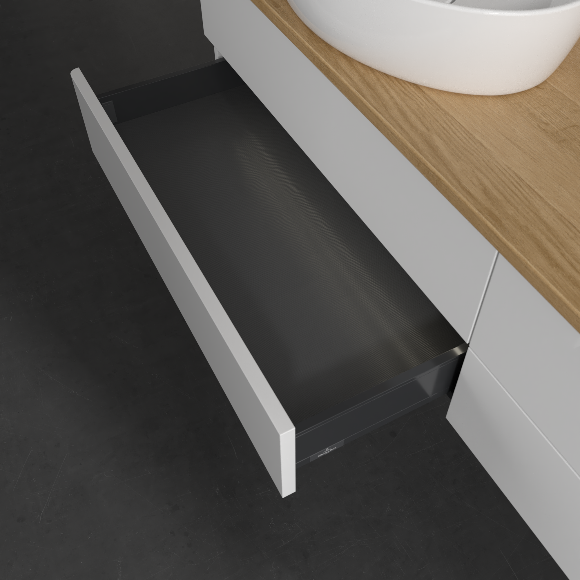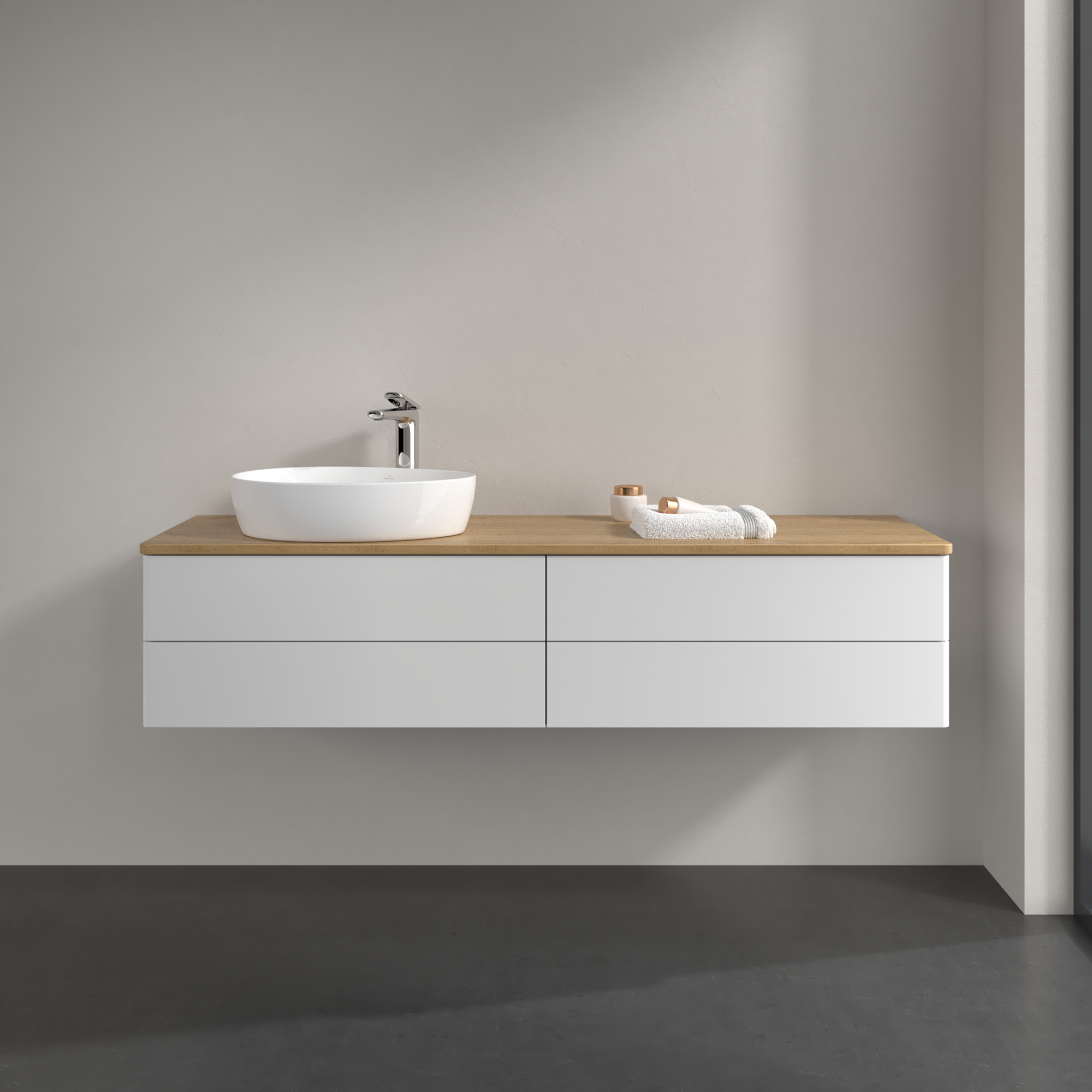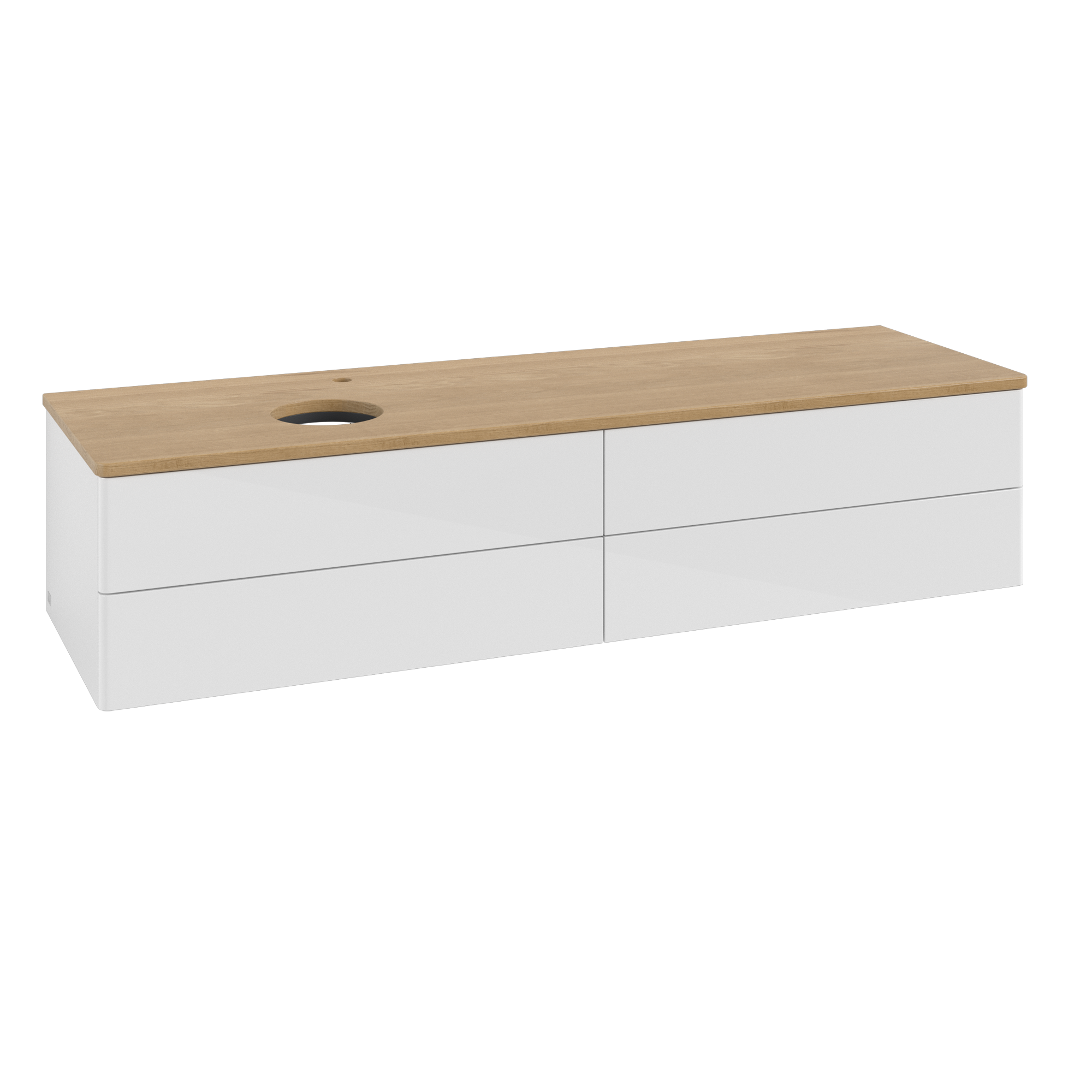 Antao Meuble sous plan, avec éclairage, 4 tiroirs sur rails, 1600x360x500mm, Façade sans structure, Caisson: Glossy White Lacquer, Façade: Glossy White Lacquer, Plaque de recouvrement: Honey Oak
