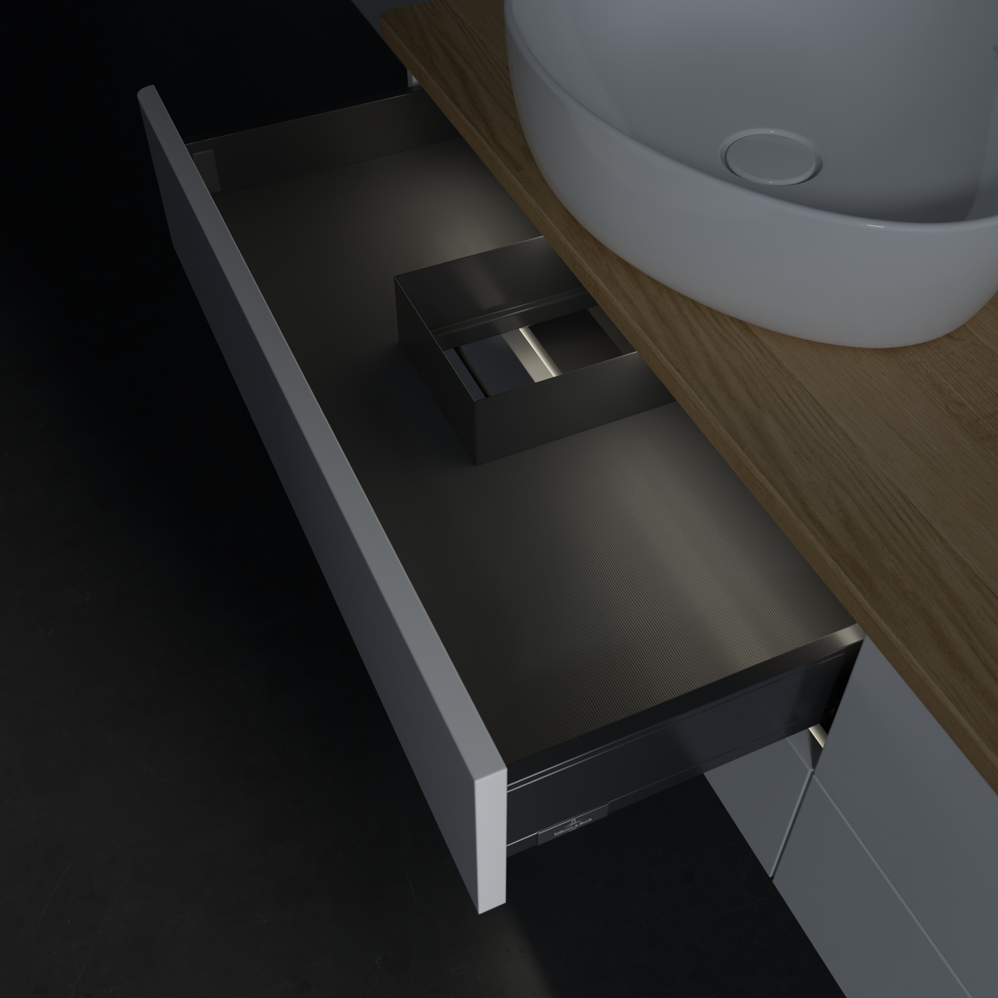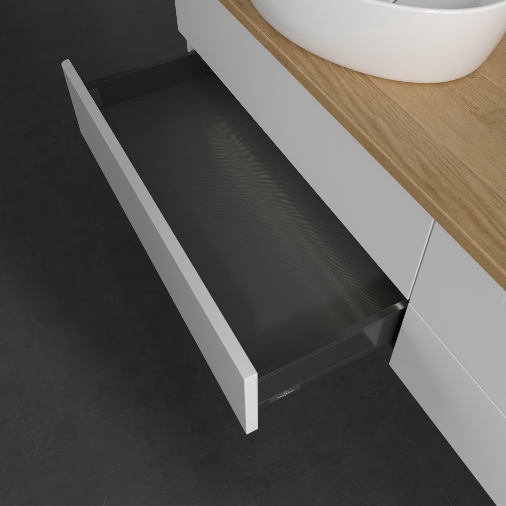 Antao Meuble sous plan, avec éclairage, 4 tiroirs sur rails, 1600x360x500mm, Façade sans structure, Caisson: Glossy White Lacquer, Façade: Glossy White Lacquer, Plaque de recouvrement: Honey Oak