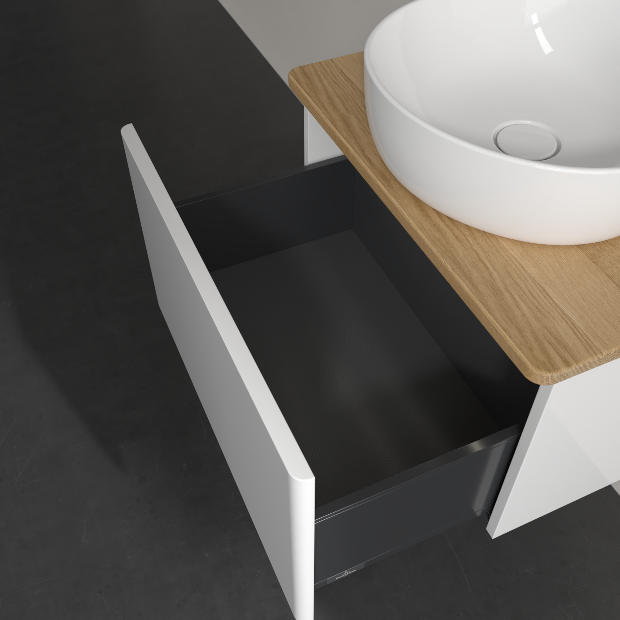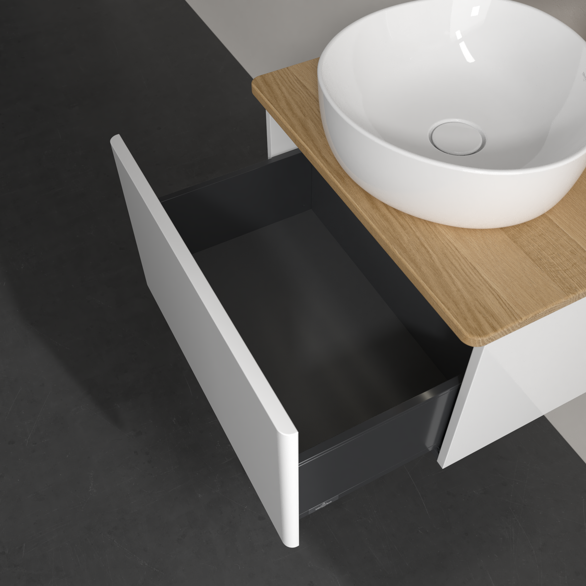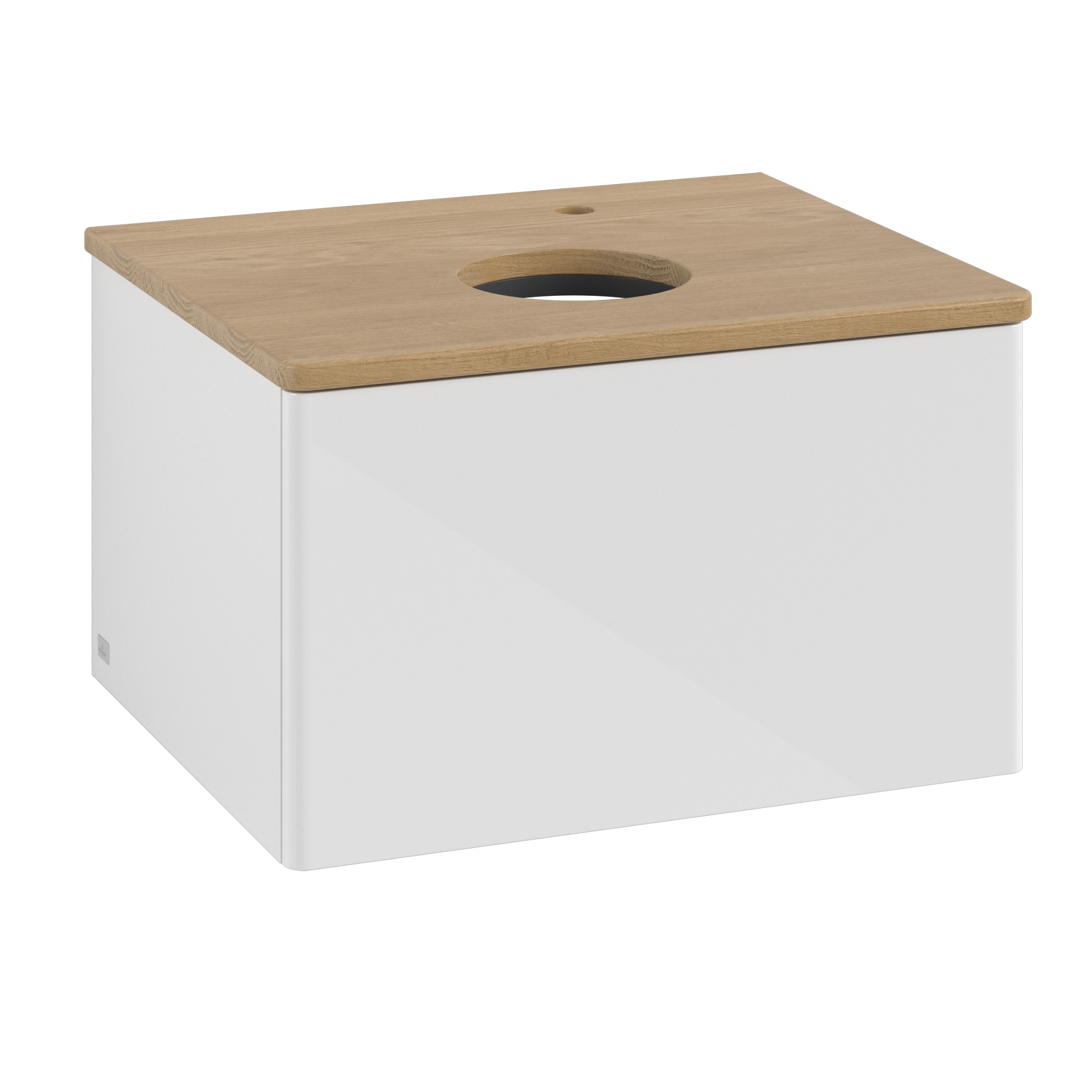 Antao Meuble sous plan, avec éclairage, 1 tiroir sur rails, 600x360x500mm, Façade sans structure, Caisson: Glossy White Lacquer, Façade: Glossy White Lacquer, Plaque de recouvrement: Honey Oak