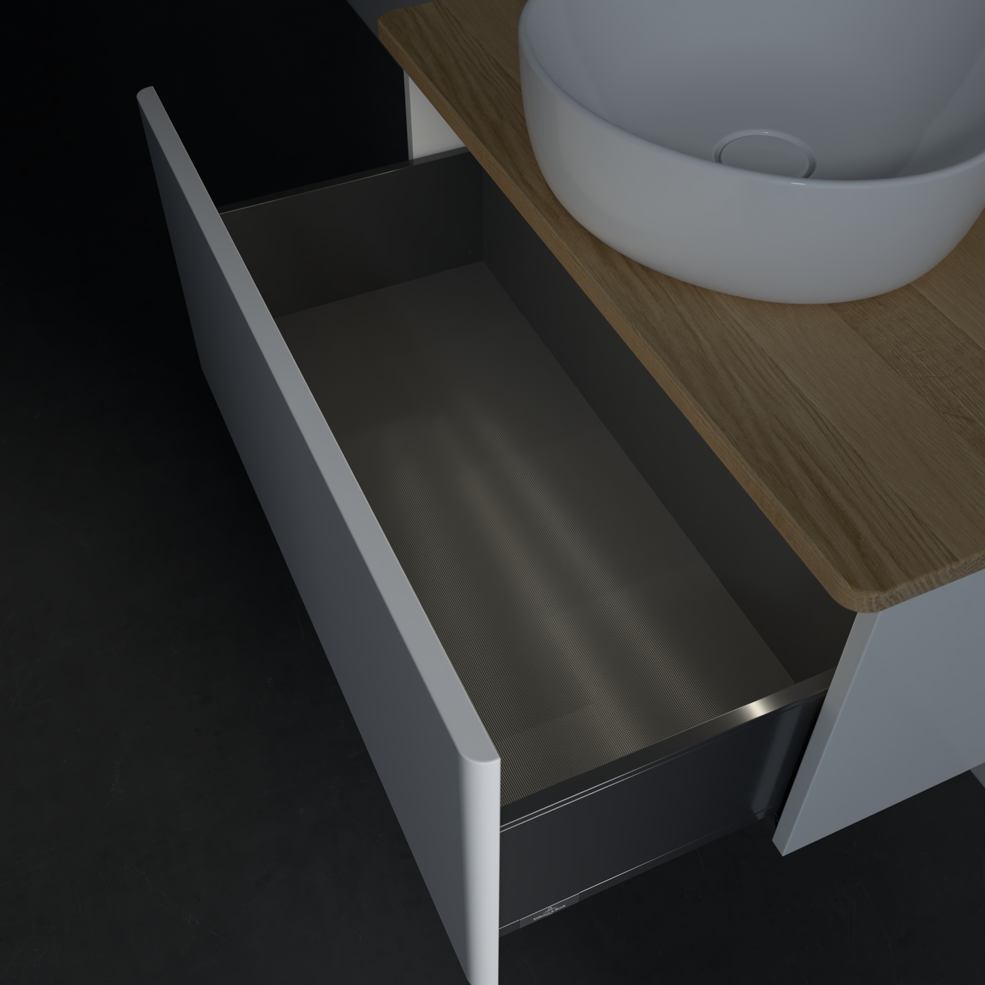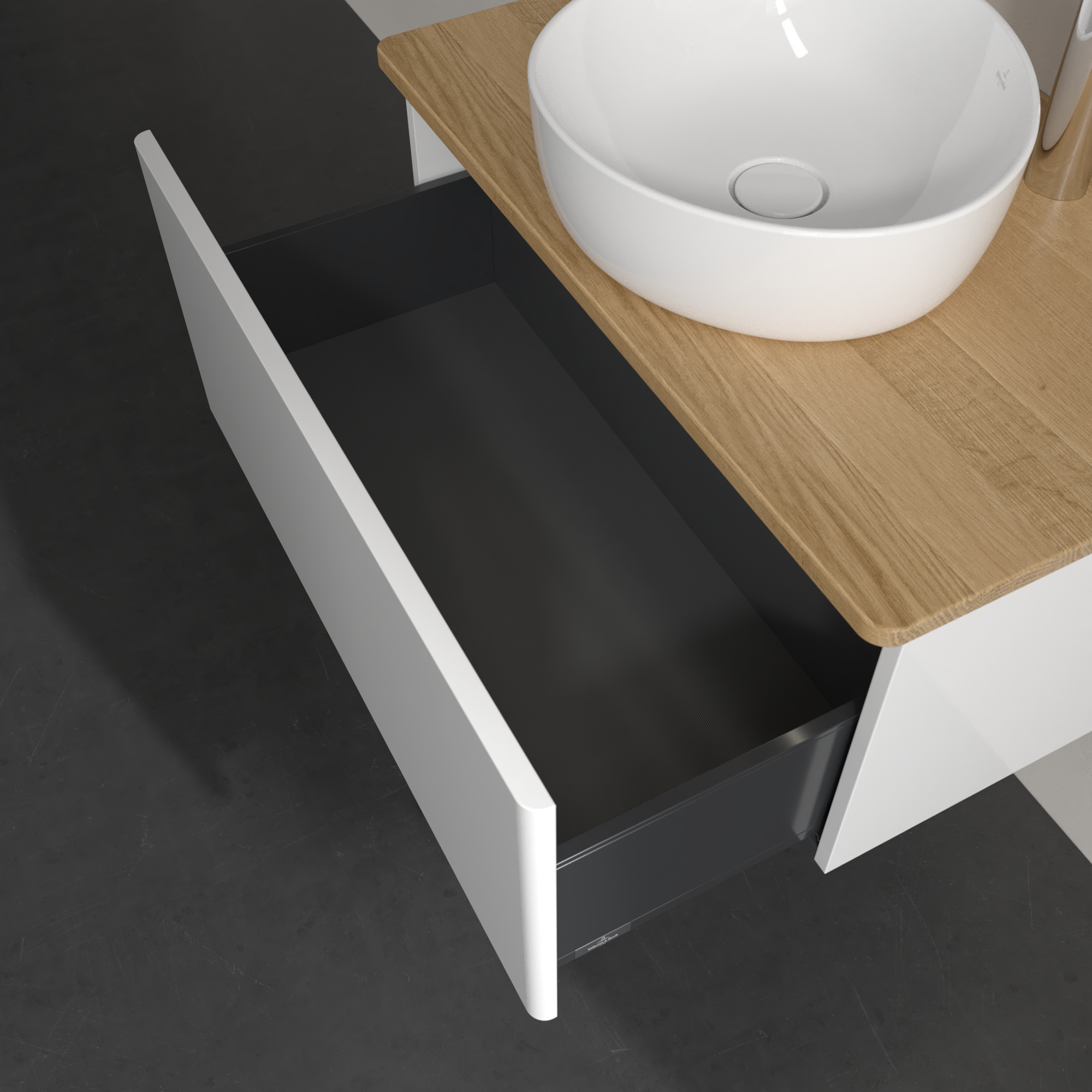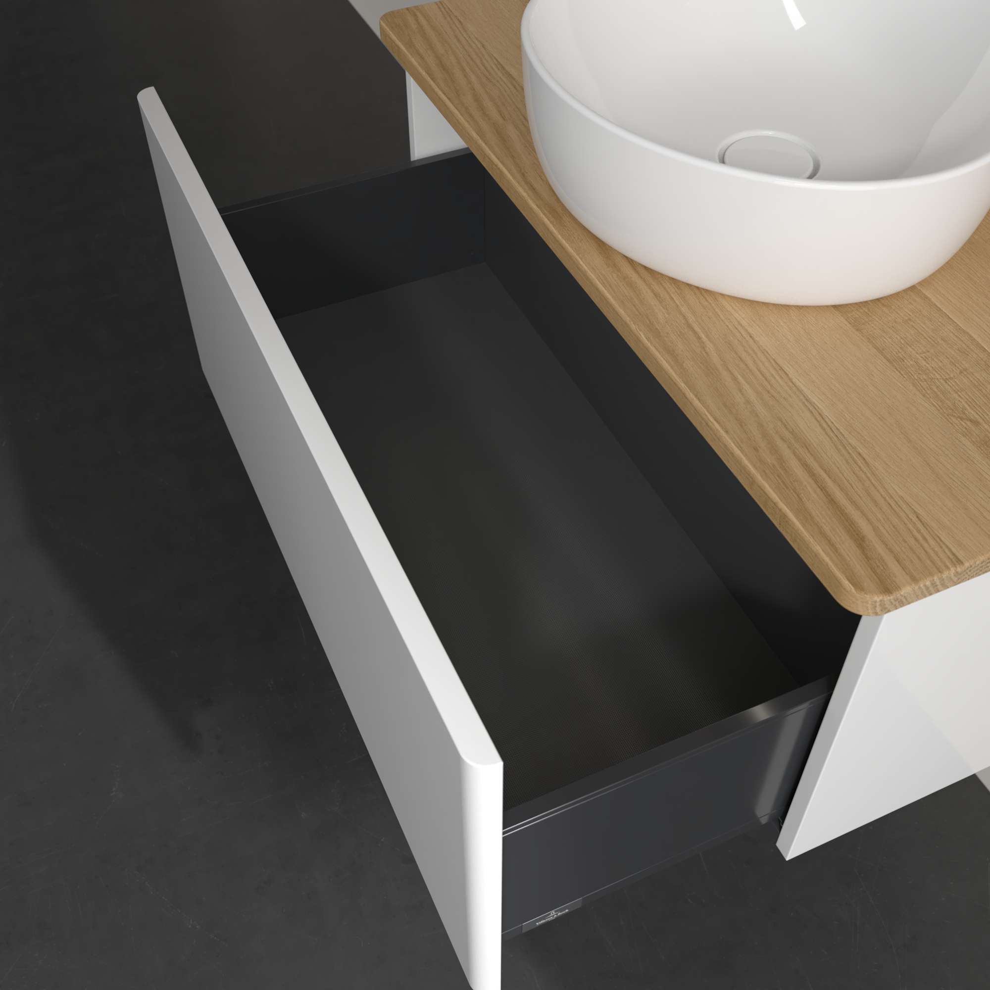 Antao Meuble sous plan, avec éclairage, 1 tiroir sur rails, 800x360x500mm, Façade sans structure, Caisson: Glossy White Lacquer, Façade: Glossy White Lacquer, Plaque de recouvrement: Honey Oak