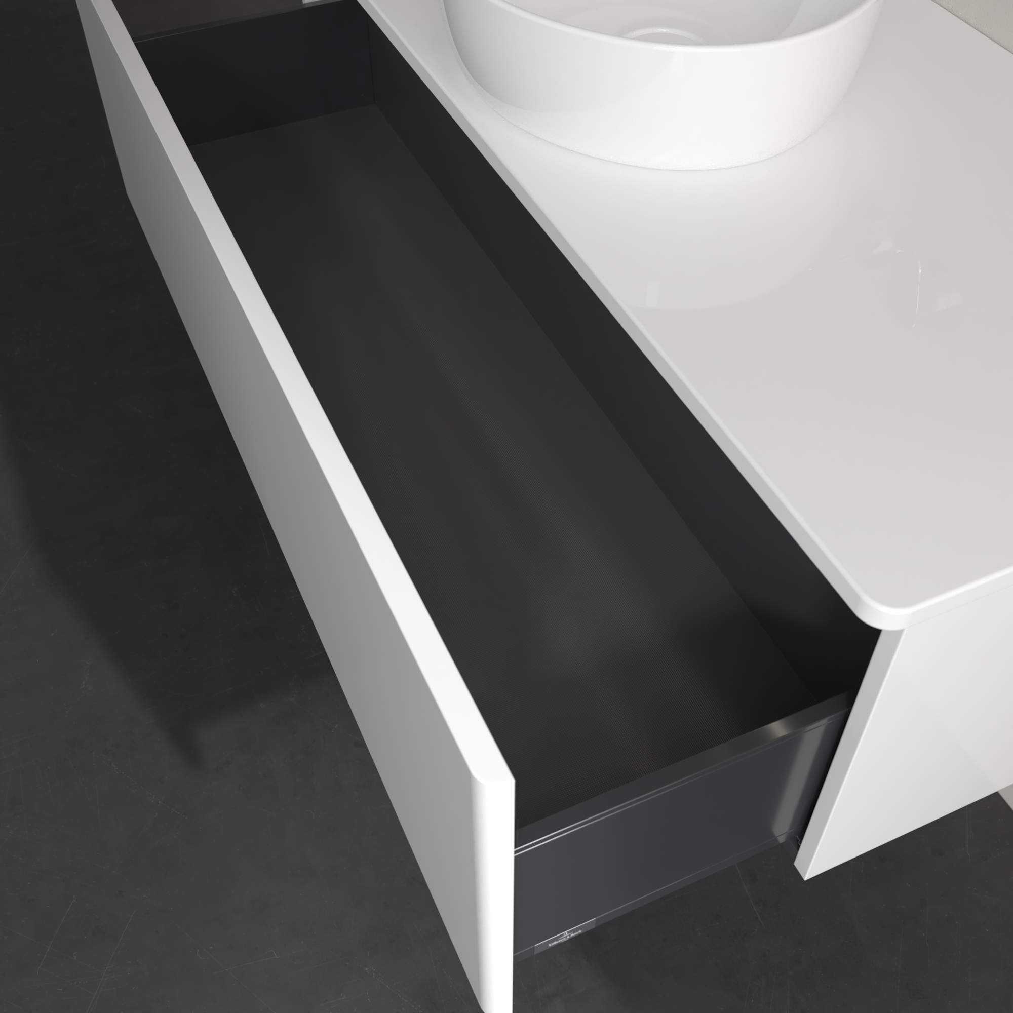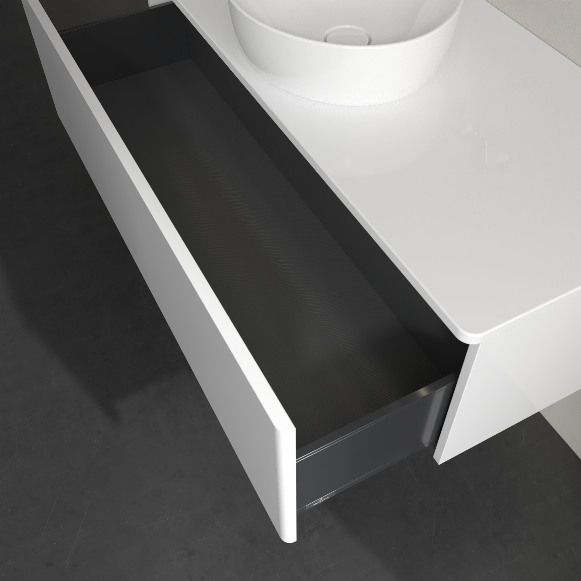 Antao Meuble sous plan, avec éclairage, 1 tiroir sur rails, 1200x360x500mm, Façade sans structure, Caisson: Glossy White Lacquer, Façade: Glossy White Lacquer, Plaque de recouvrement: Glossy White Lacquer