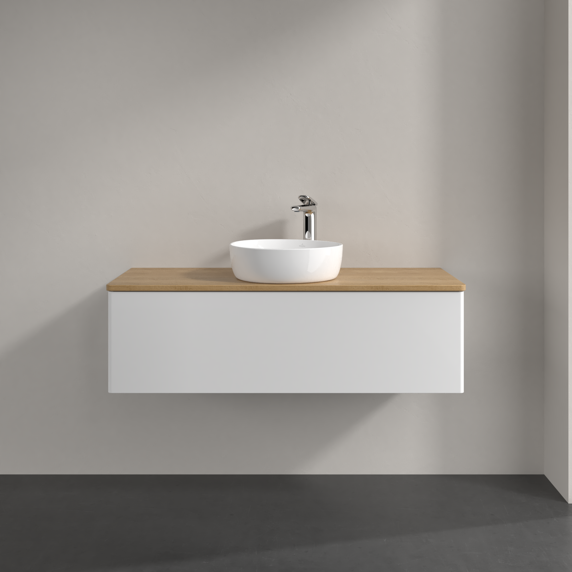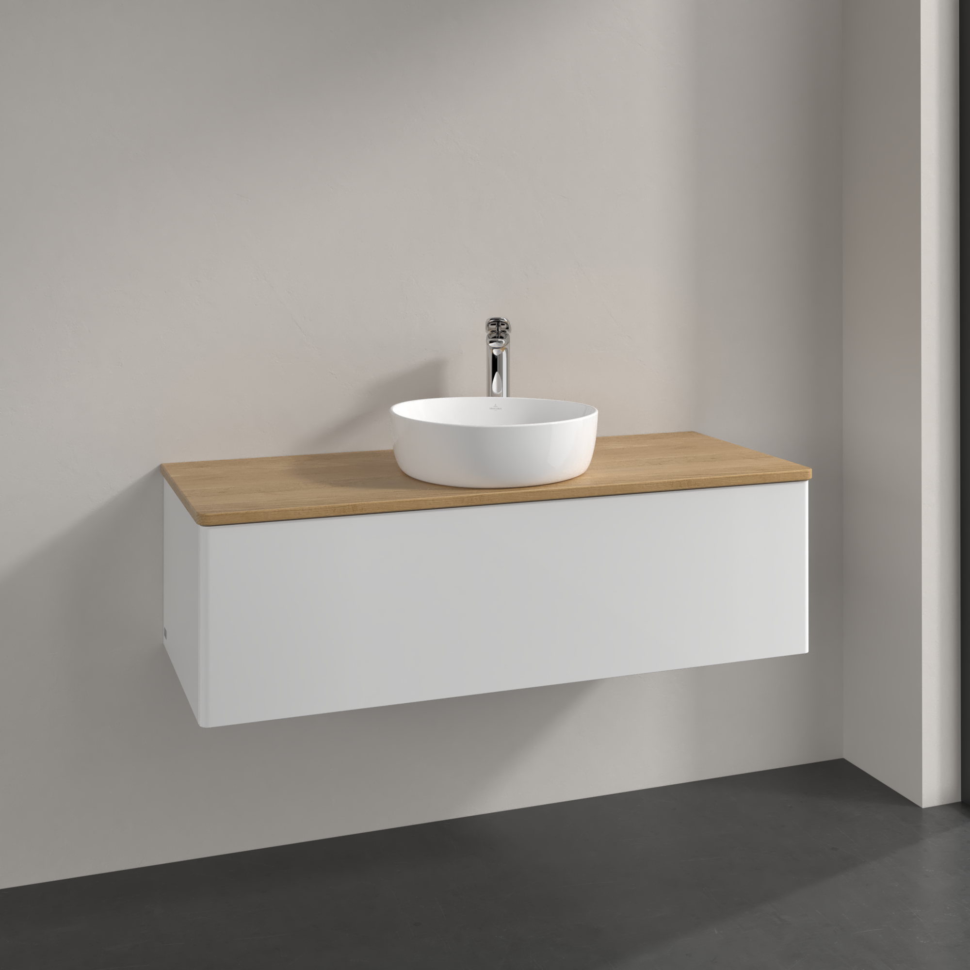 Antao Meuble sous plan, avec éclairage, 1 tiroir sur rails, 1200x360x500mm, Façade sans structure, Caisson: Glossy White Lacquer, Façade: Glossy White Lacquer, Plaque de recouvrement: Honey Oak