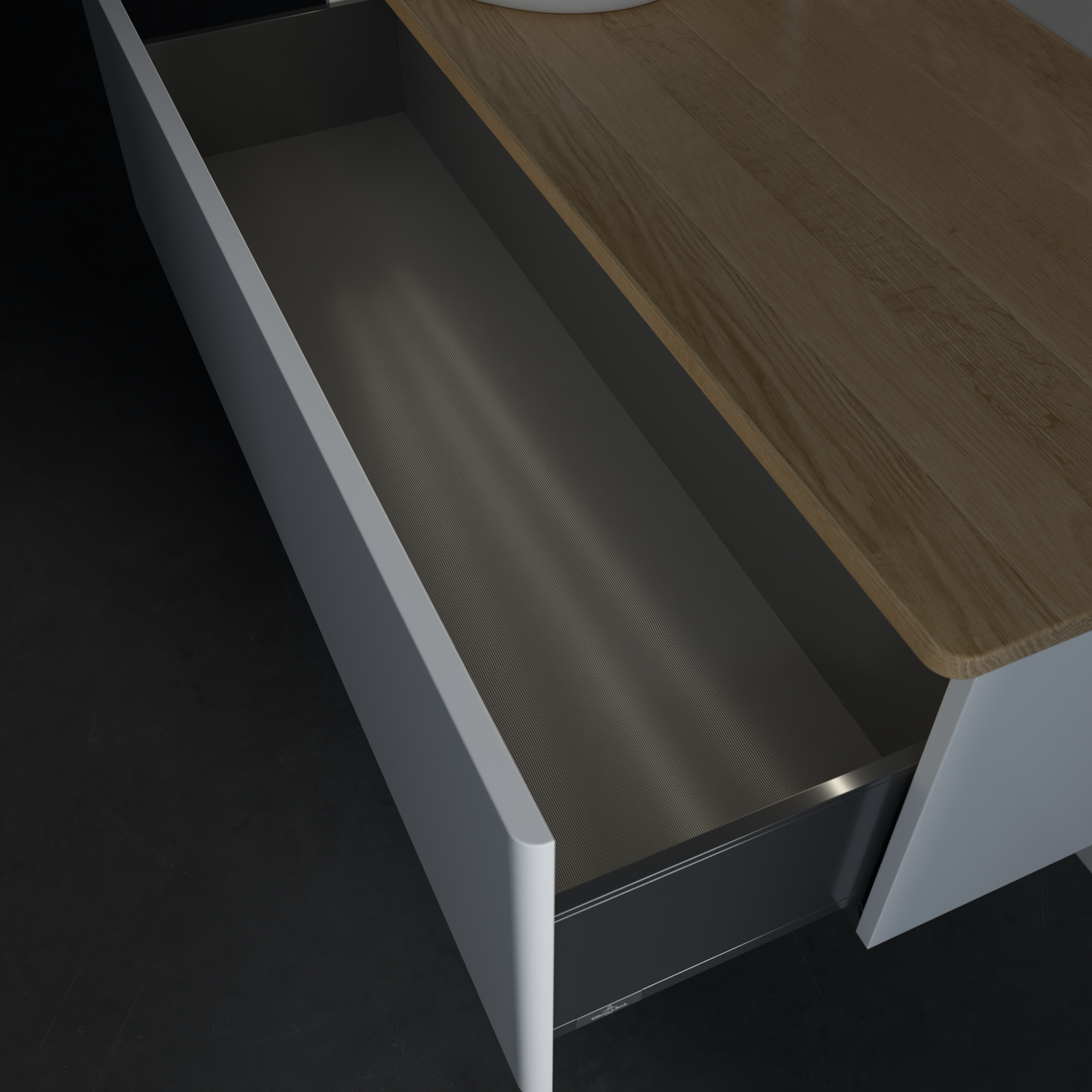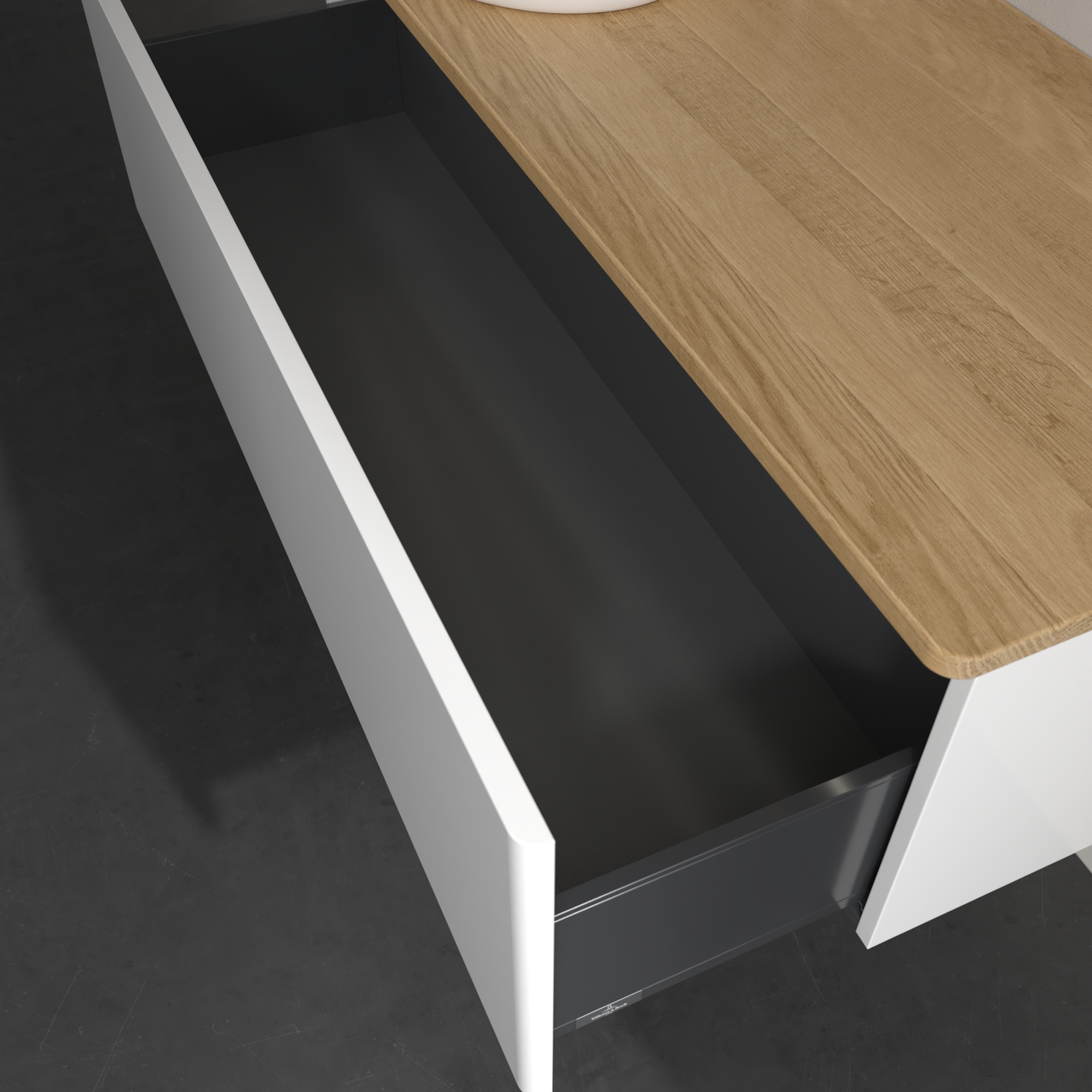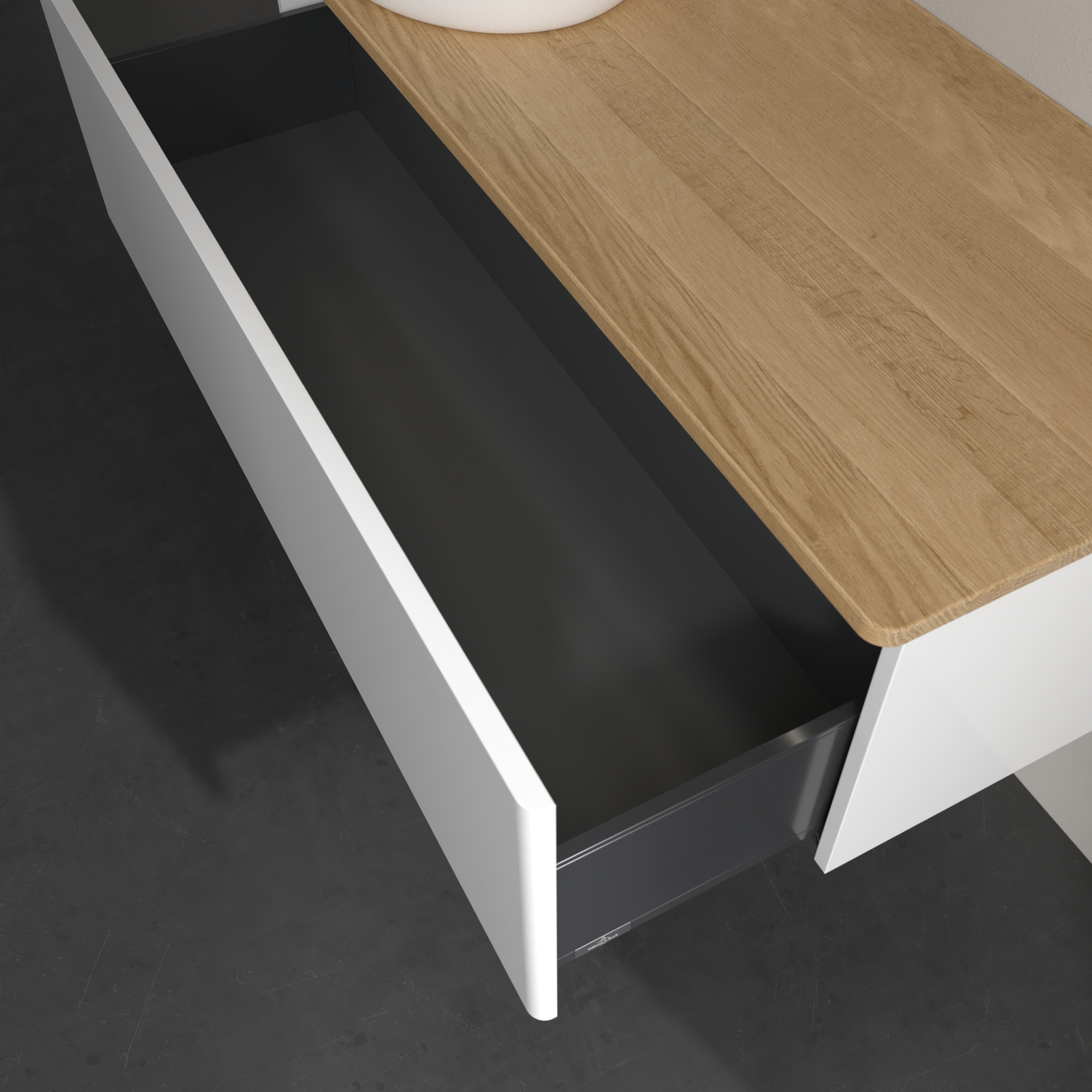 Antao Meuble sous plan, avec éclairage, 1 tiroir sur rails, 1200x360x500mm, Façade sans structure, Caisson: Glossy White Lacquer, Façade: Glossy White Lacquer, Plaque de recouvrement: Honey Oak