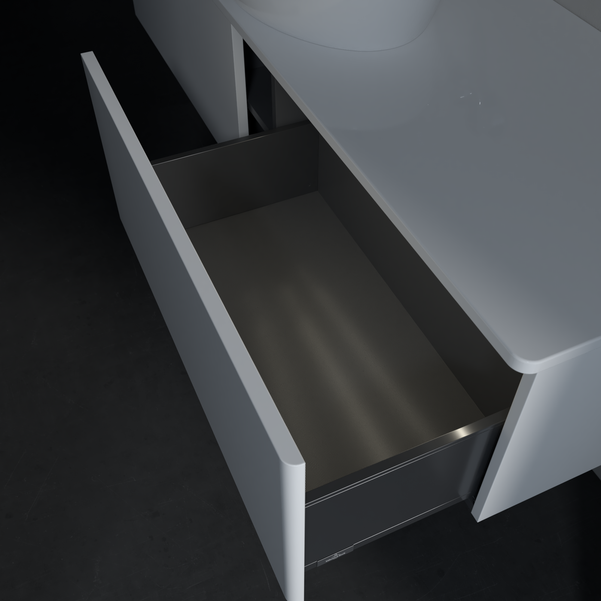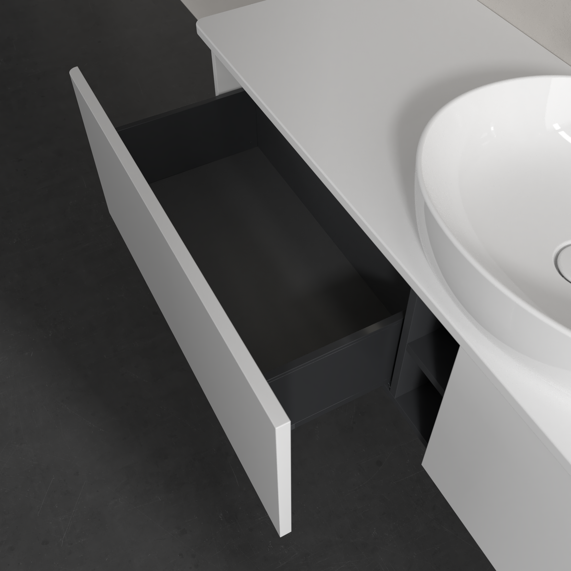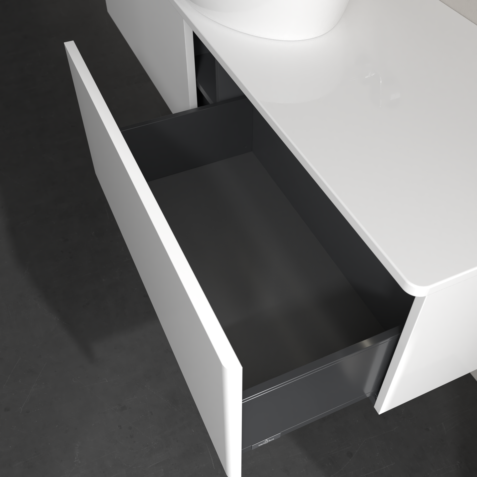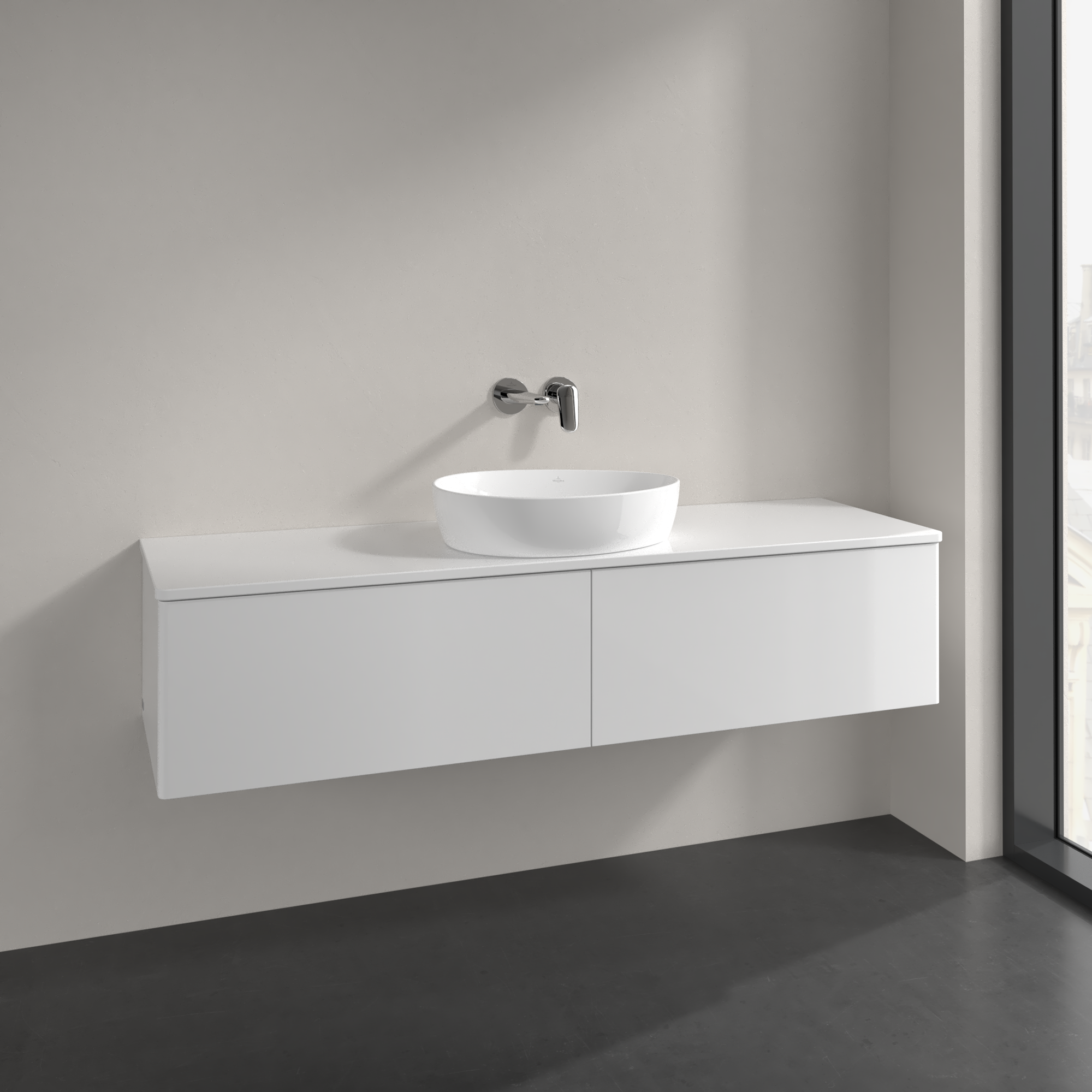 Antao Meuble sous plan, avec éclairage, 2 tiroirs sur rails, 1600x360x500mm, Façade sans structure, Caisson: Glossy White Lacquer, Façade: Glossy White Lacquer, Plaque de recouvrement: Glossy White Lacquer