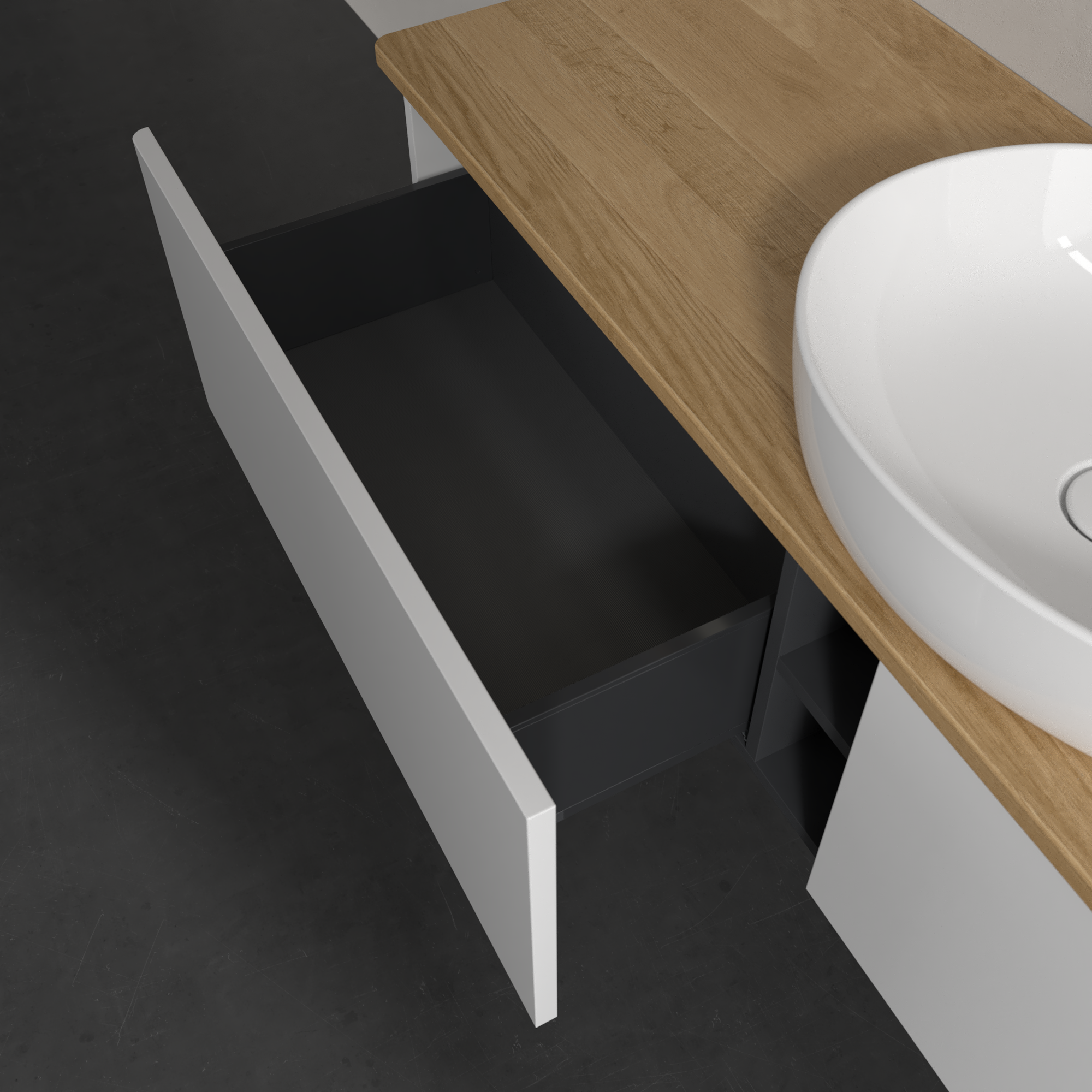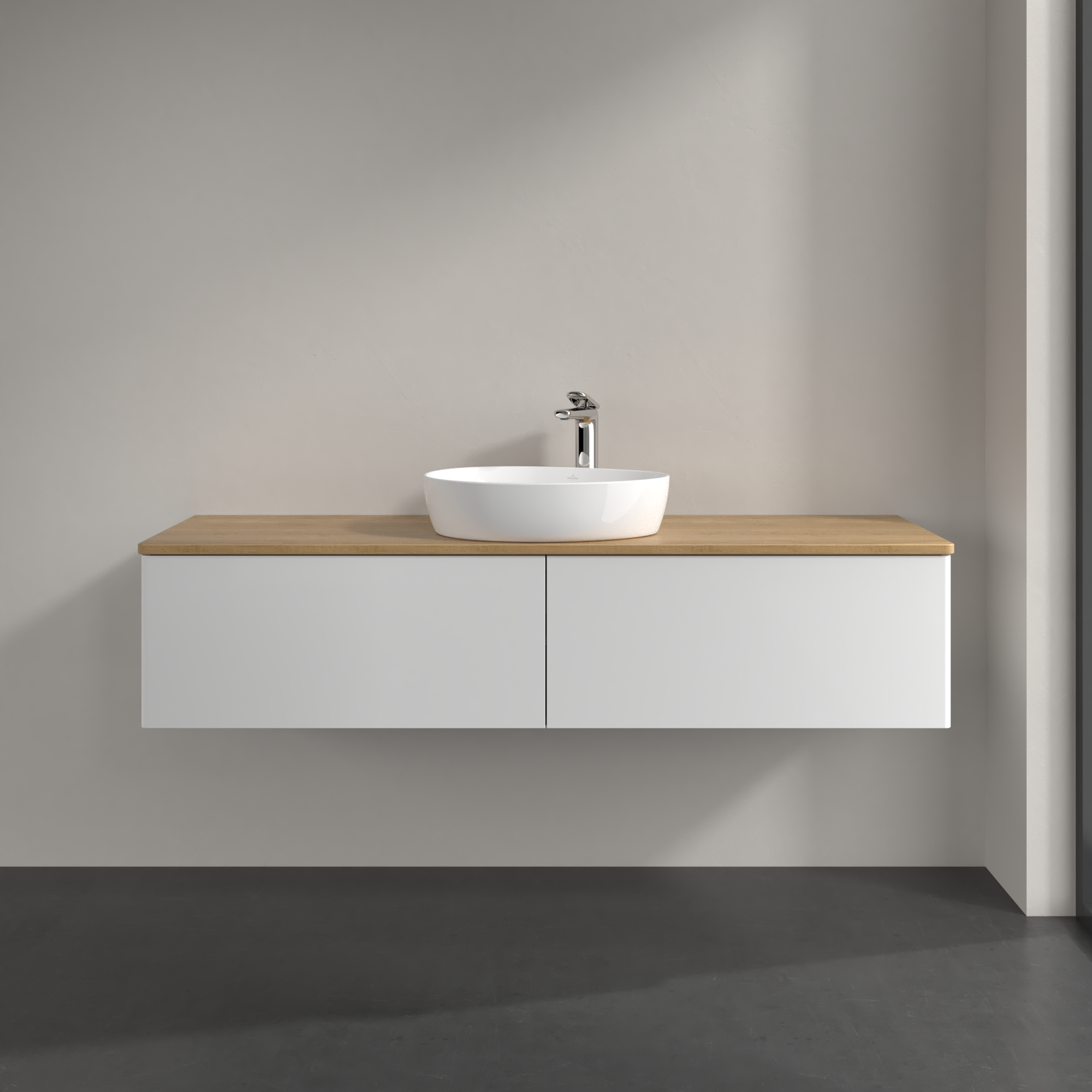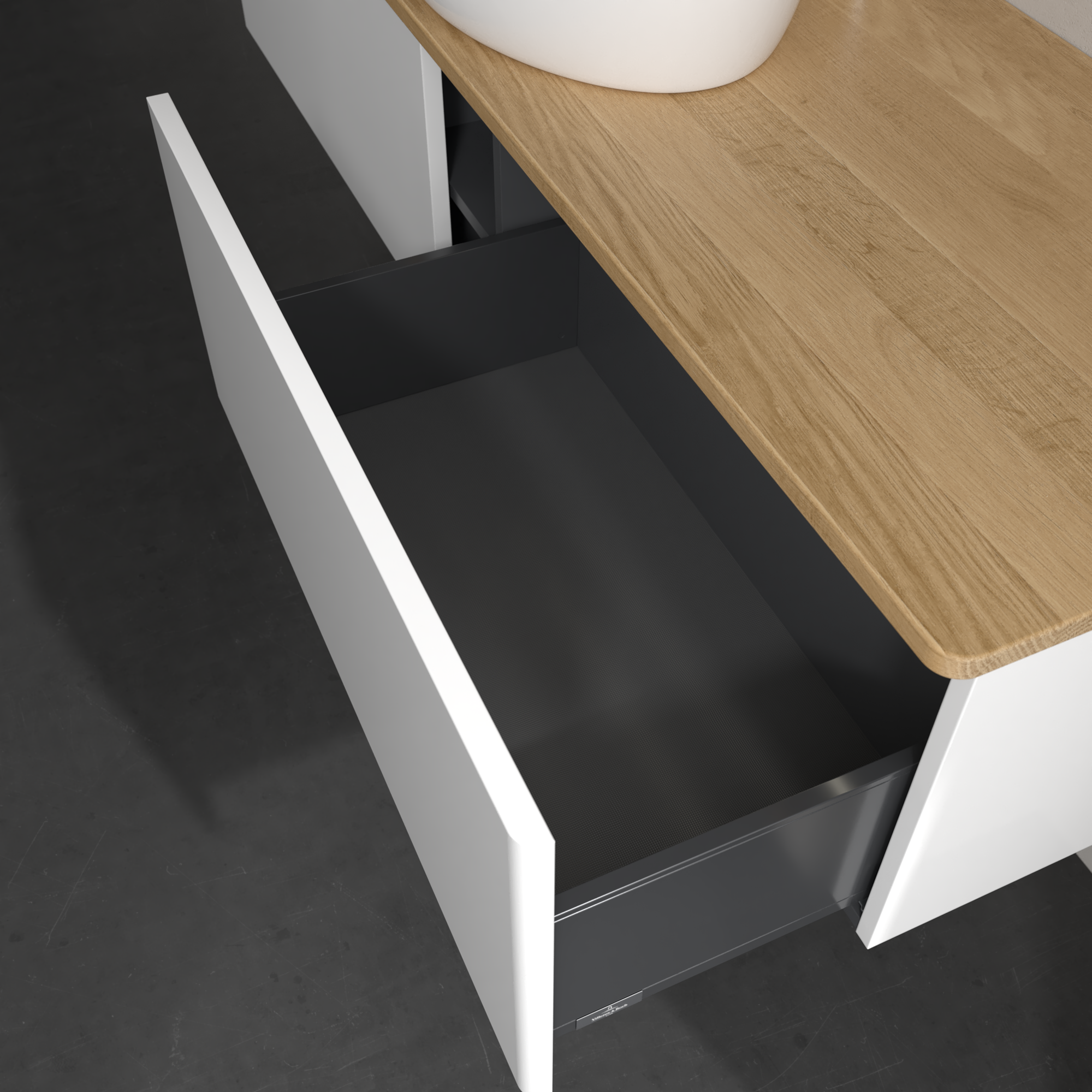 Antao Meuble sous plan, avec éclairage, 2 tiroirs sur rails, 1600x360x500mm, Façade sans structure, Caisson: Glossy White Lacquer, Façade: Glossy White Lacquer, Plaque de recouvrement: Honey Oak