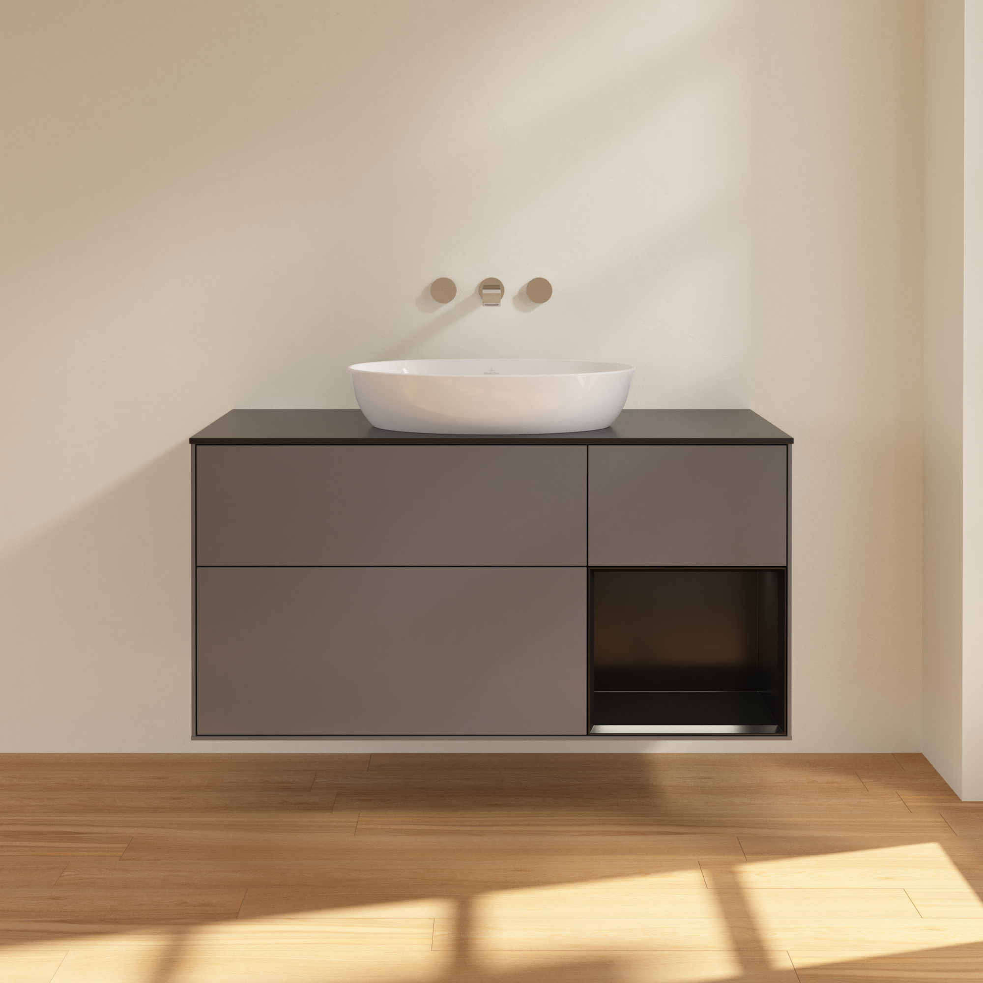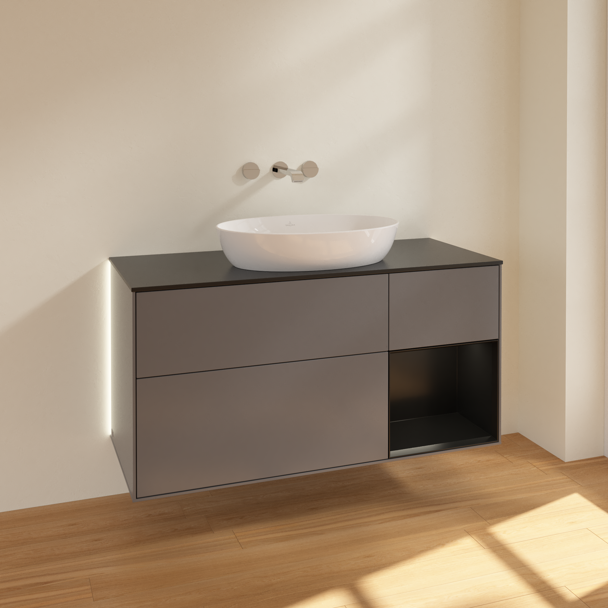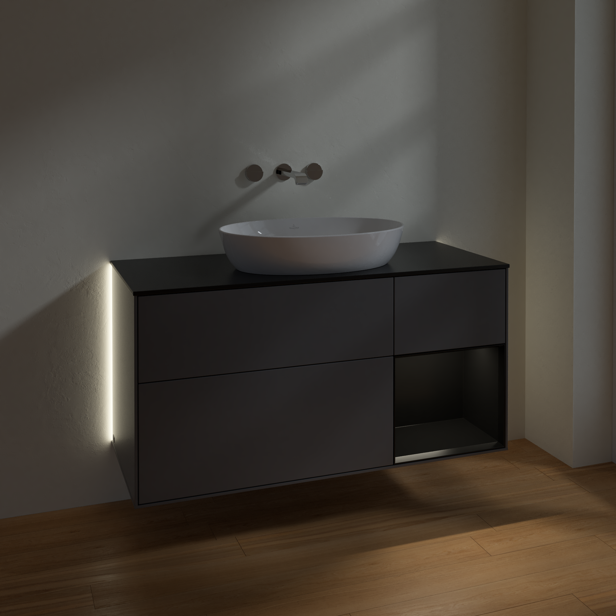 Finion Meuble sous plan, avec éclairage, 3 tiroirs sur rails, 1200x603x501mm, Caisson: Anthracite Matt Lacquer, Façade: Anthracite Matt Lacquer, Élément d’étagère: Black Matt Lacquer, Plaque de recouvrement: Glass Black Matt