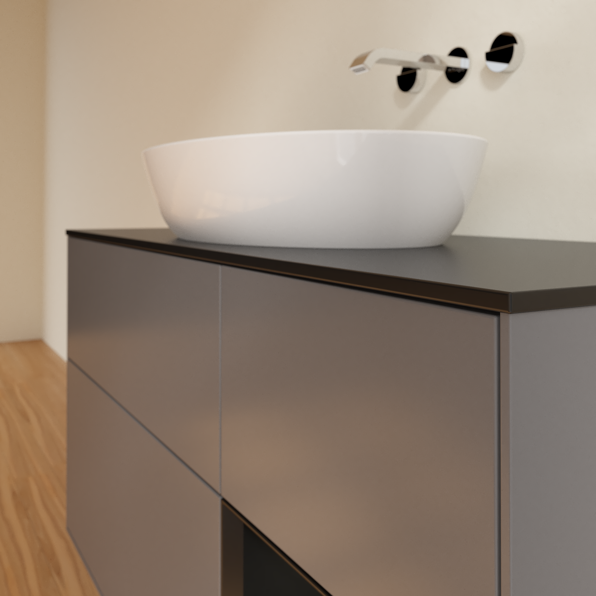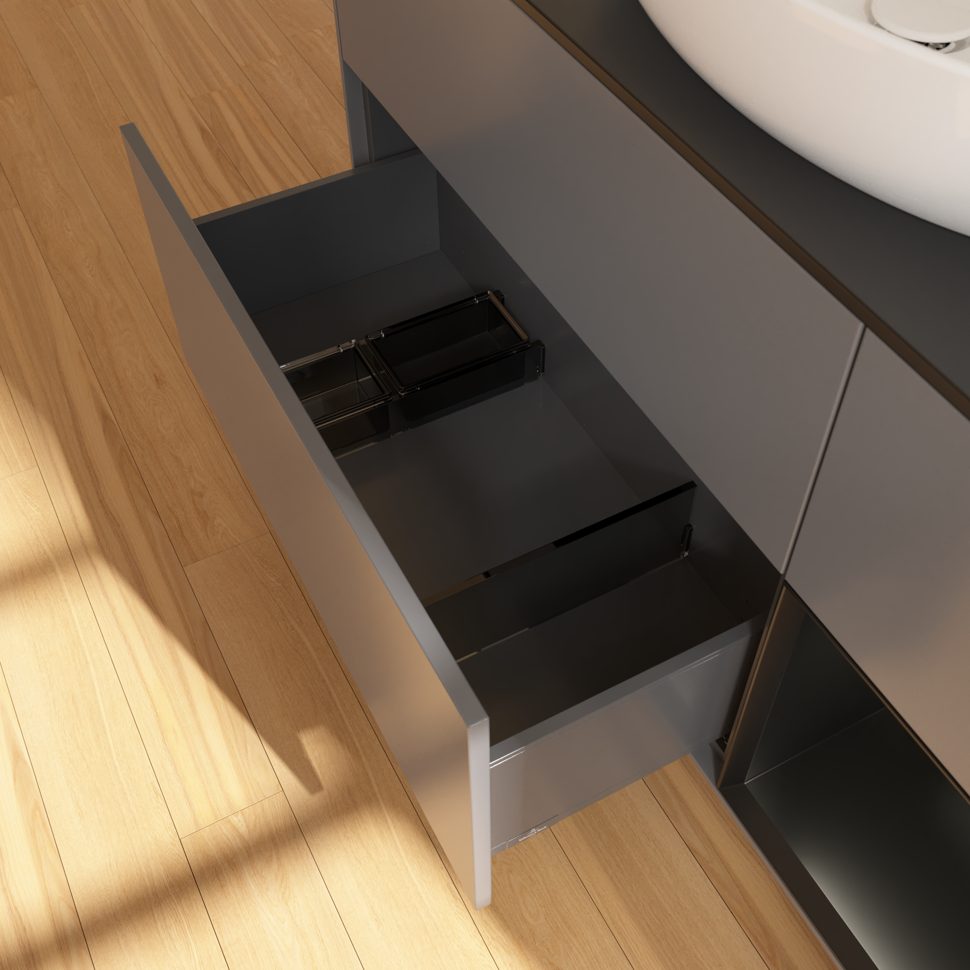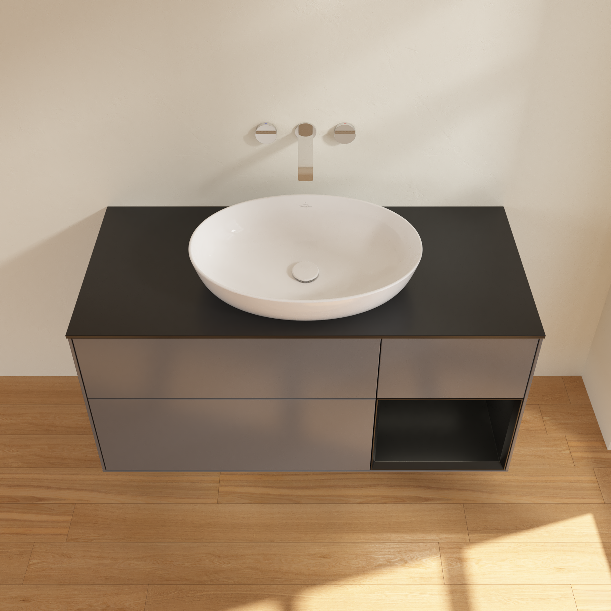 Finion Meuble sous plan, avec éclairage, 3 tiroirs sur rails, 1200x603x501mm, Caisson: Anthracite Matt Lacquer, Façade: Anthracite Matt Lacquer, Élément d’étagère: Black Matt Lacquer, Plaque de recouvrement: Glass Black Matt