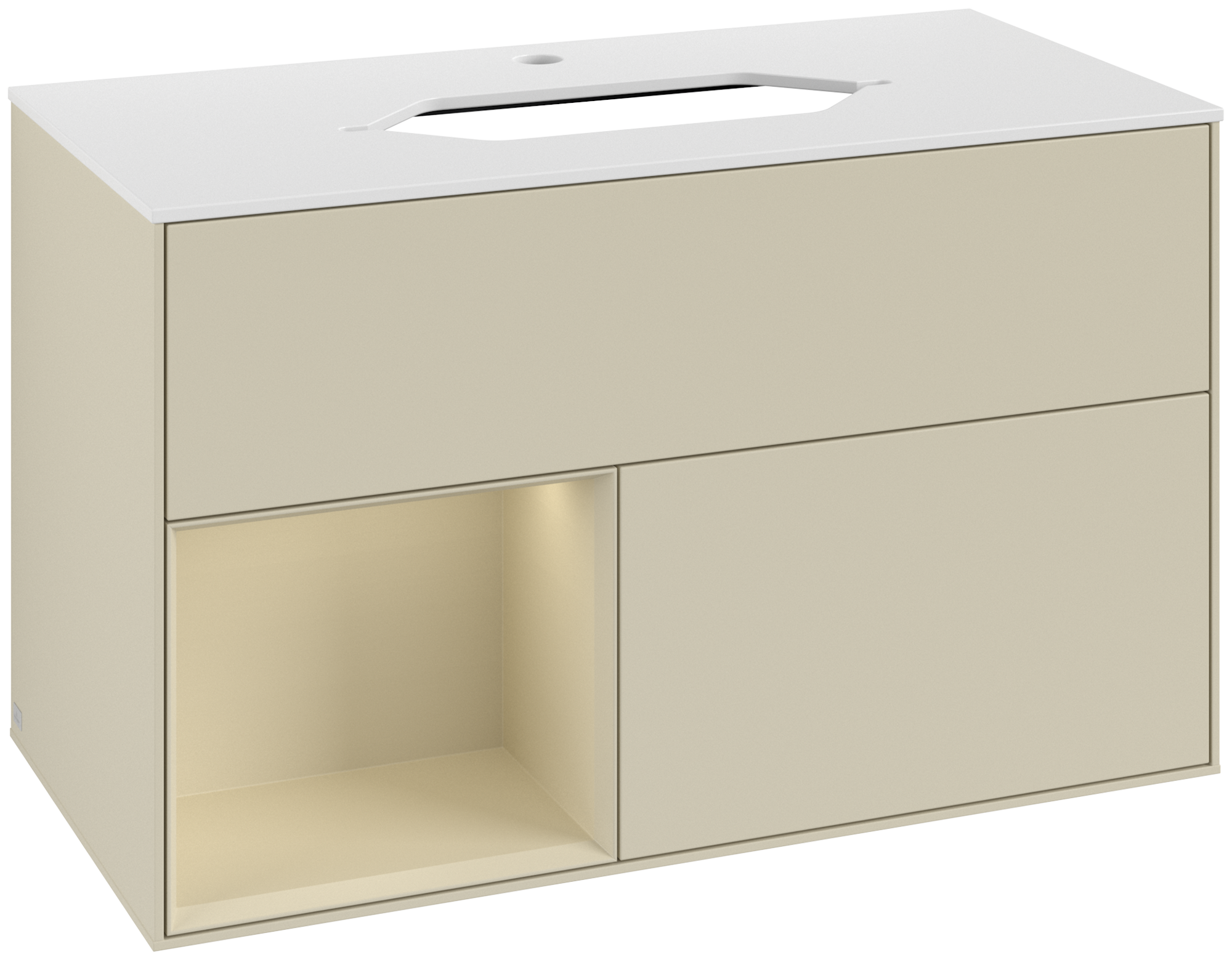 Finion Meuble sous plan, avec éclairage, 2 tiroirs sur rails, 1000x603x501mm, Caisson: Silk Grey Matt Lacquer, Façade: Silk Grey Matt Lacquer, Élément d’étagère: Silk Grey Matt Lacquer, Plaque de recouvrement: Glass White Matt