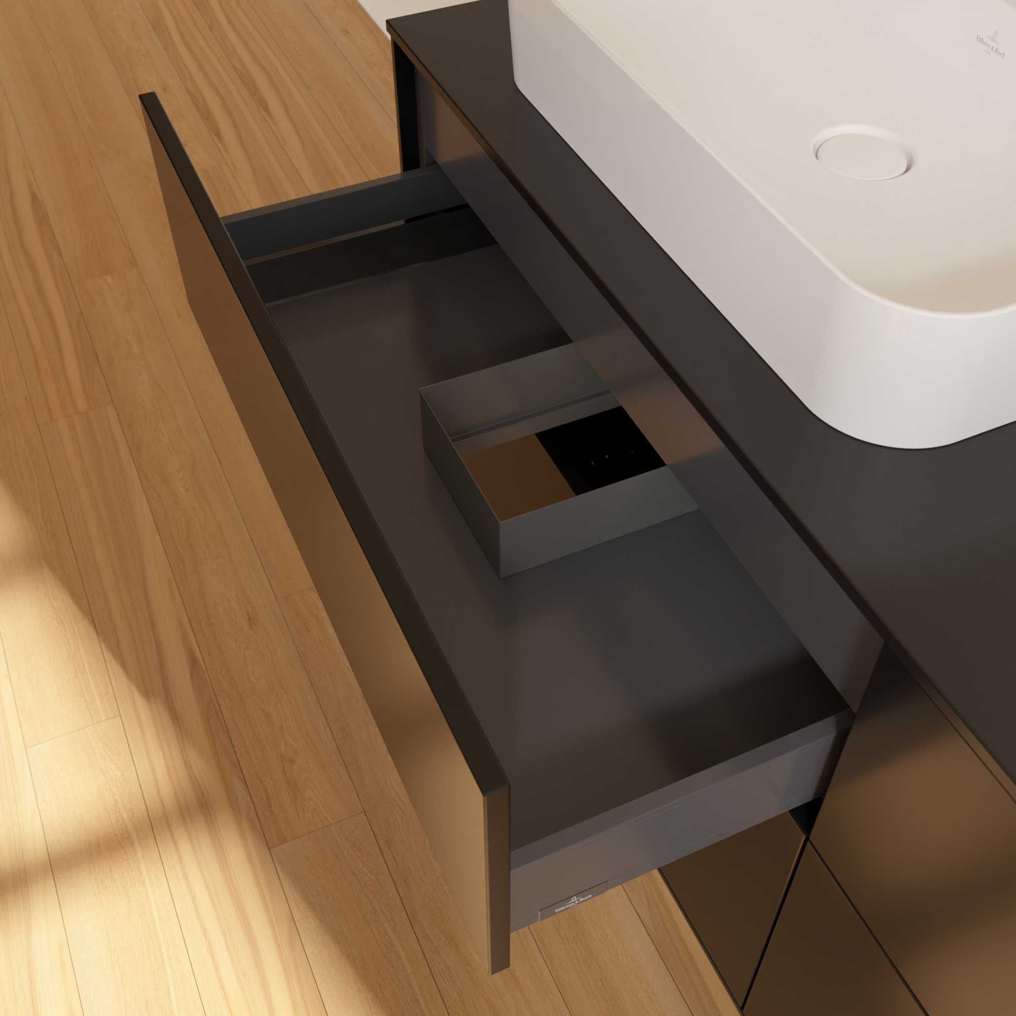 Finion Meuble sous plan, 4 tiroirs sur rails, 1600x603x501mm, Caisson: Black Matt Lacquer, Façade: Black Matt Lacquer, Plaque de recouvrement: Glass Black Matt