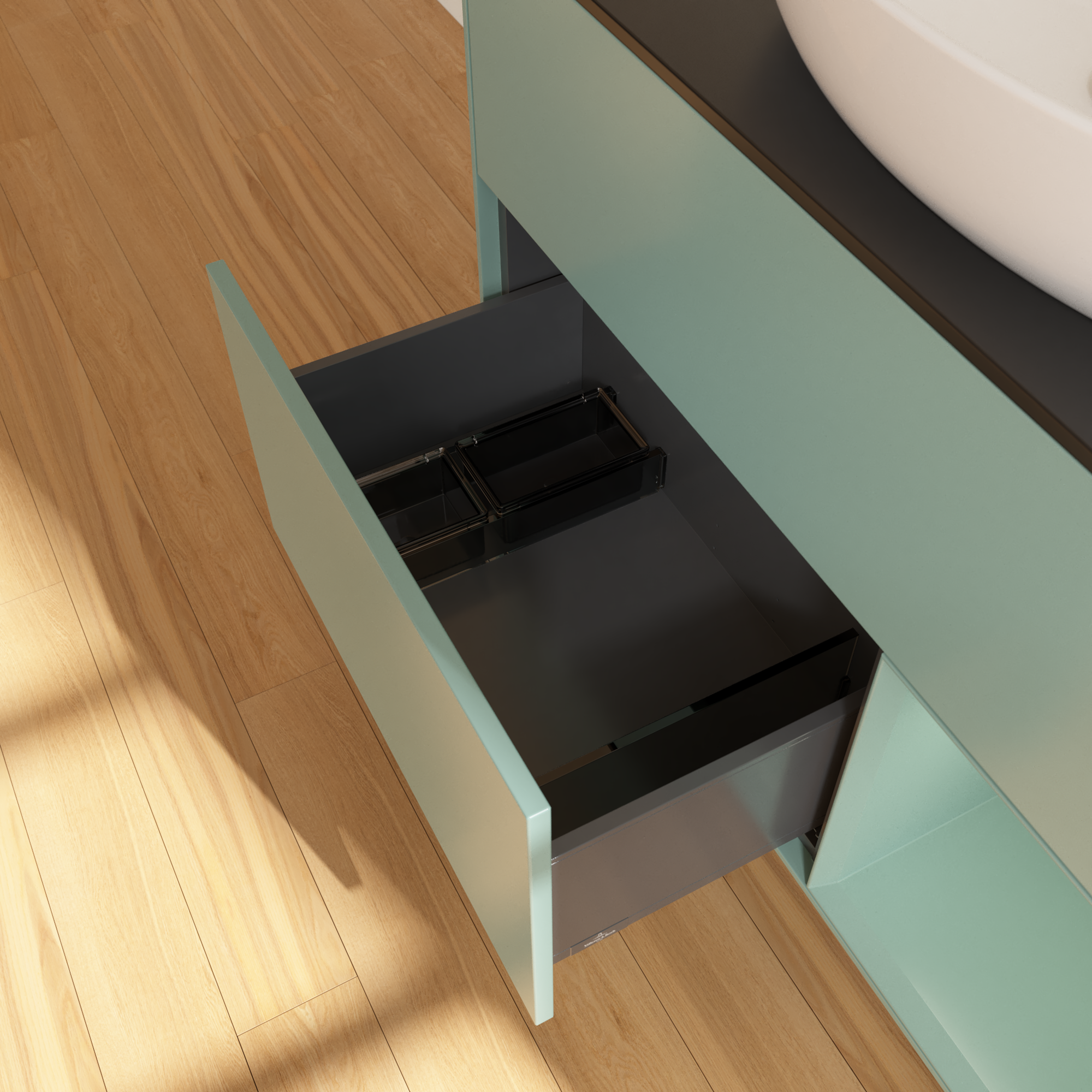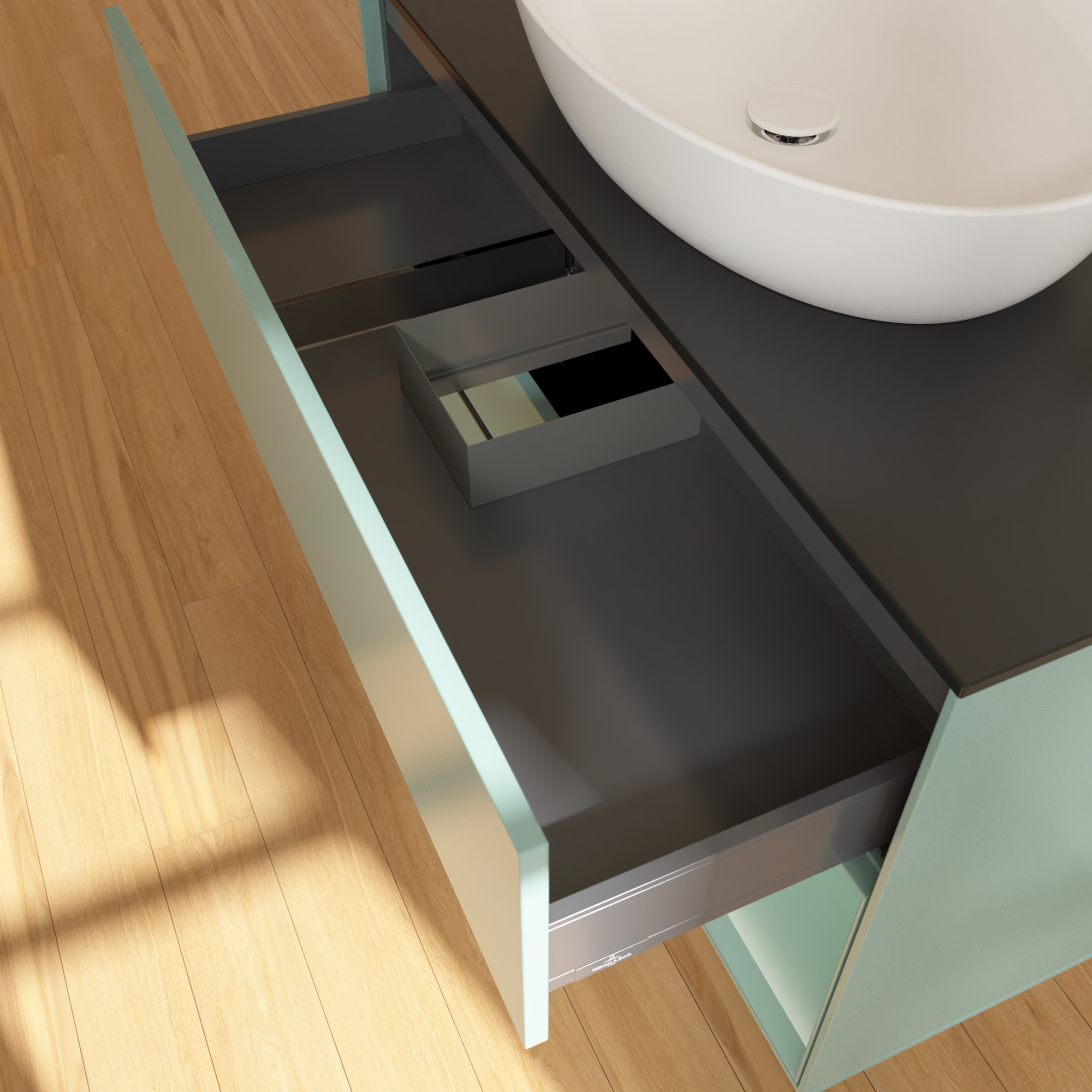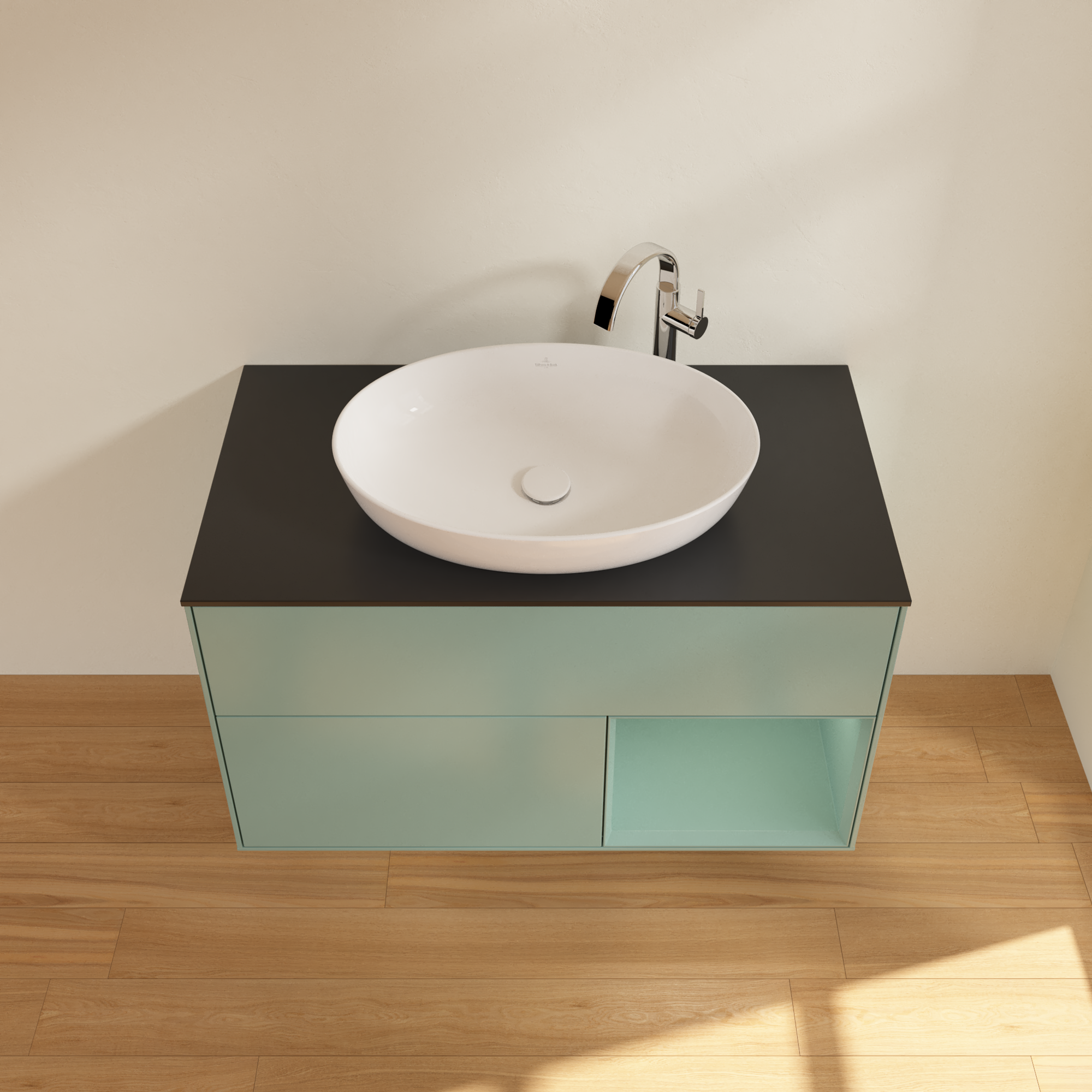 Finion Meuble sous plan, avec éclairage, 2 tiroirs sur rails, 1000x603x501mm, Caisson: Olive Matt Lacquer, Façade: Olive Matt Lacquer, Élément d’étagère: Olive Matt Lacquer, Plaque de recouvrement: Glass Black Matt