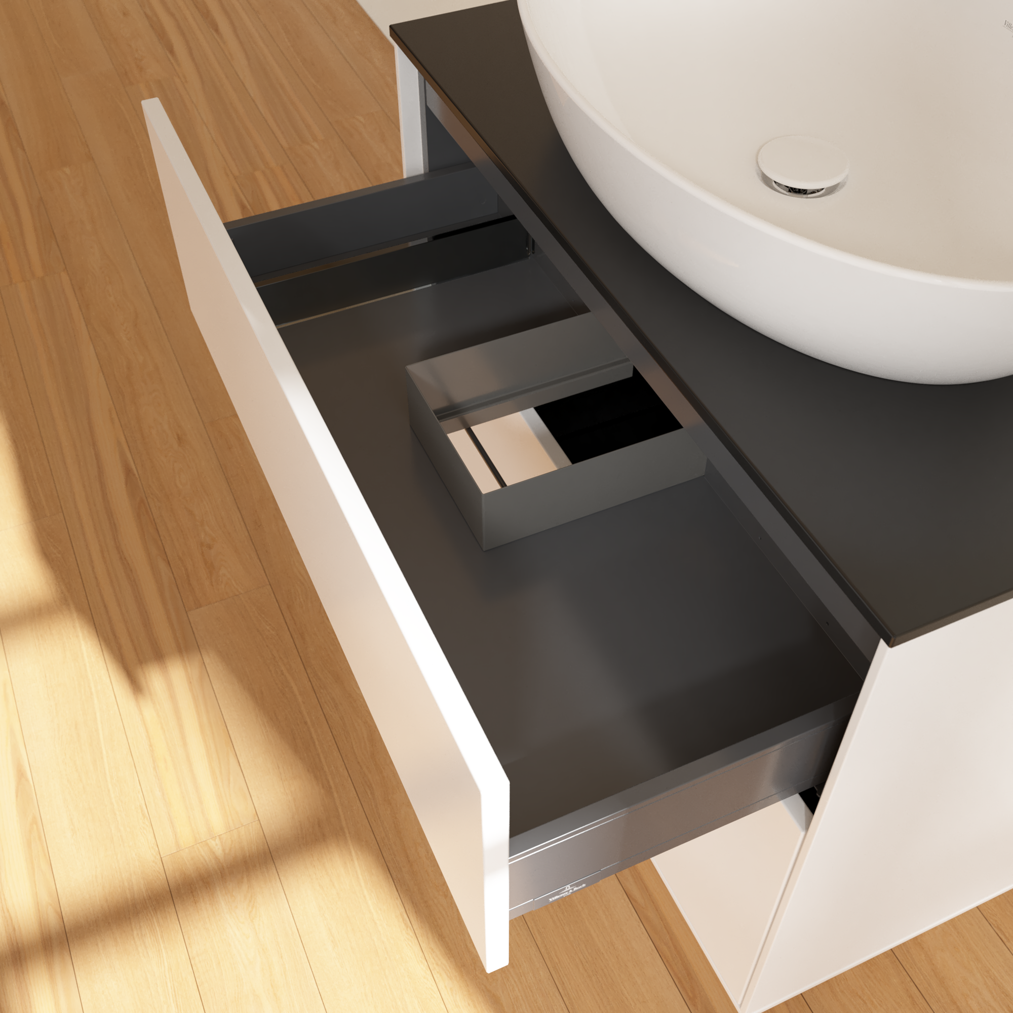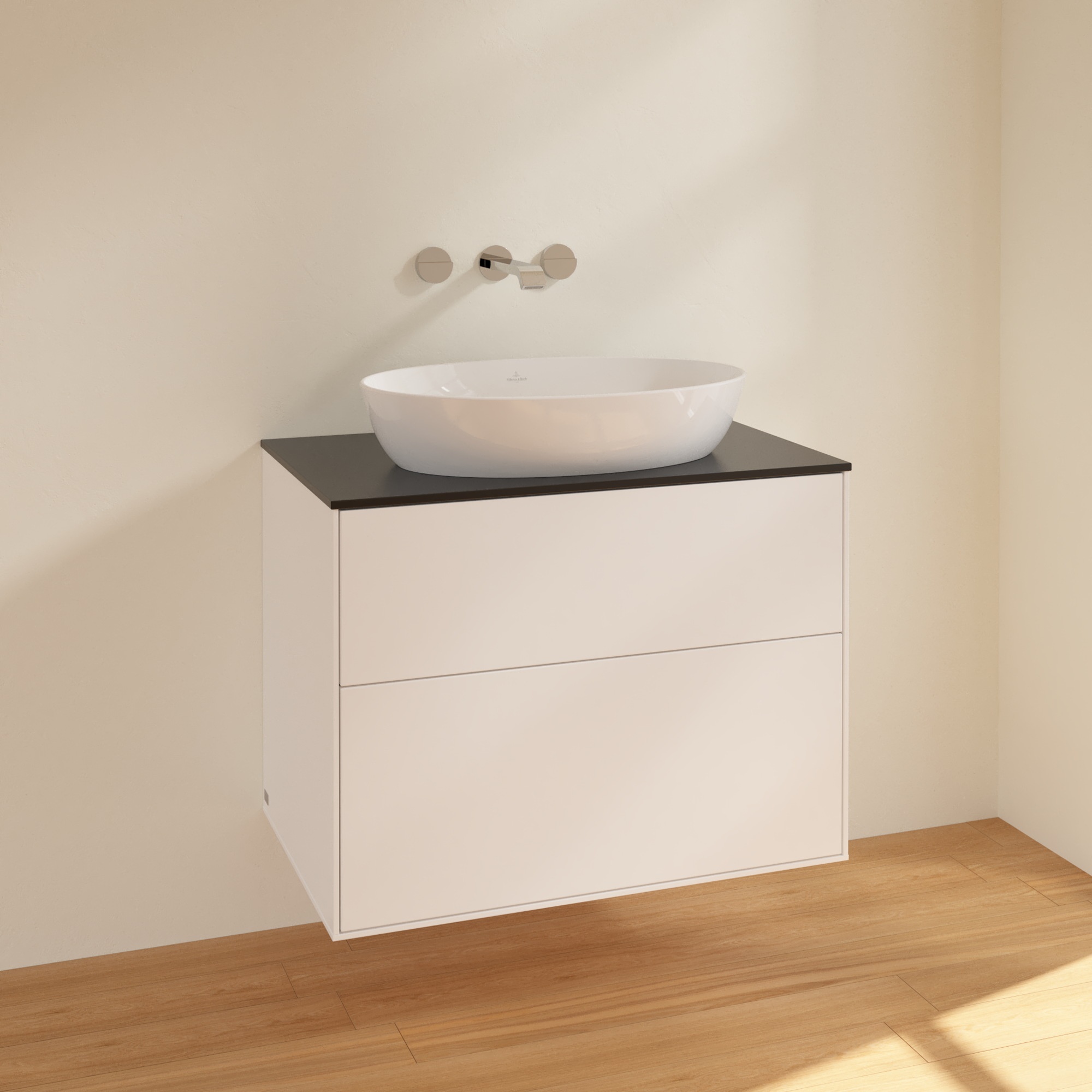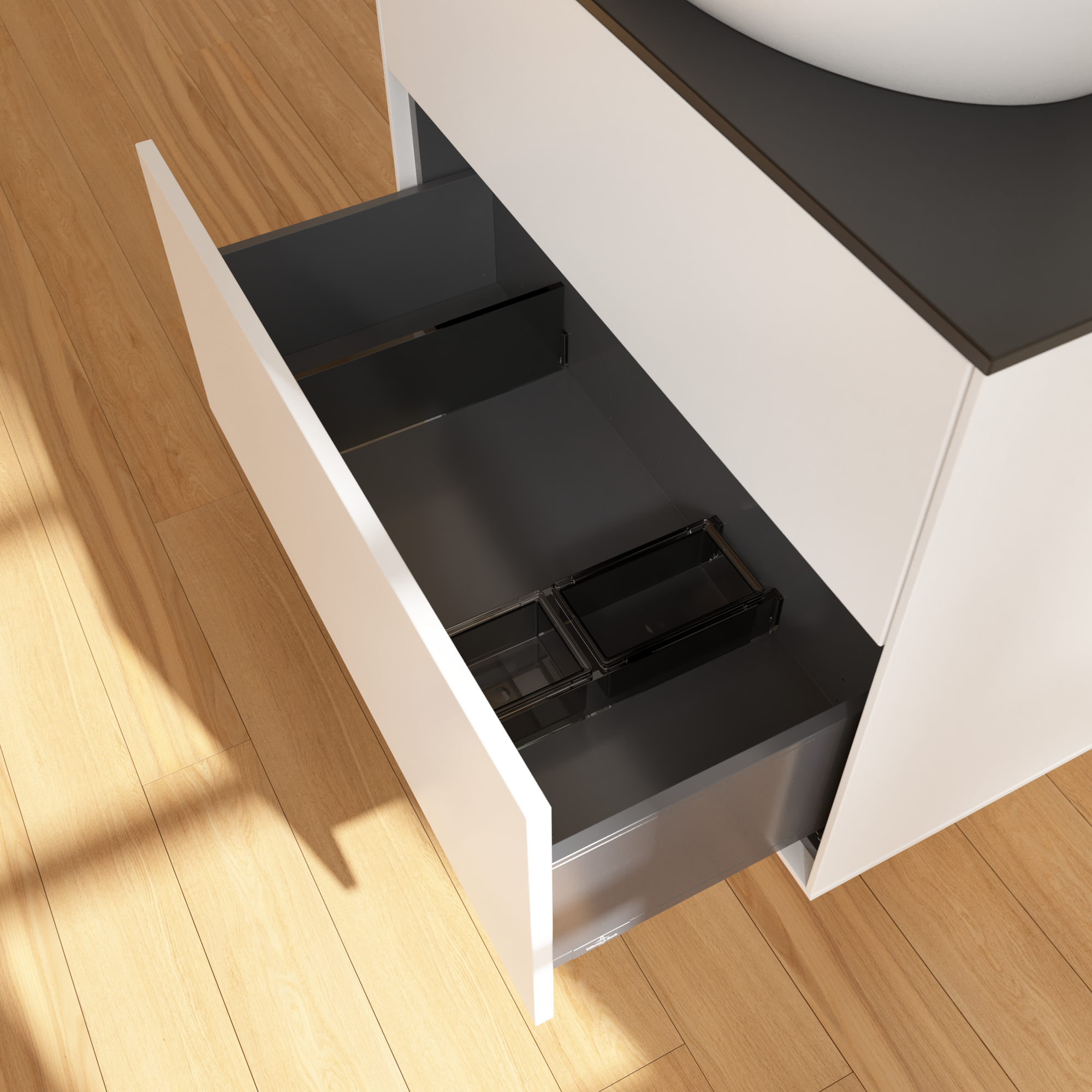 Finion Meuble sous plan, 2 tiroirs sur rails, 800x603x501mm, Caisson: White Matt Lacquer, Façade: White Matt Lacquer, Plaque de recouvrement: Glass Black Matt