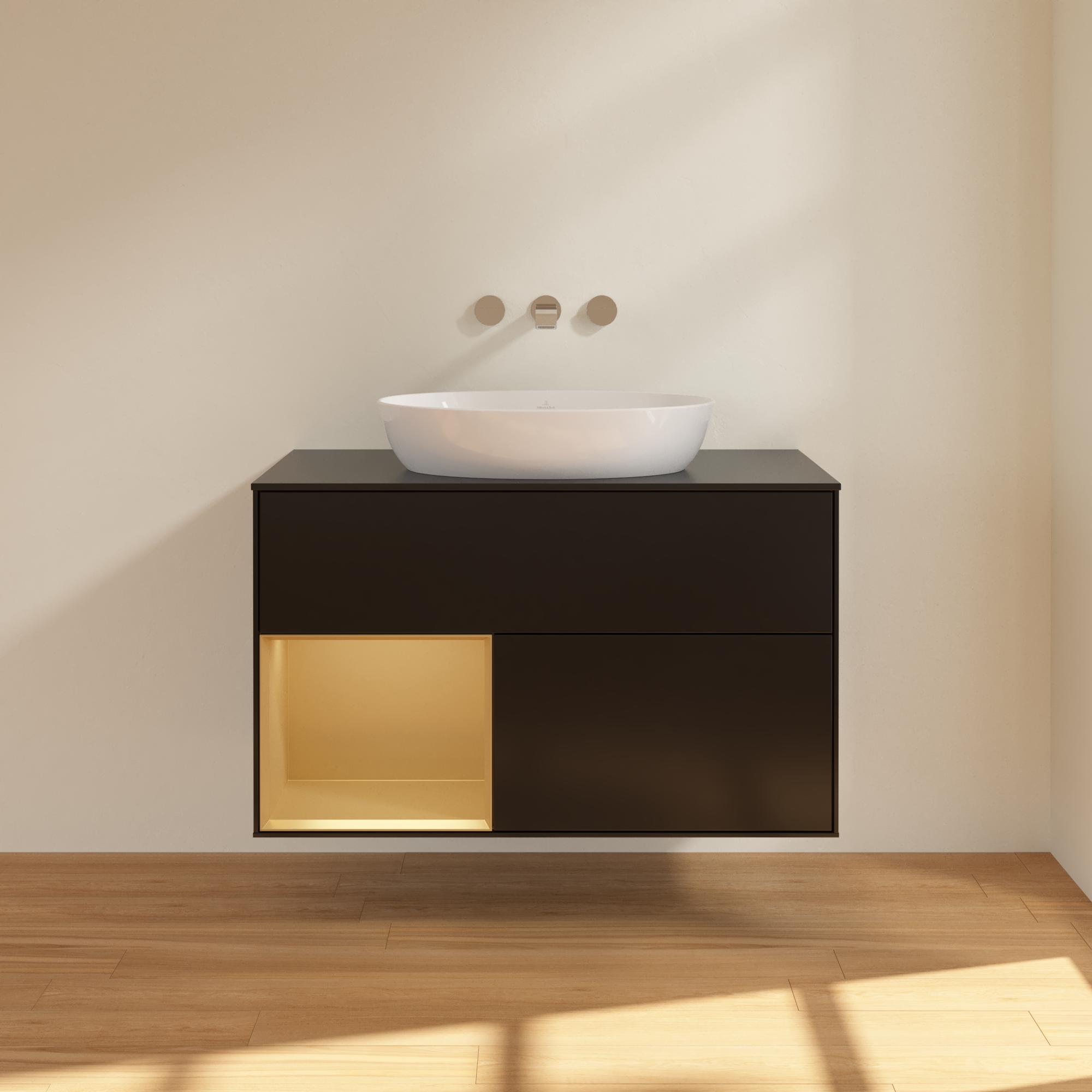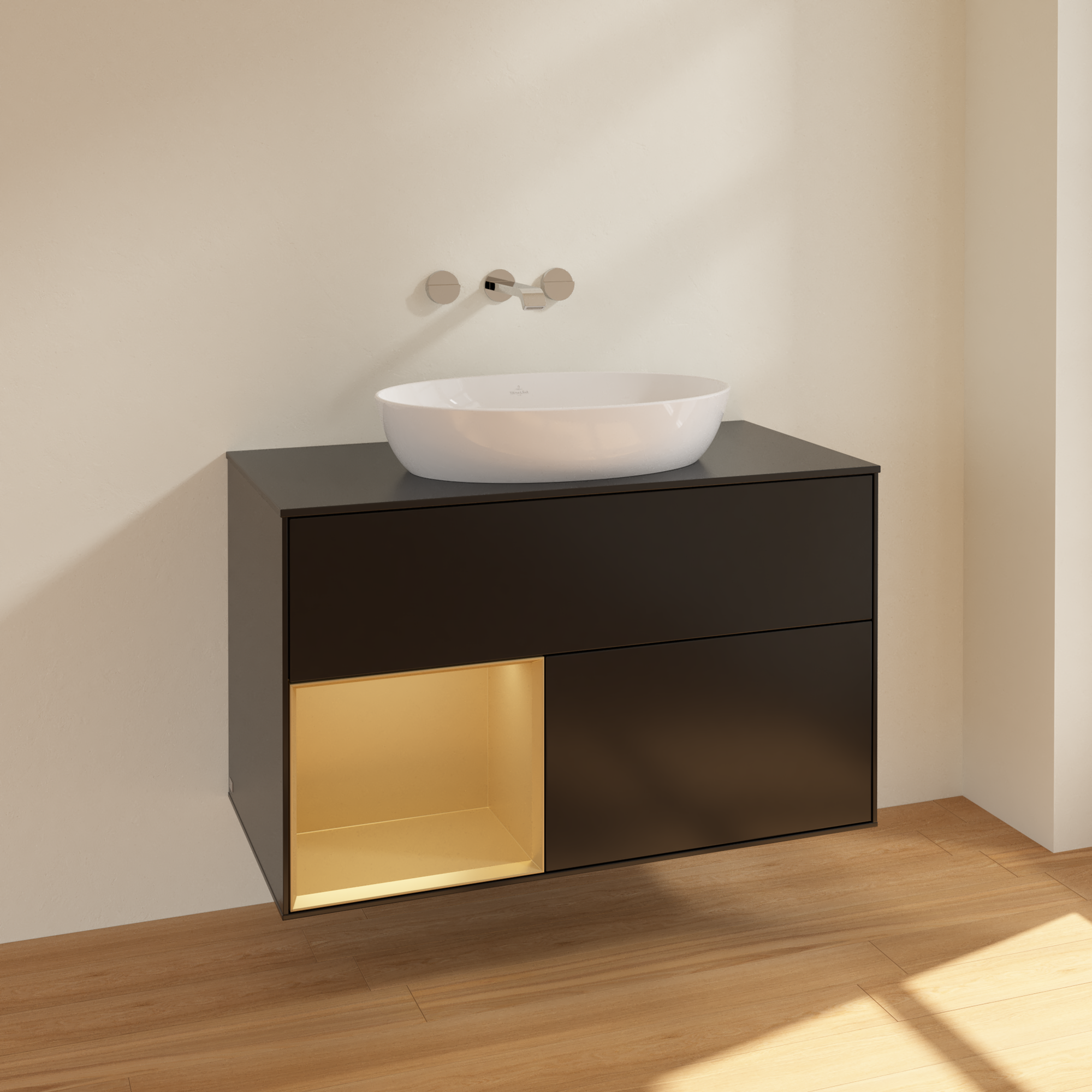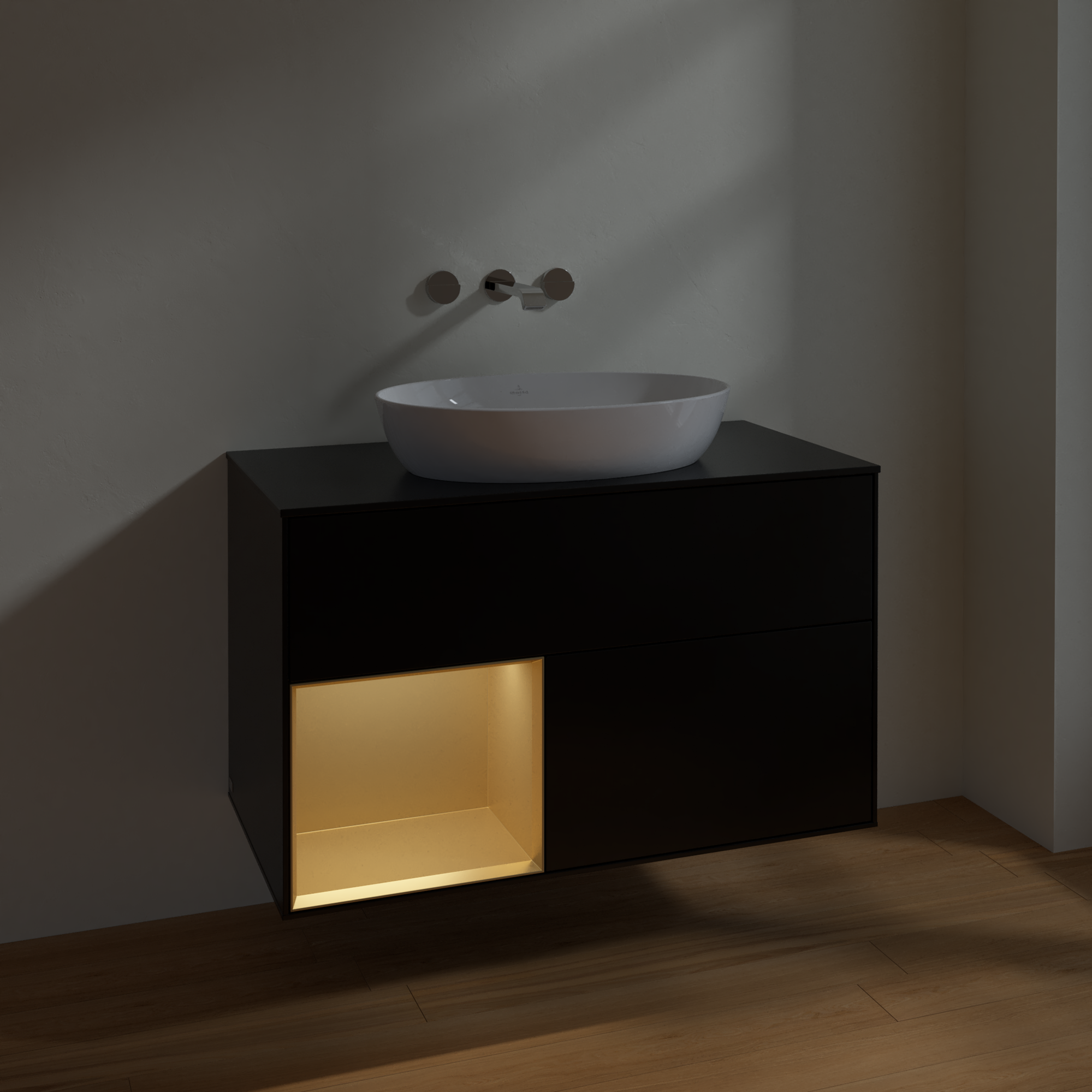 Finion Meuble sous plan, avec éclairage, 2 tiroirs sur rails, 1000x603x501mm, Caisson: Black Matt Lacquer, Façade: Black Matt Lacquer, Élément d’étagère: Gold Matt Lacquer, Plaque de recouvrement: Glass Black Matt