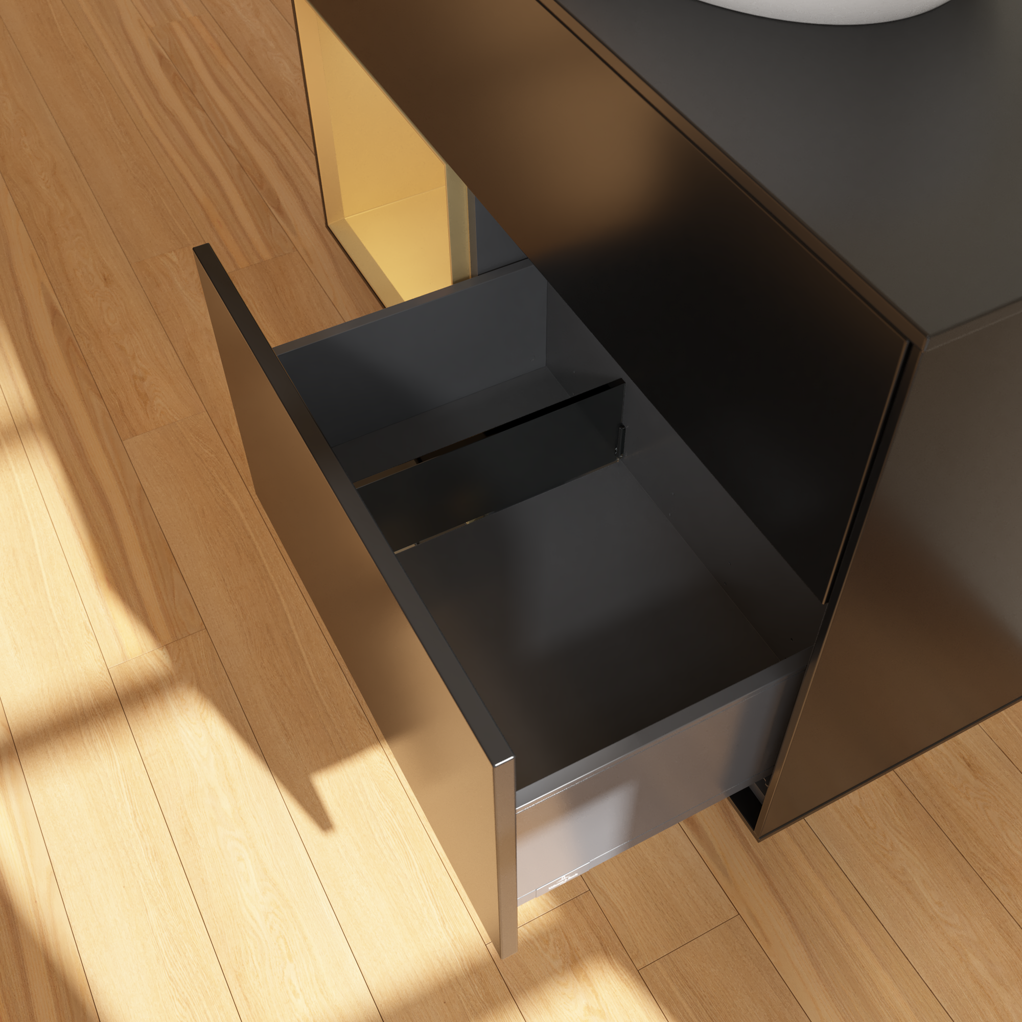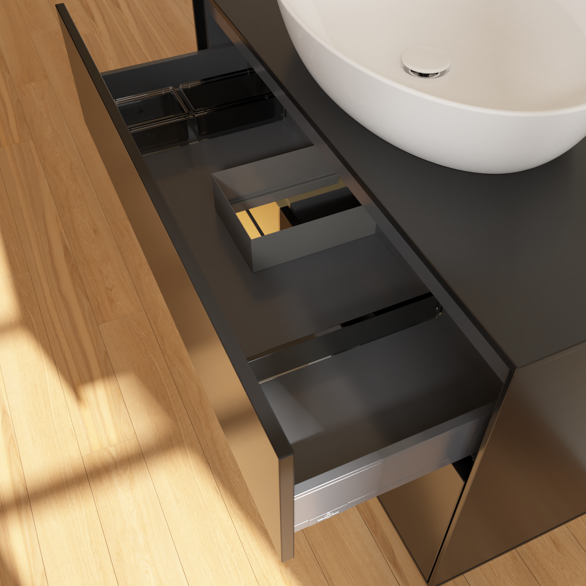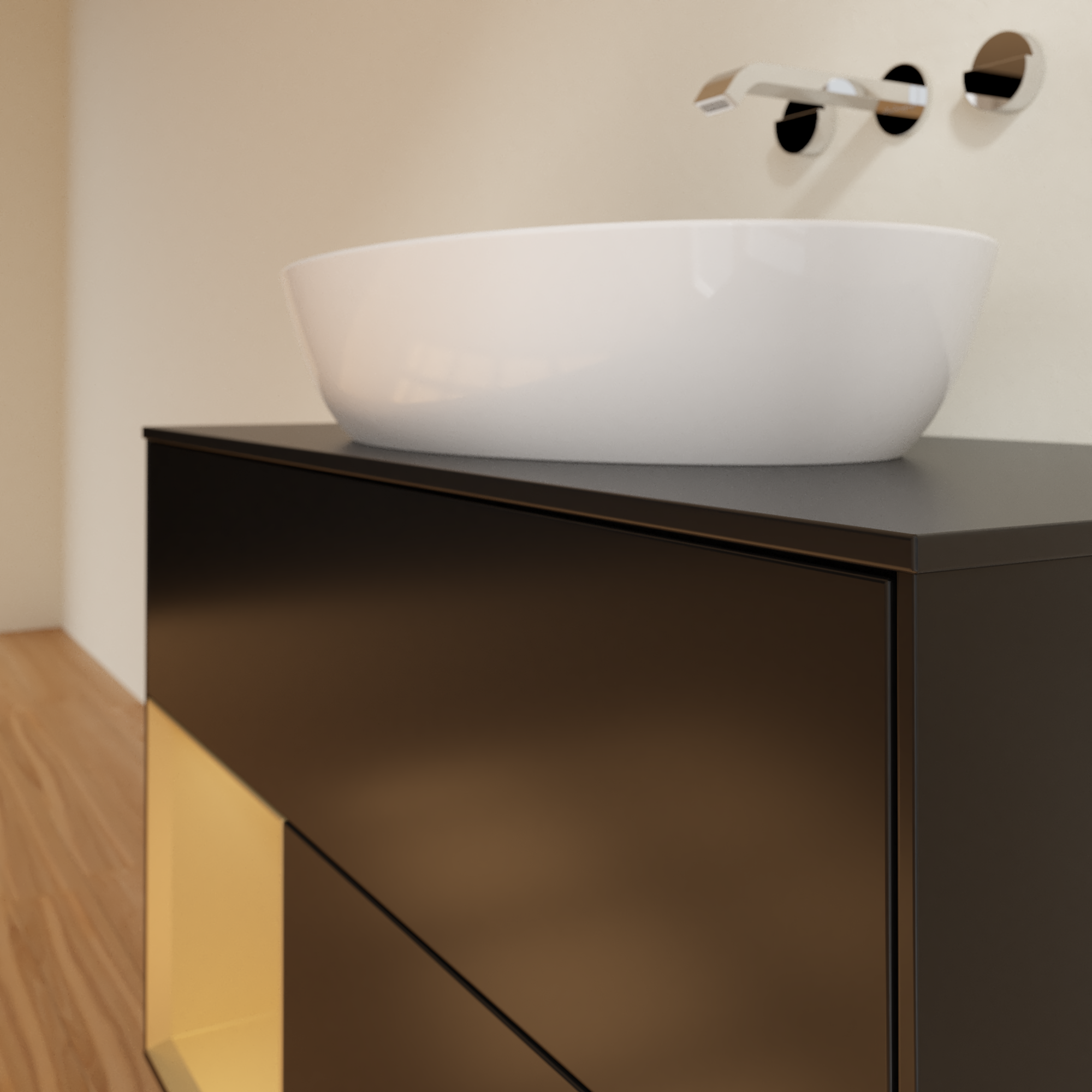Finion Meuble sous plan, avec éclairage, 2 tiroirs sur rails, 1000x603x501mm, Caisson: Black Matt Lacquer, Façade: Black Matt Lacquer, Élément d’étagère: Gold Matt Lacquer, Plaque de recouvrement: Glass Black Matt