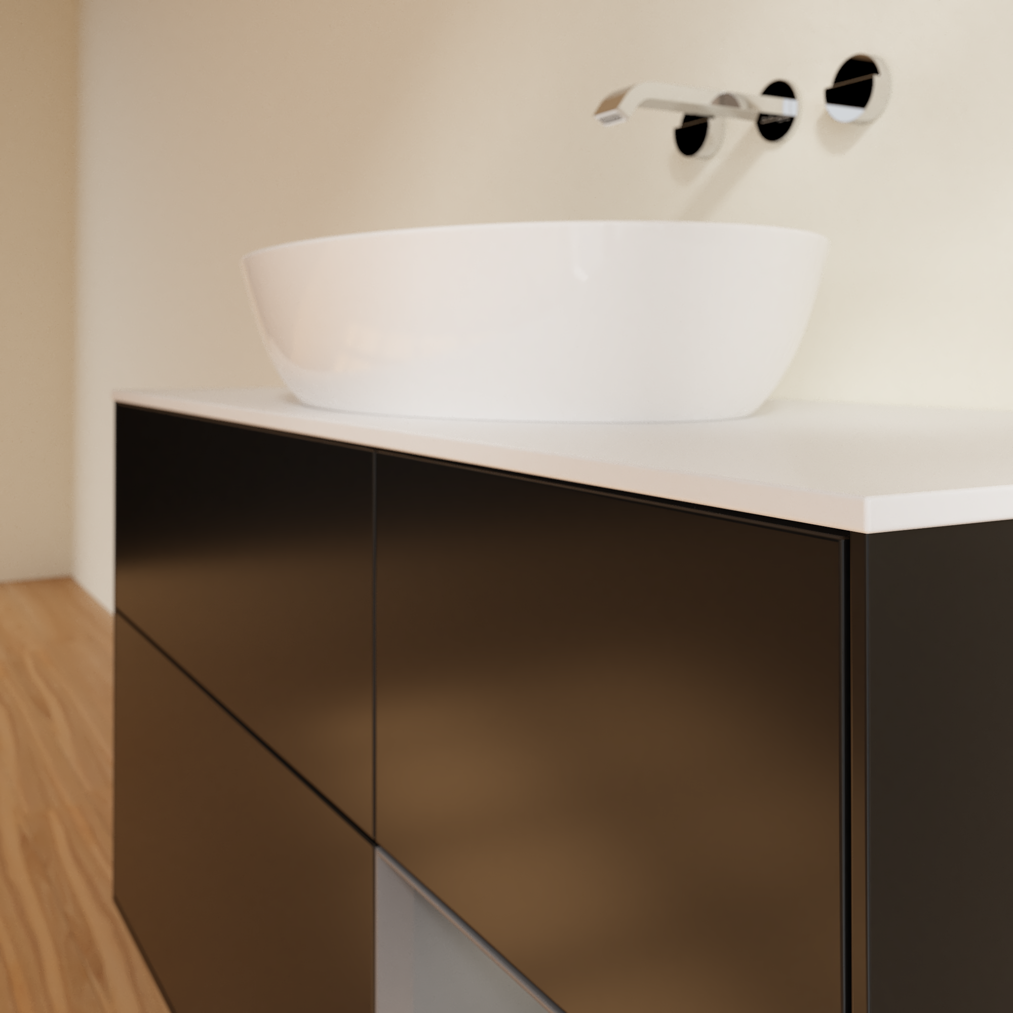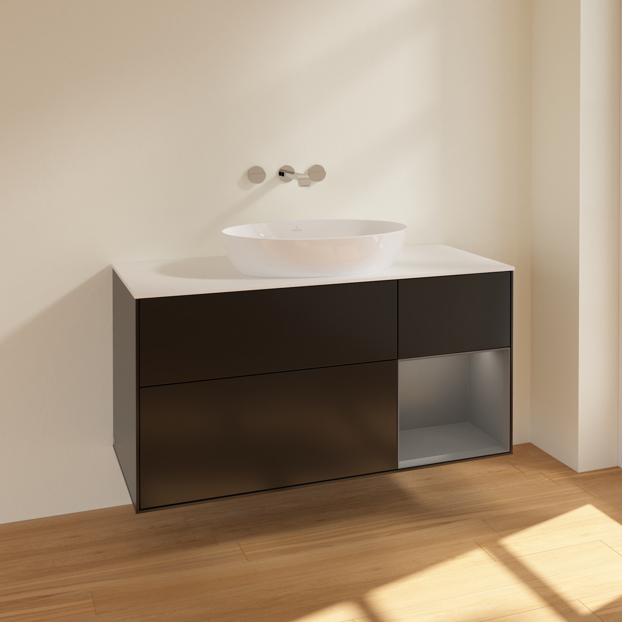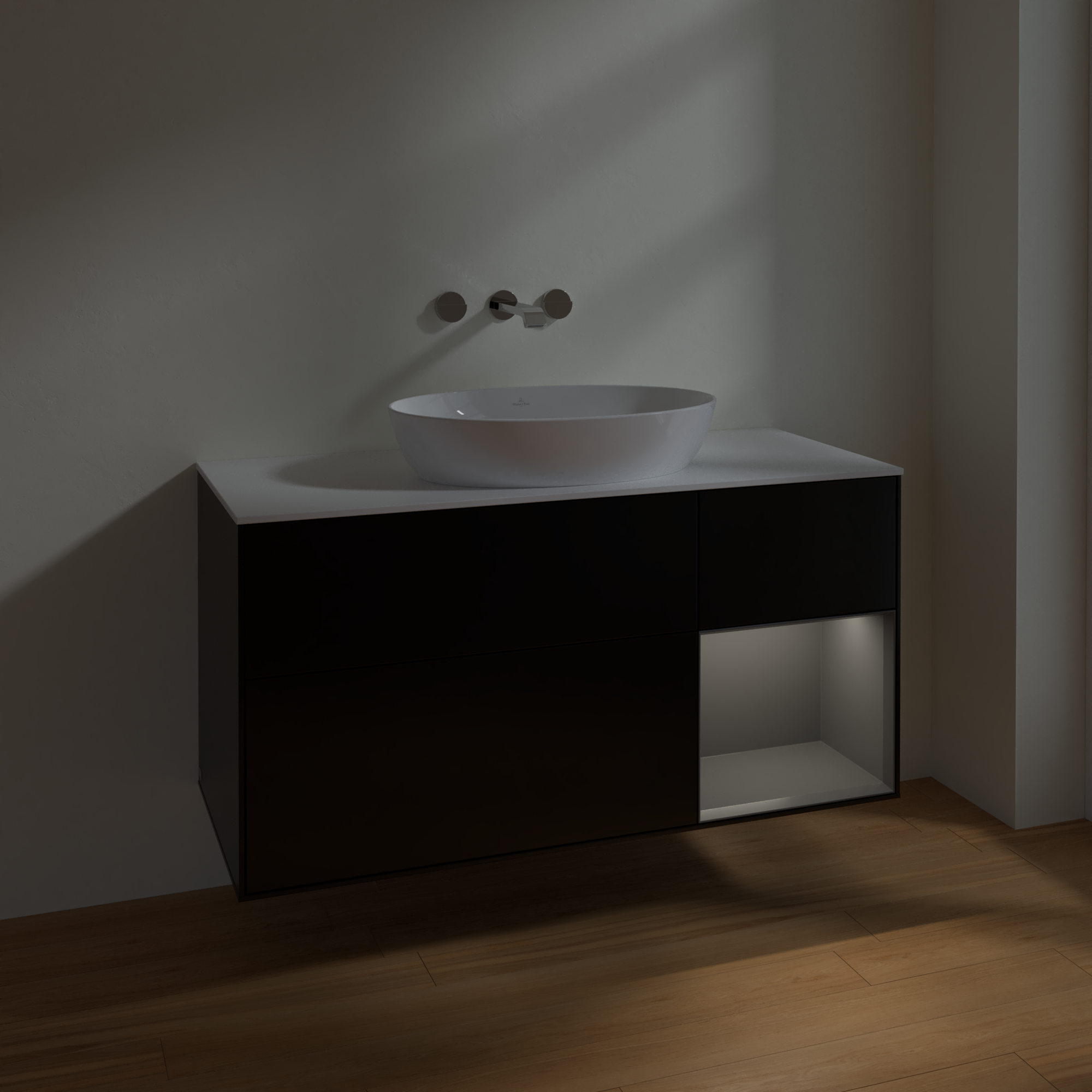 Finion Meuble sous plan, avec éclairage, 3 tiroirs sur rails, 1200x603x501mm, Caisson: Black Matt Lacquer, Façade: Black Matt Lacquer, Élément d’étagère: Anthracite Matt Lacquer, Plaque de recouvrement: Glass White Matt