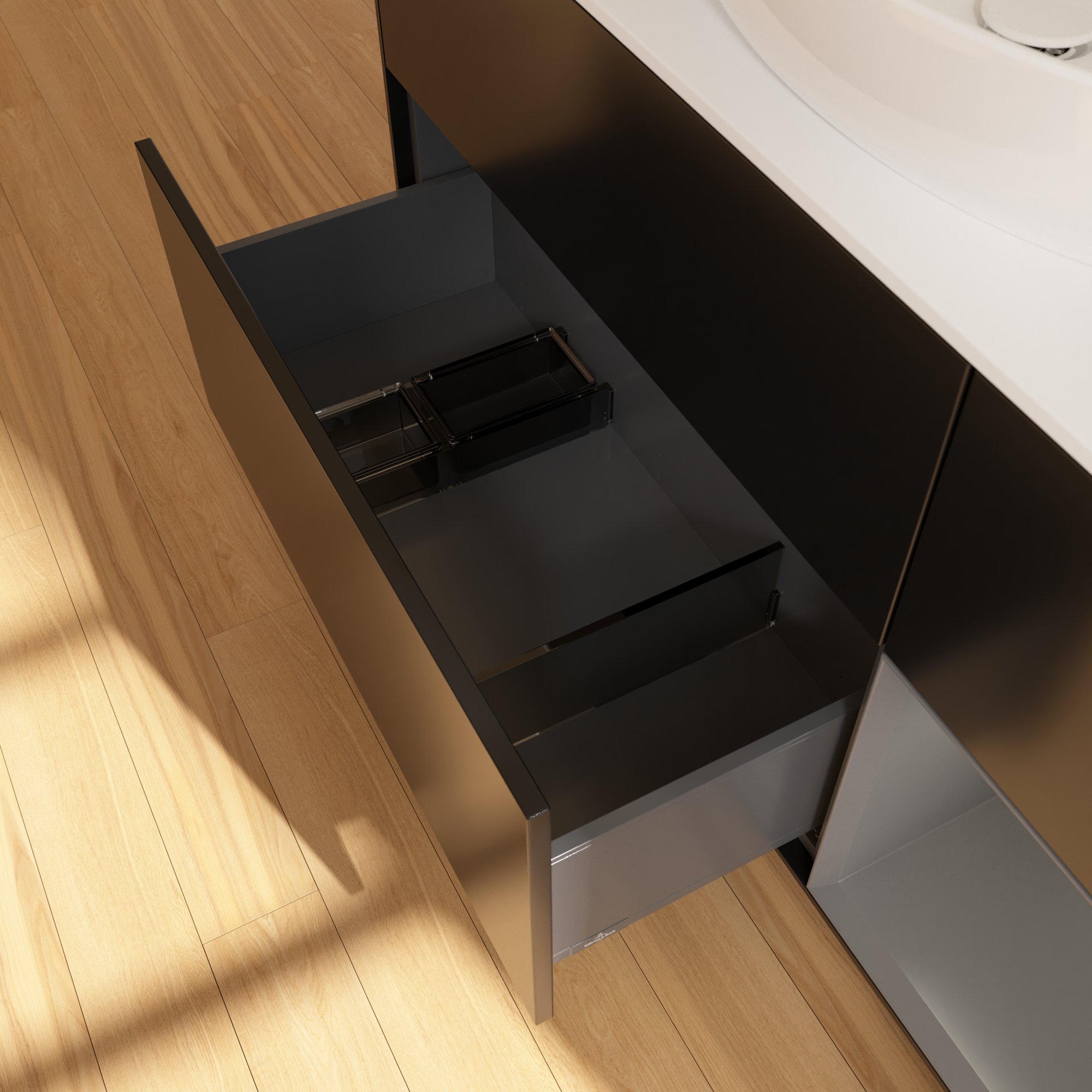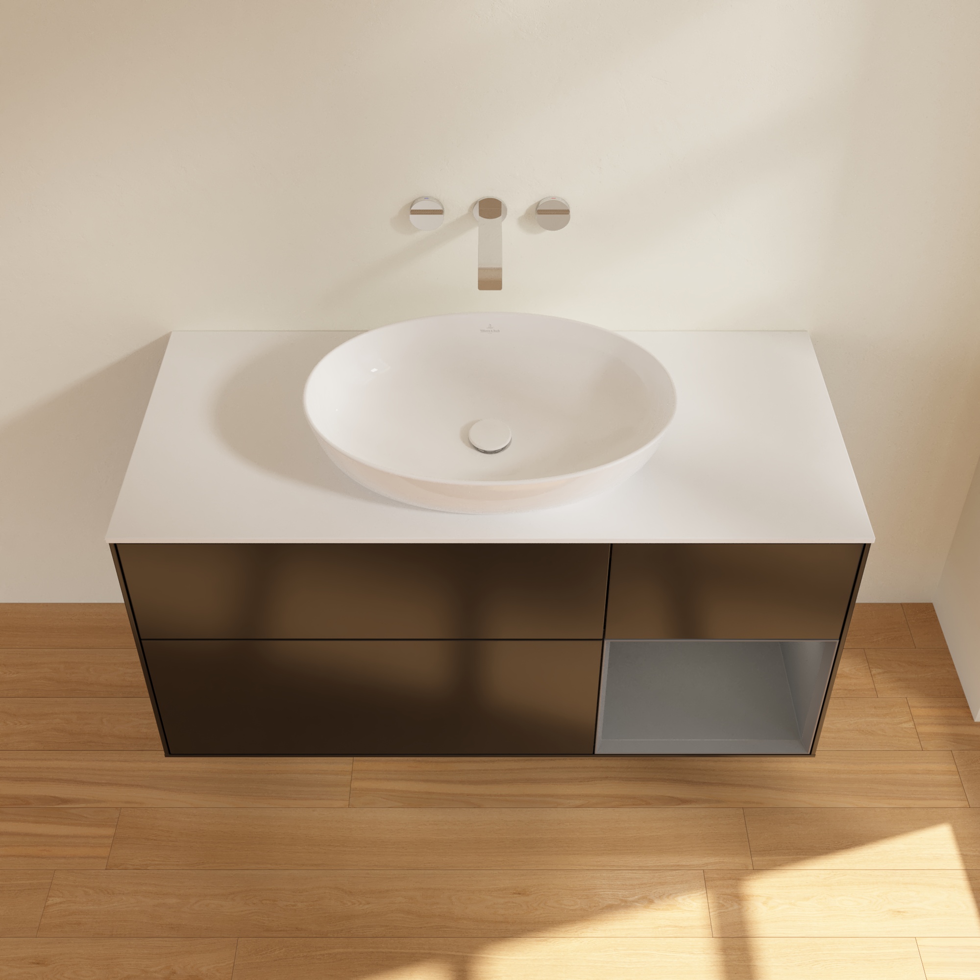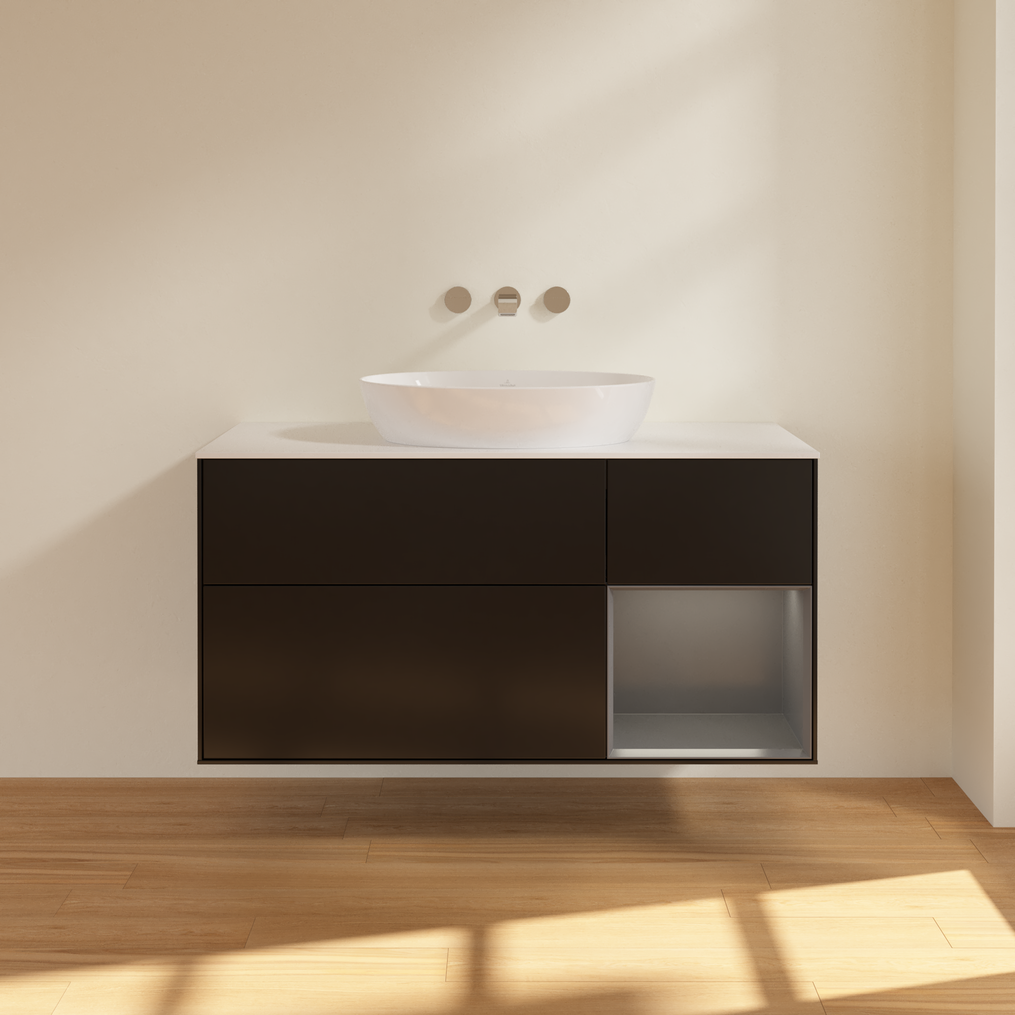 Finion Meuble sous plan, avec éclairage, 3 tiroirs sur rails, 1200x603x501mm, Caisson: Black Matt Lacquer, Façade: Black Matt Lacquer, Élément d’étagère: Anthracite Matt Lacquer, Plaque de recouvrement: Glass White Matt