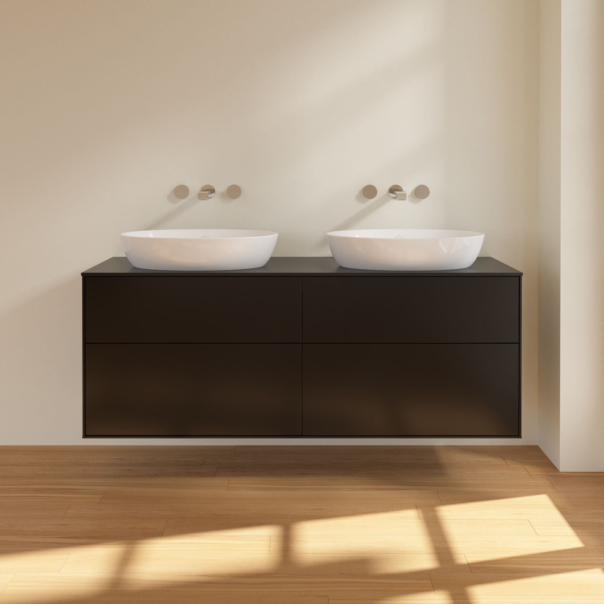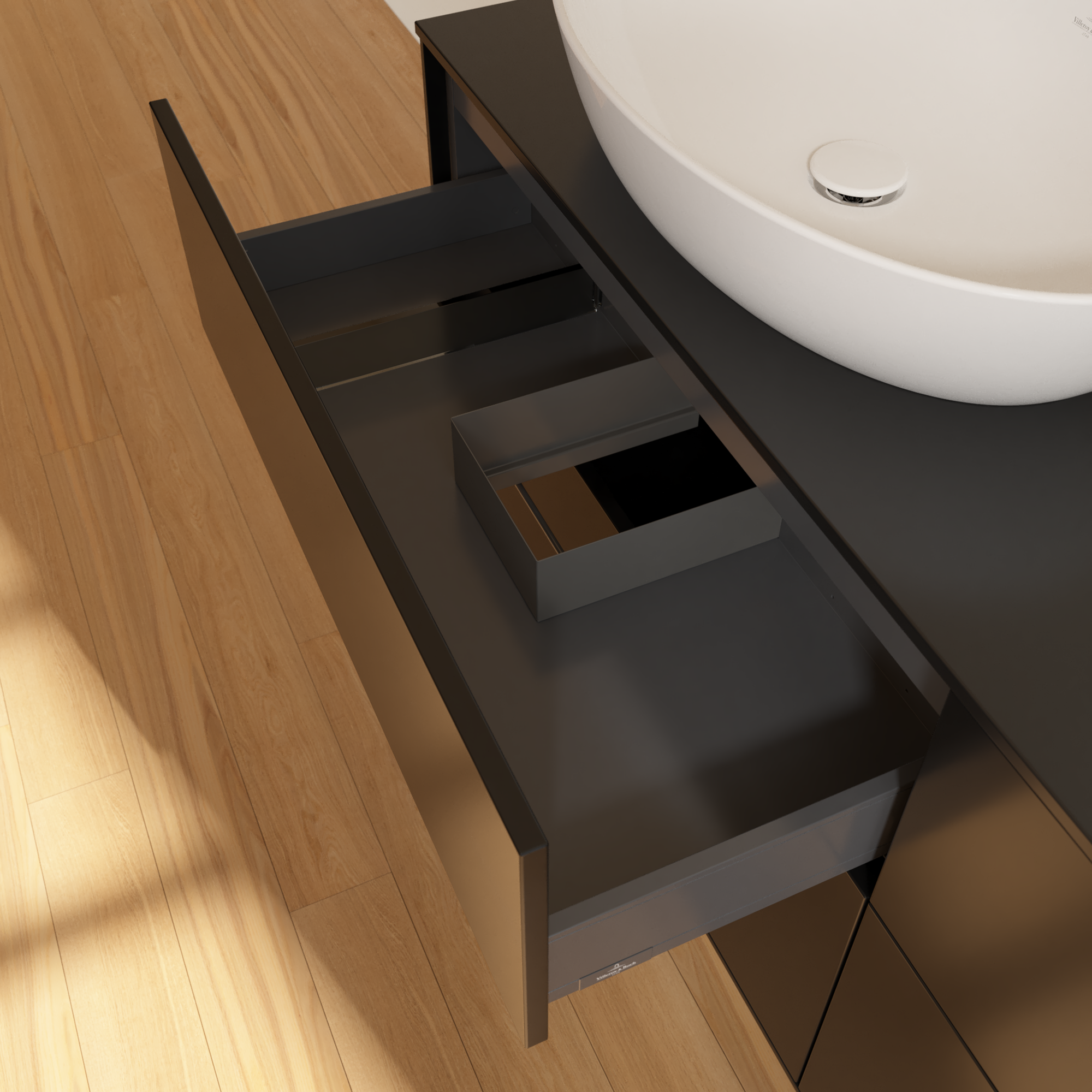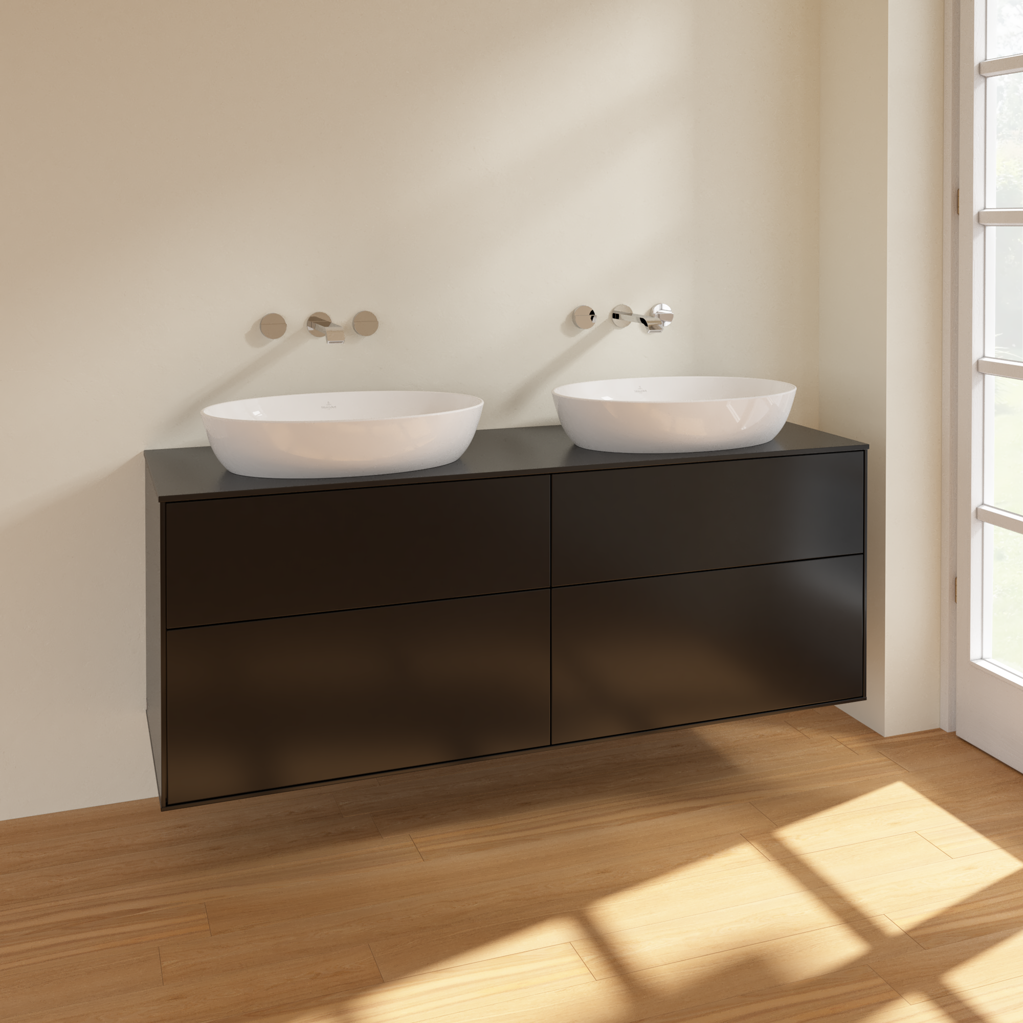Finion Meuble sous plan, 4 tiroirs sur rails, 1600x603x501mm, Caisson: Black Matt Lacquer, Façade: Black Matt Lacquer, Plaque de recouvrement: Glass Black Matt