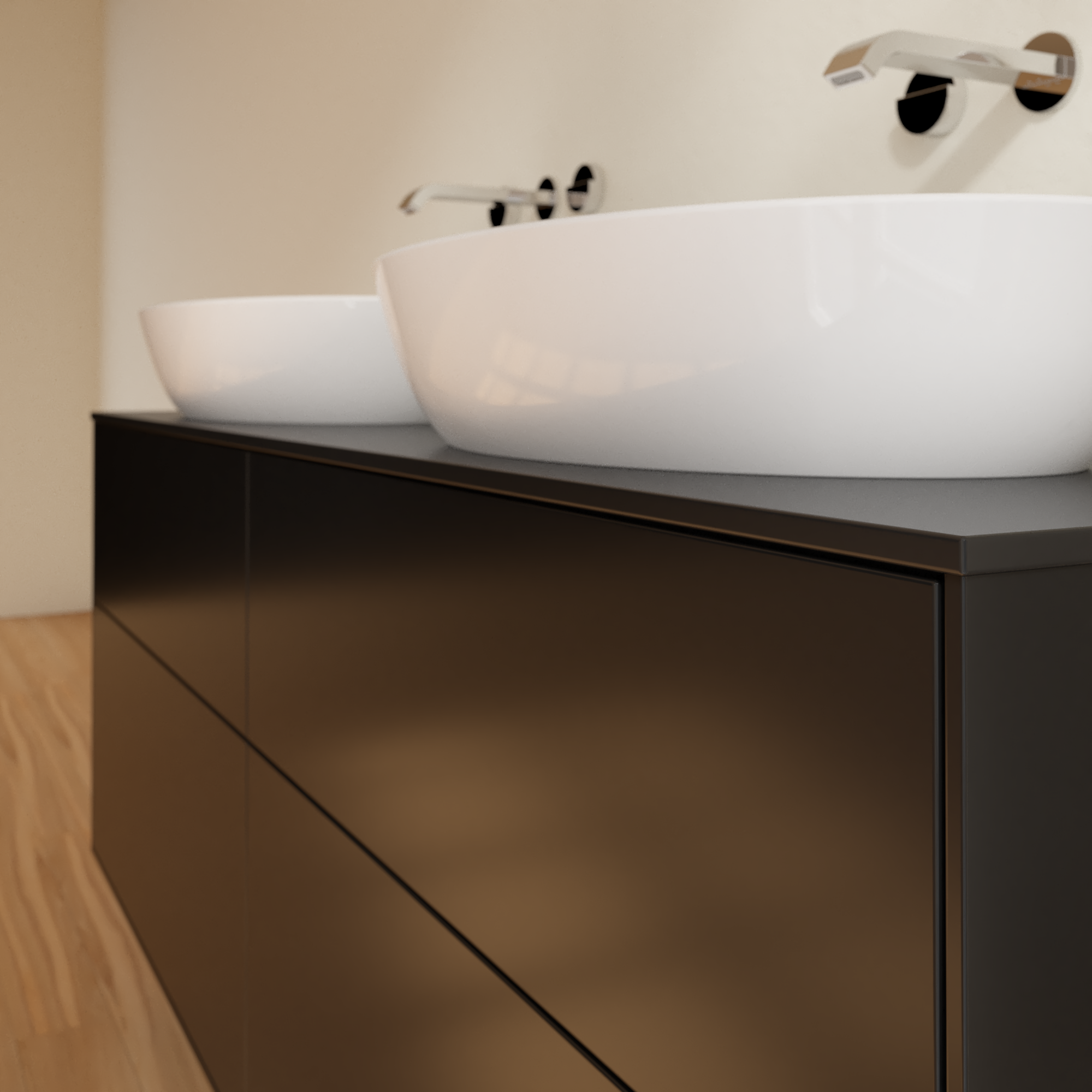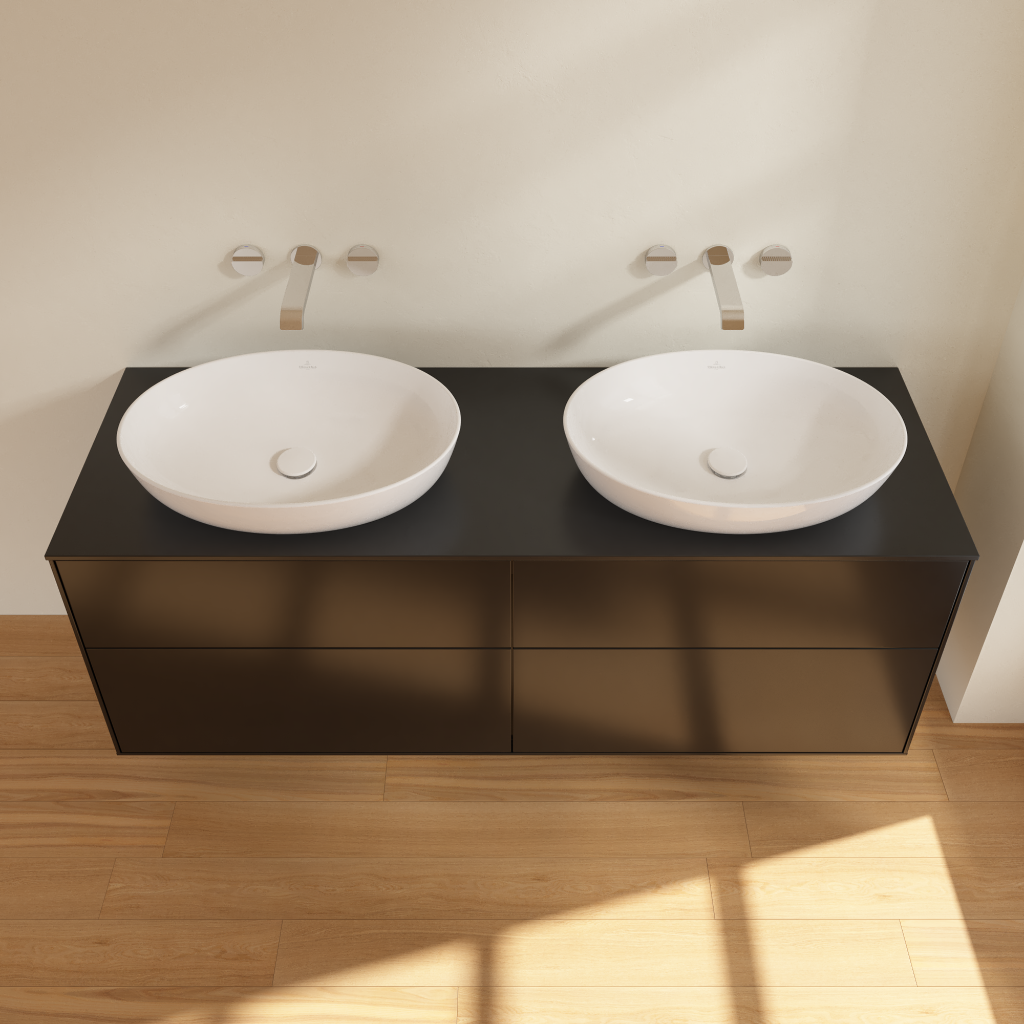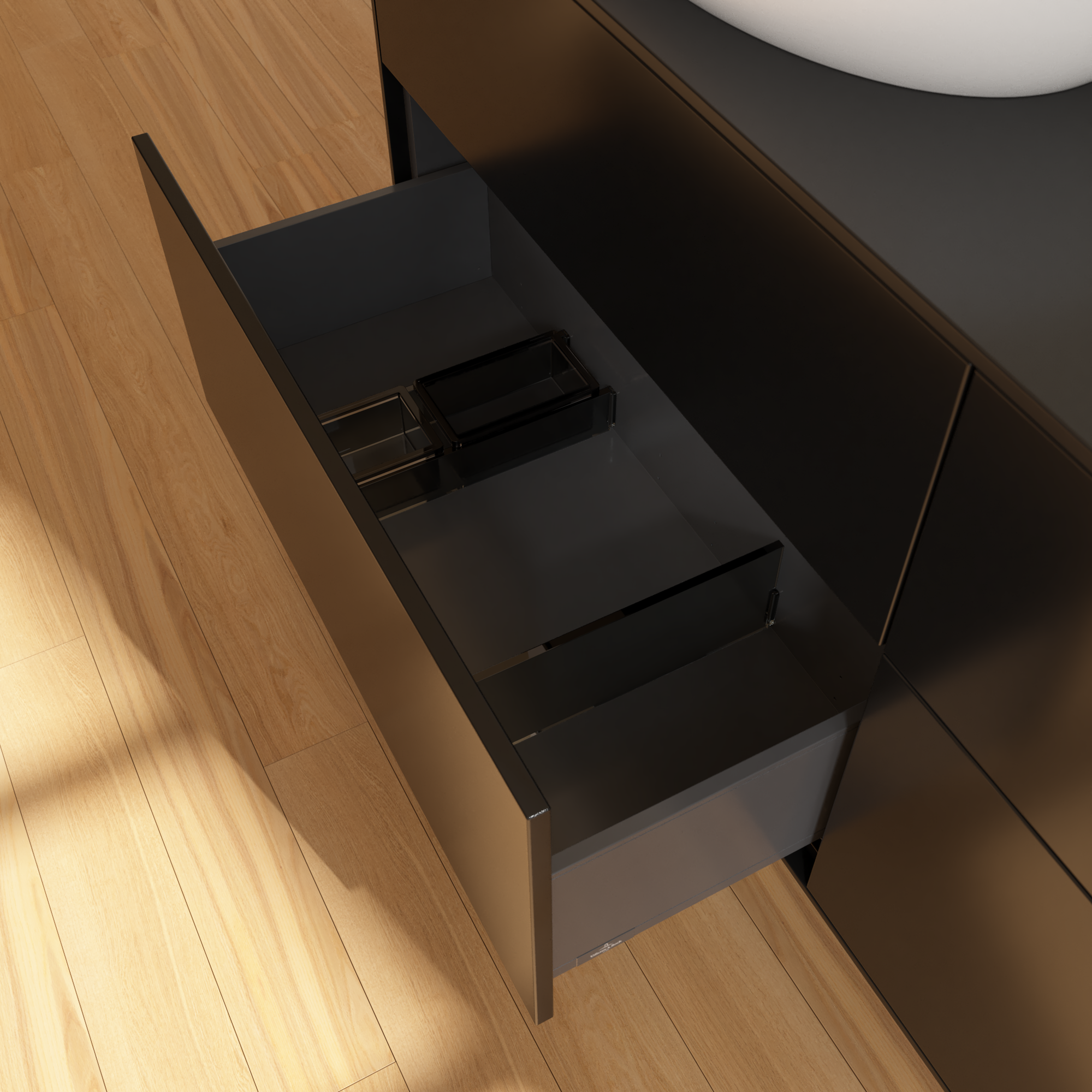 Finion Meuble sous plan, 4 tiroirs sur rails, 1600x603x501mm, Caisson: Black Matt Lacquer, Façade: Black Matt Lacquer, Plaque de recouvrement: Glass Black Matt