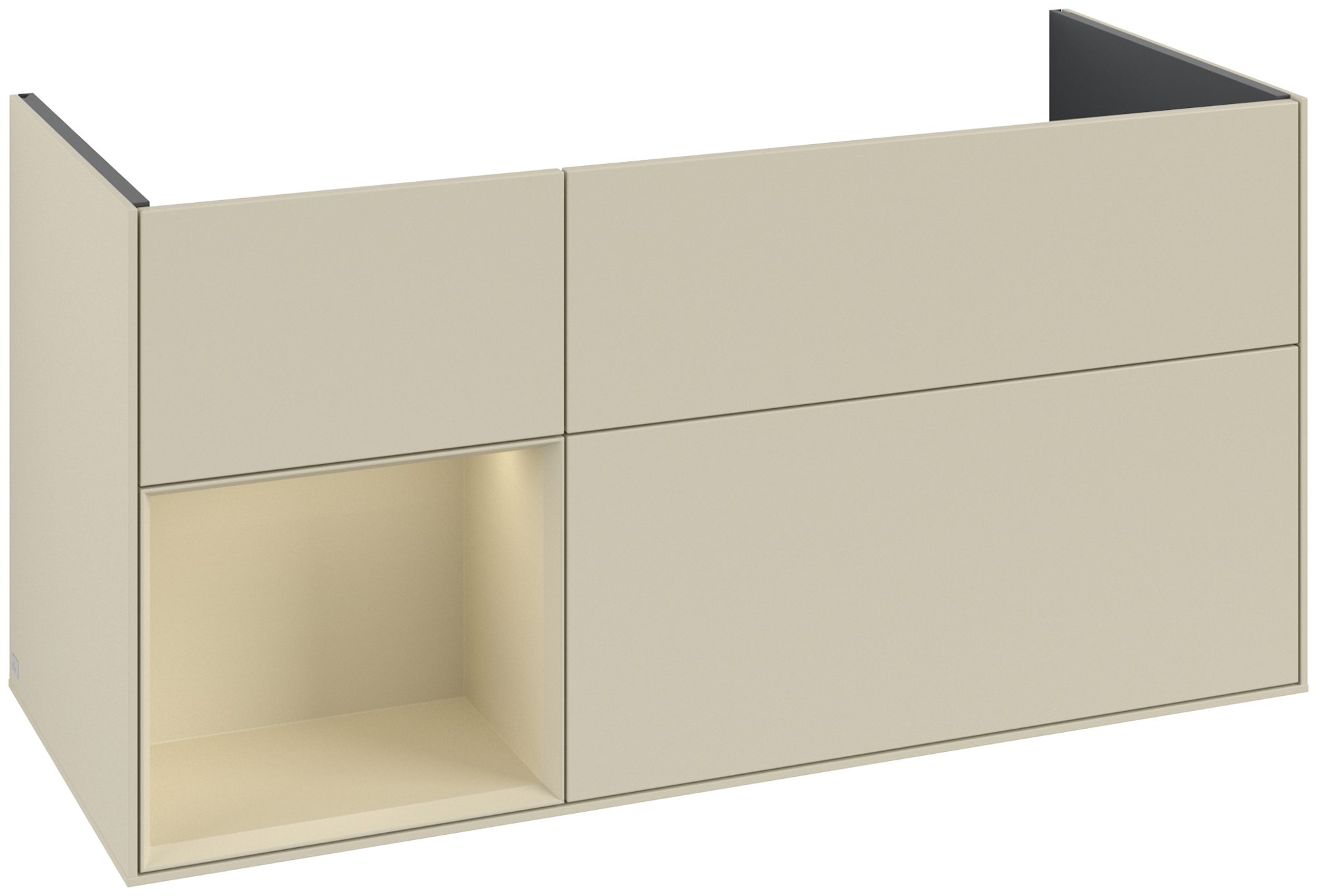Finion Meuble sous plan, avec éclairage, 3 tiroirs sur rails, 1196x591x498mm, Caisson: Silk Grey Matt Lacquer, Façade: Silk Grey Matt Lacquer, Élément d’étagère: Silk Grey Matt Lacquer