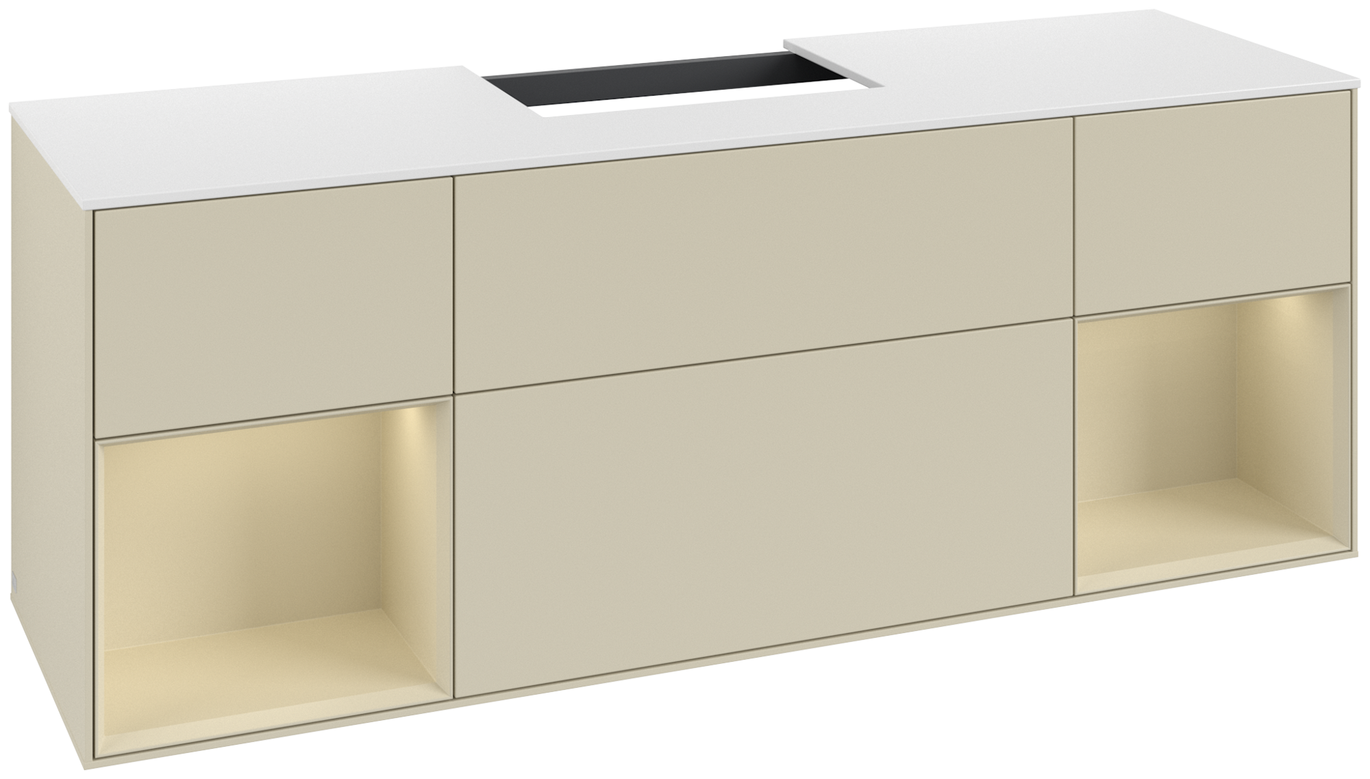 Finion Meuble sous plan, avec éclairage, 4 tiroirs sur rails, 1600x603x501mm, Caisson: Silk Grey Matt Lacquer, Façade: Silk Grey Matt Lacquer, Élément d’étagère: Silk Grey Matt Lacquer, Plaque de recouvrement: Glass White Matt