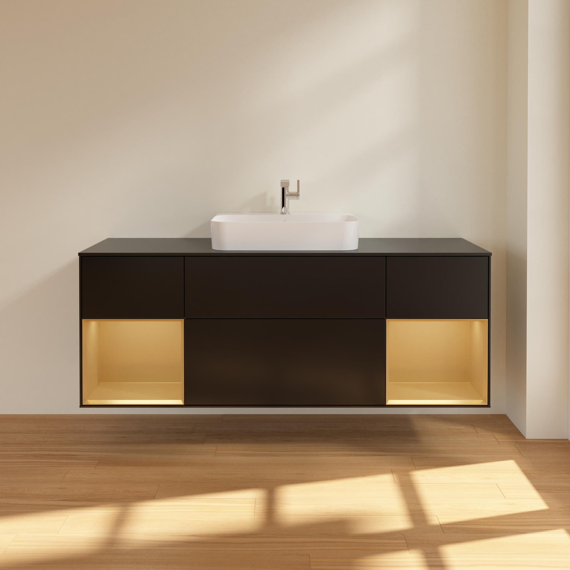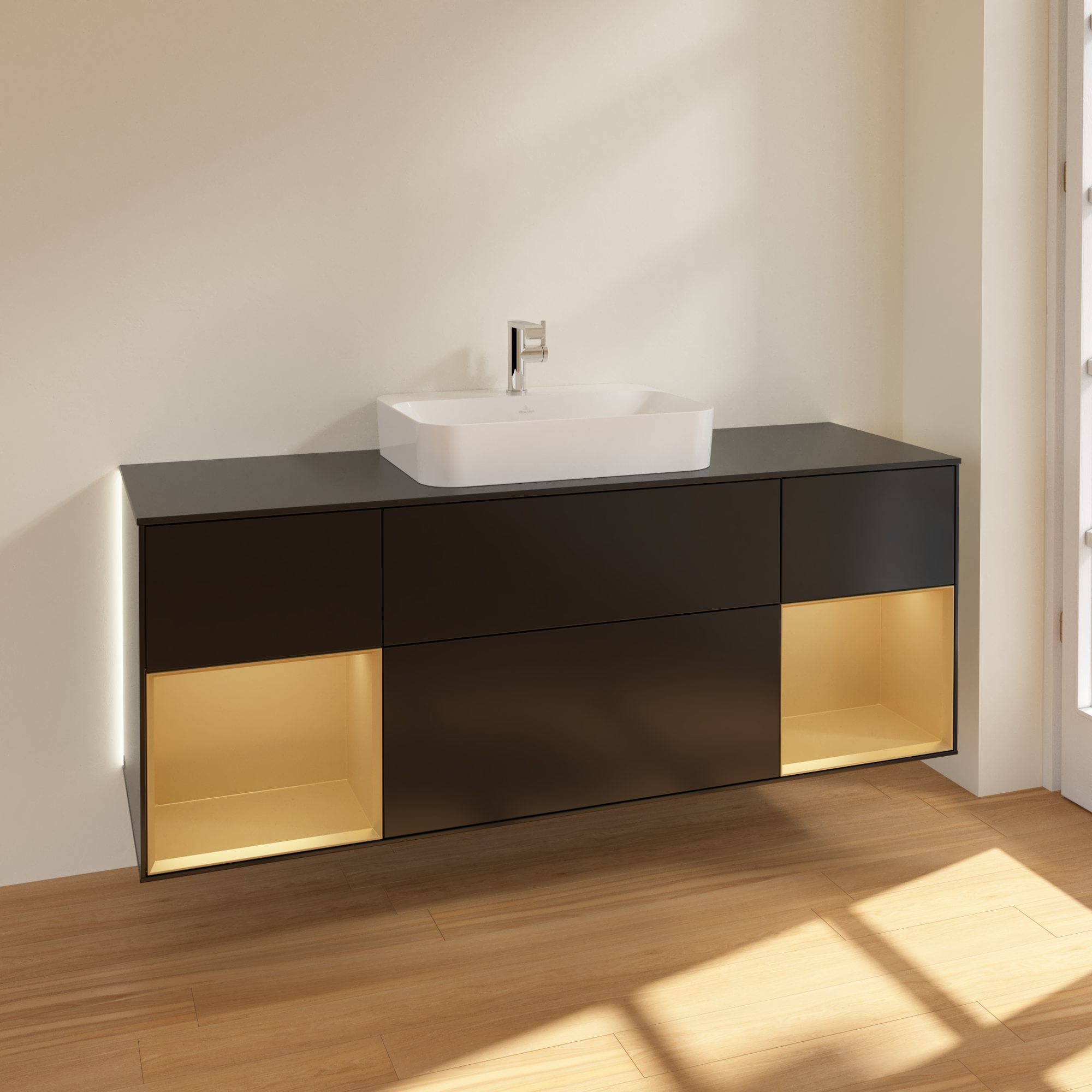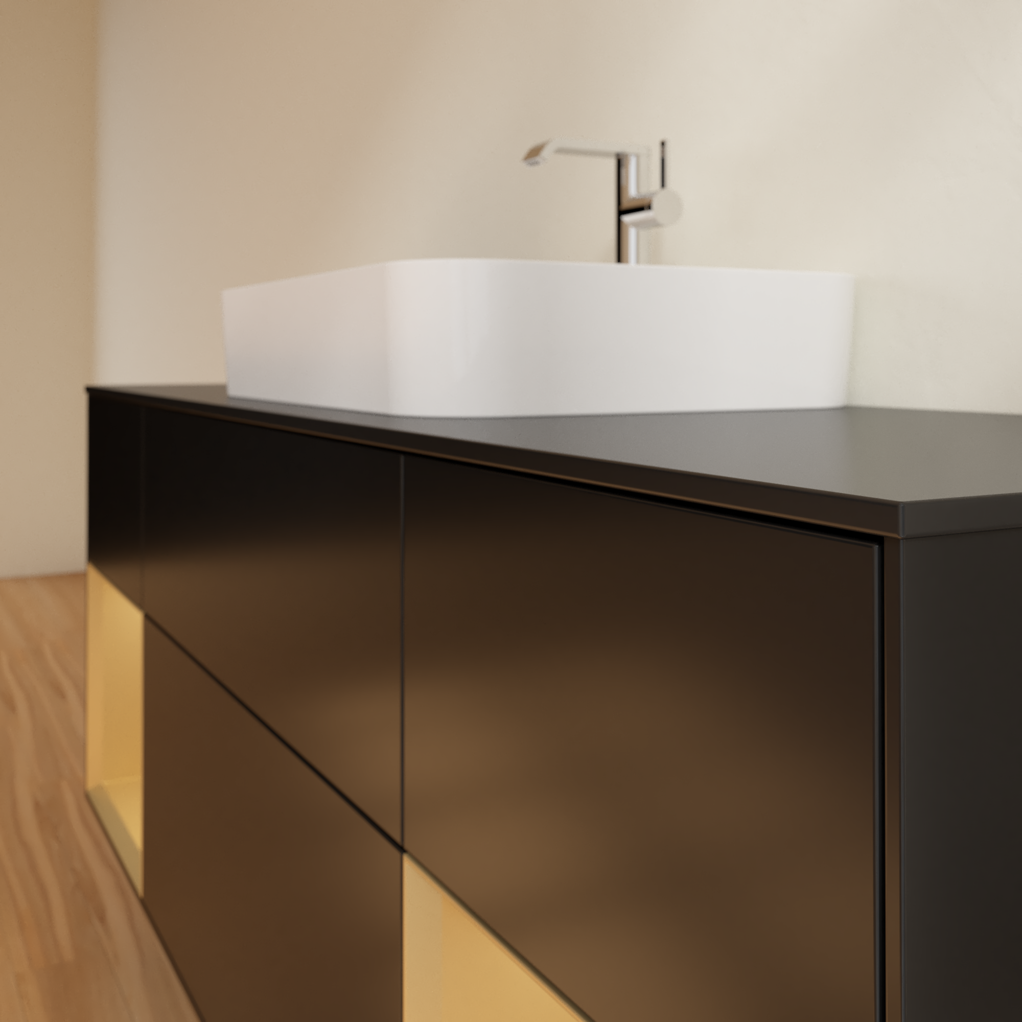 Finion Meuble sous plan, avec éclairage, 4 tiroirs sur rails, 1600x603x501mm, Caisson: Black Matt Lacquer, Façade: Black Matt Lacquer, Élément d’étagère: Gold Matt Lacquer, Plaque de recouvrement: Glass Black Matt
