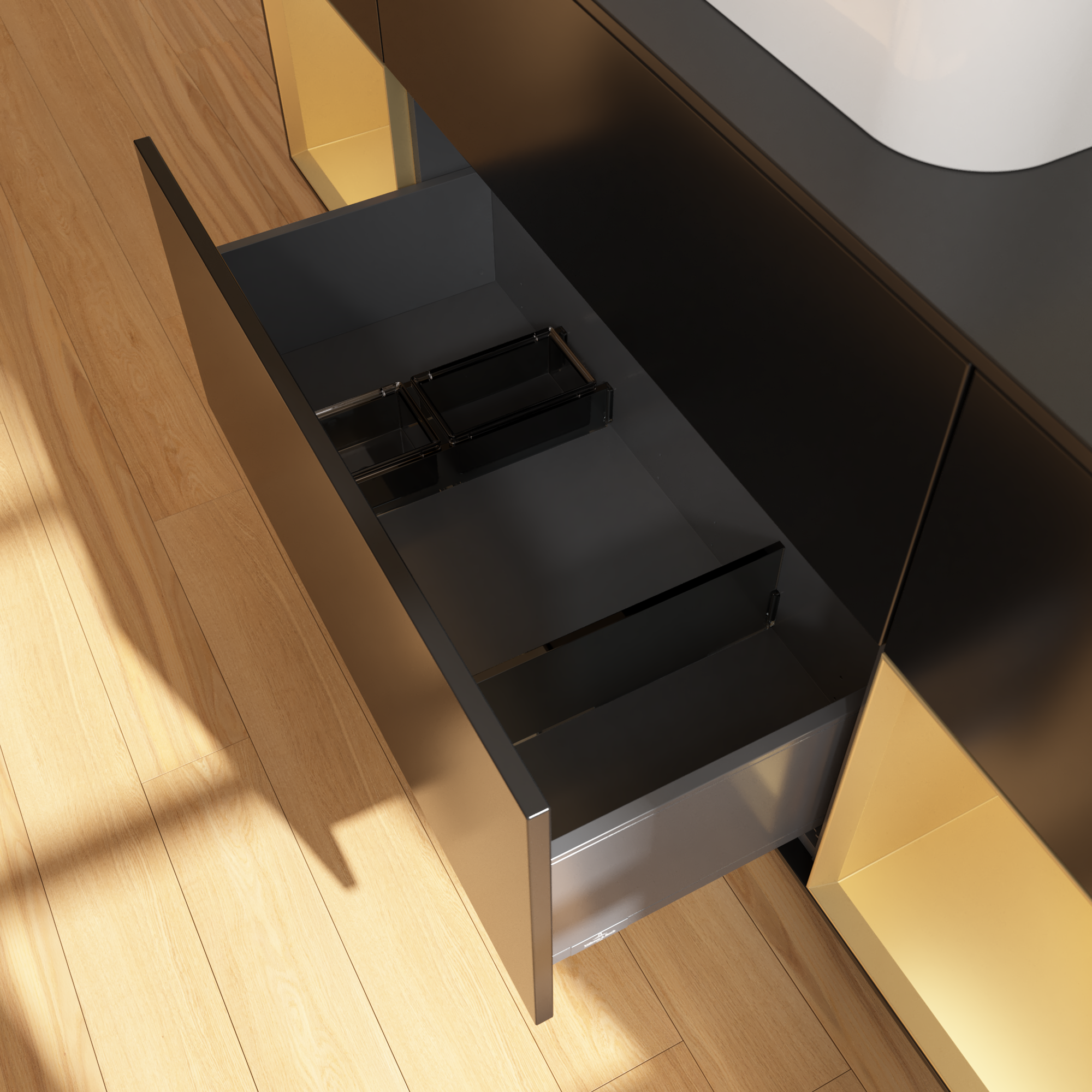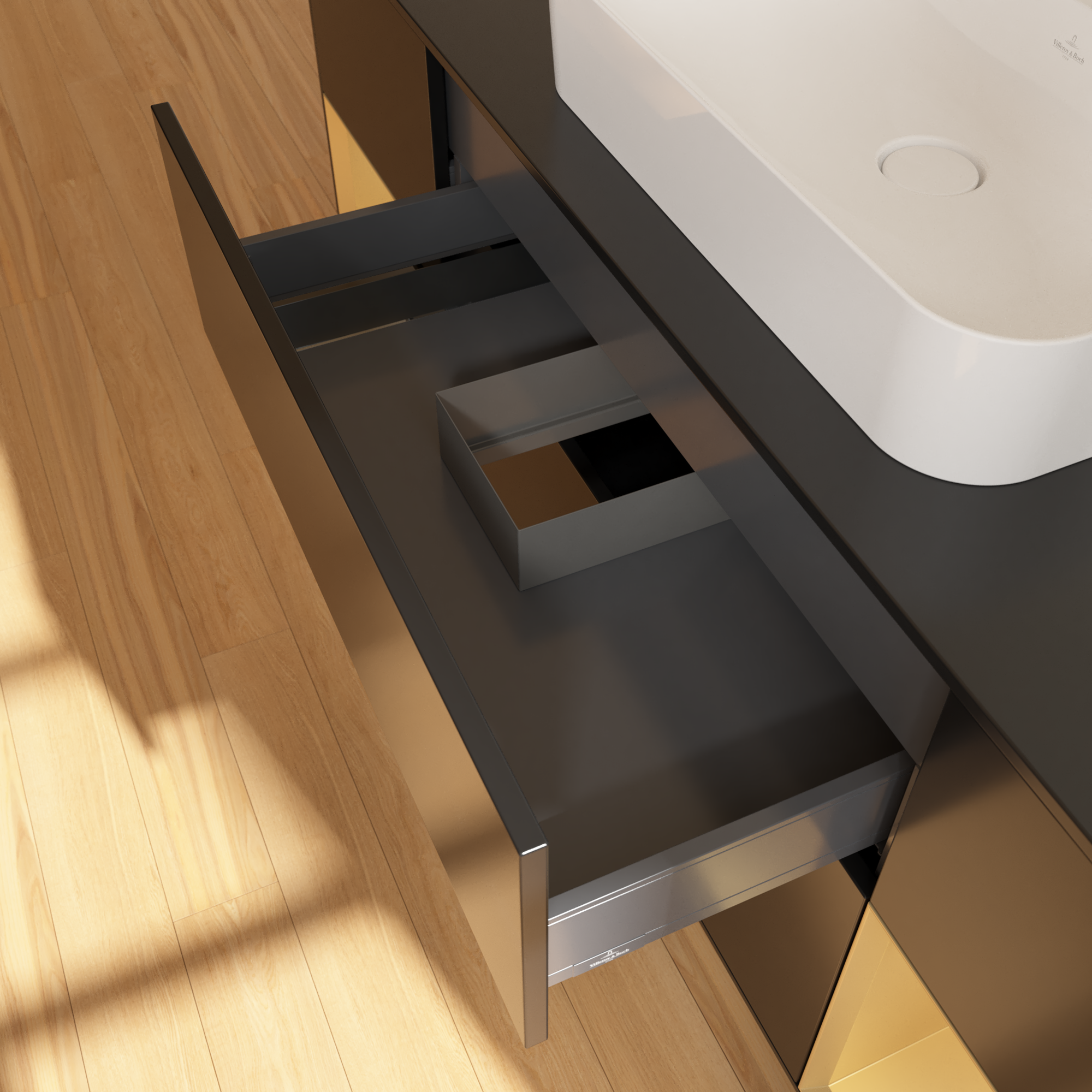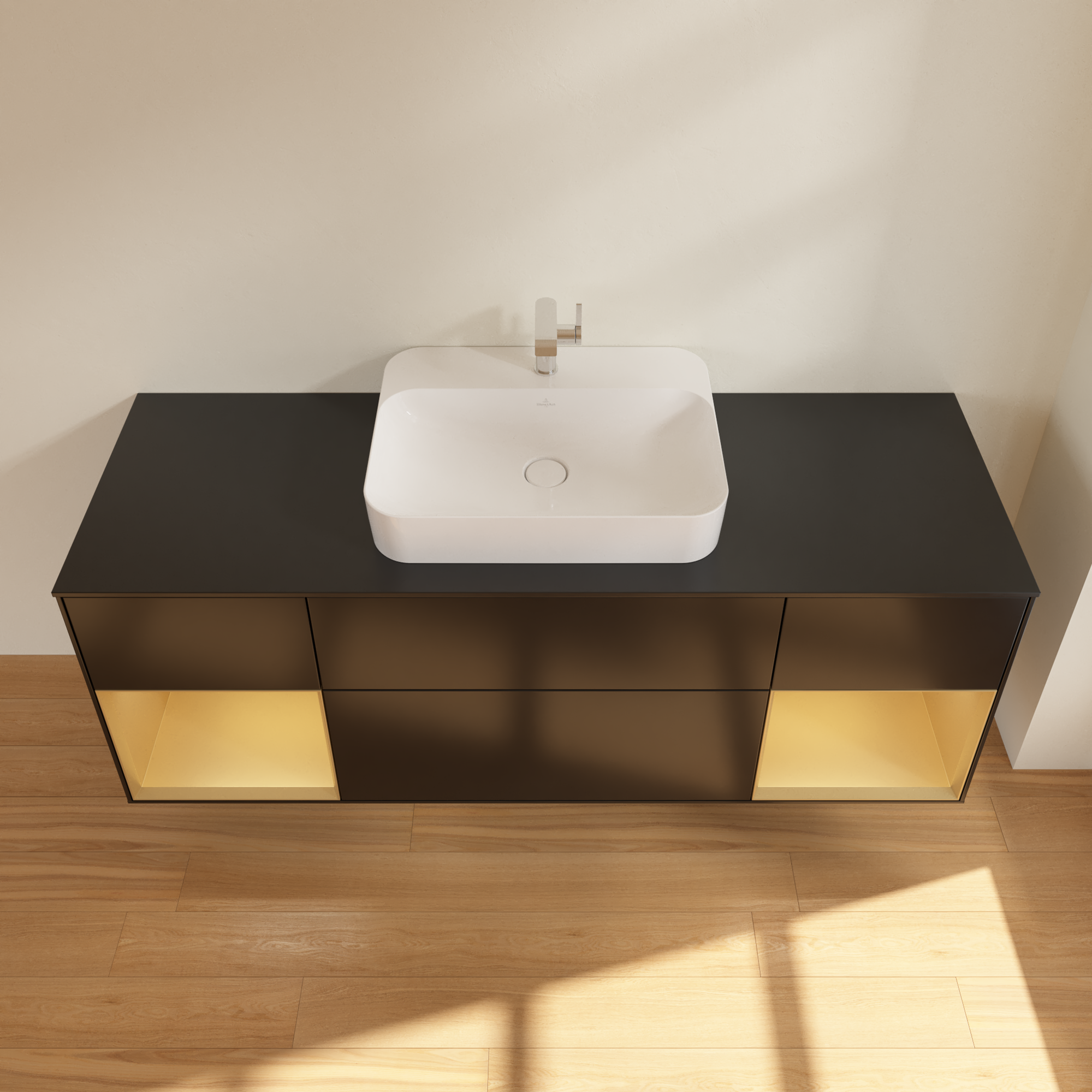 Finion Meuble sous plan, avec éclairage, 4 tiroirs sur rails, 1600x603x501mm, Caisson: Black Matt Lacquer, Façade: Black Matt Lacquer, Élément d’étagère: Gold Matt Lacquer, Plaque de recouvrement: Glass Black Matt