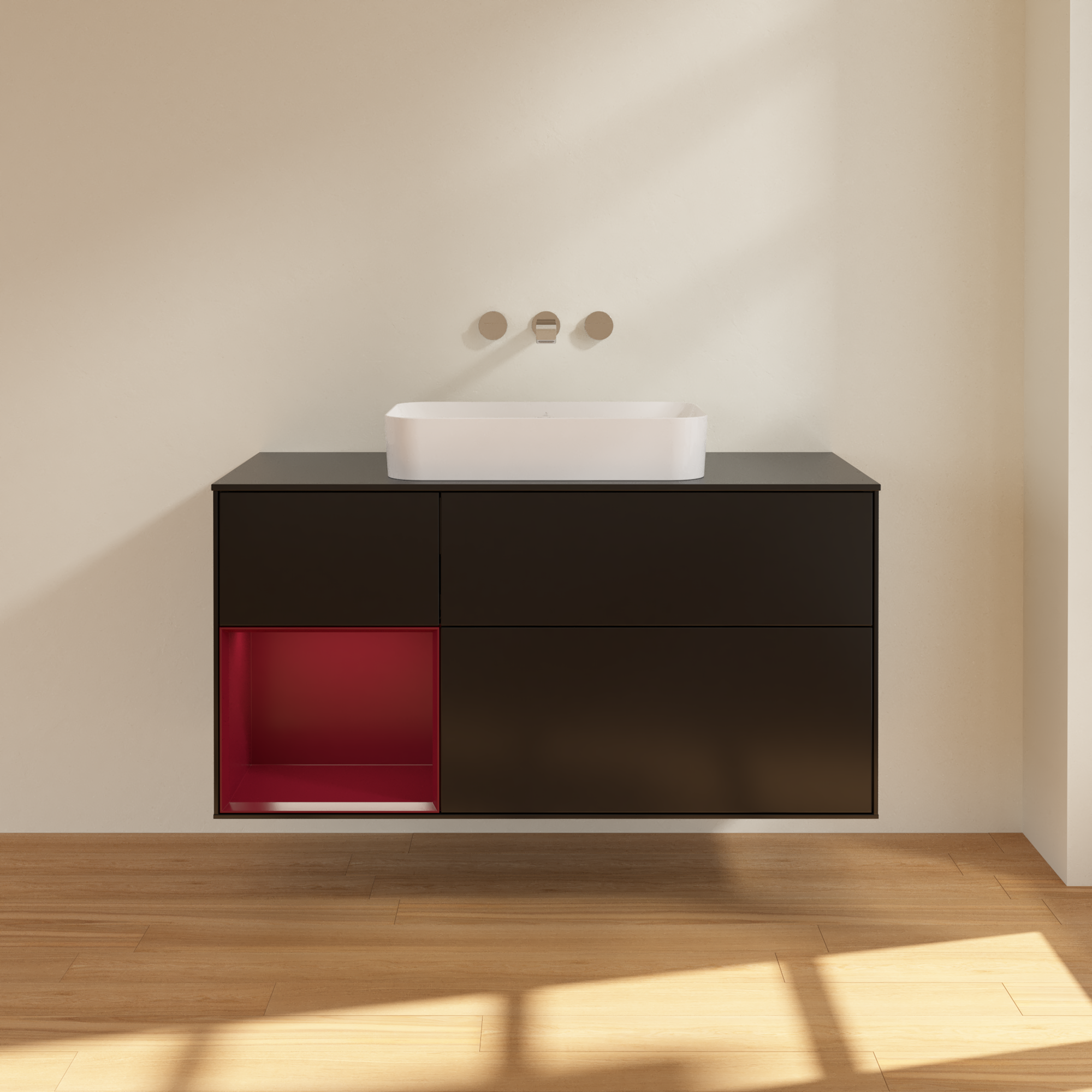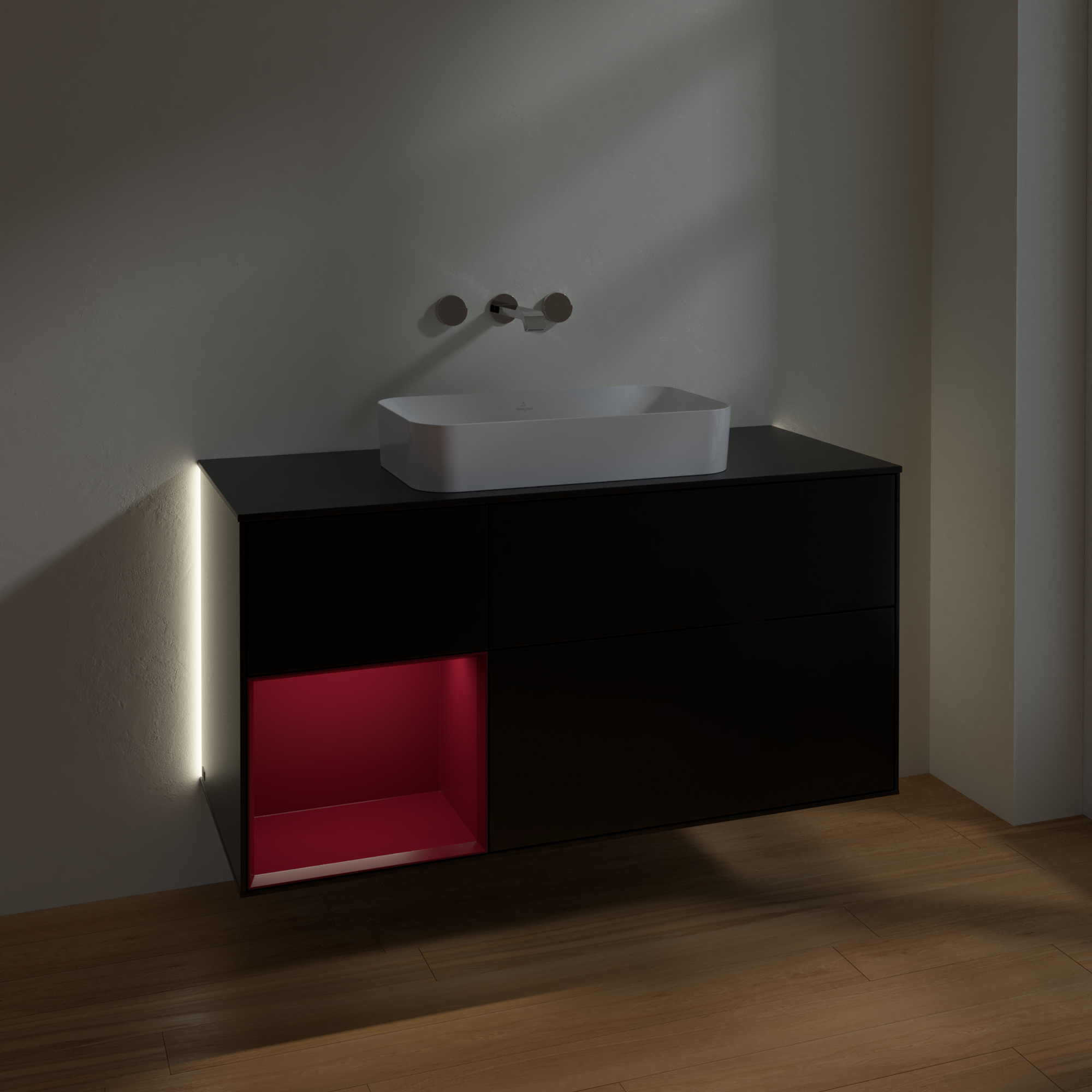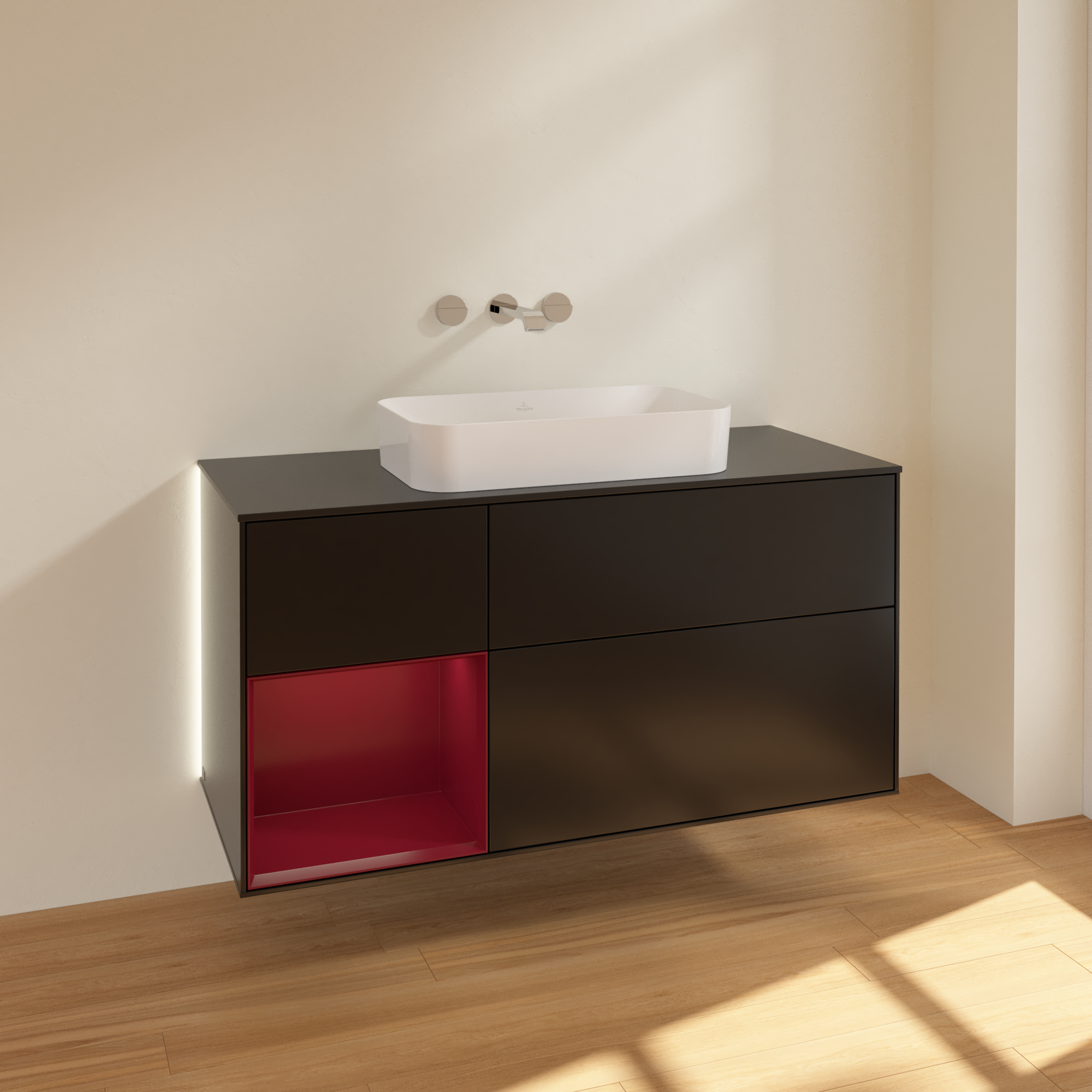 Finion Meuble sous plan, avec éclairage, 3 tiroirs sur rails, 1200x603x501mm, Caisson: Black Matt Lacquer, Façade: Black Matt Lacquer, Élément d’étagère: Peony Matt Lacquer, Plaque de recouvrement: Glass Black Matt