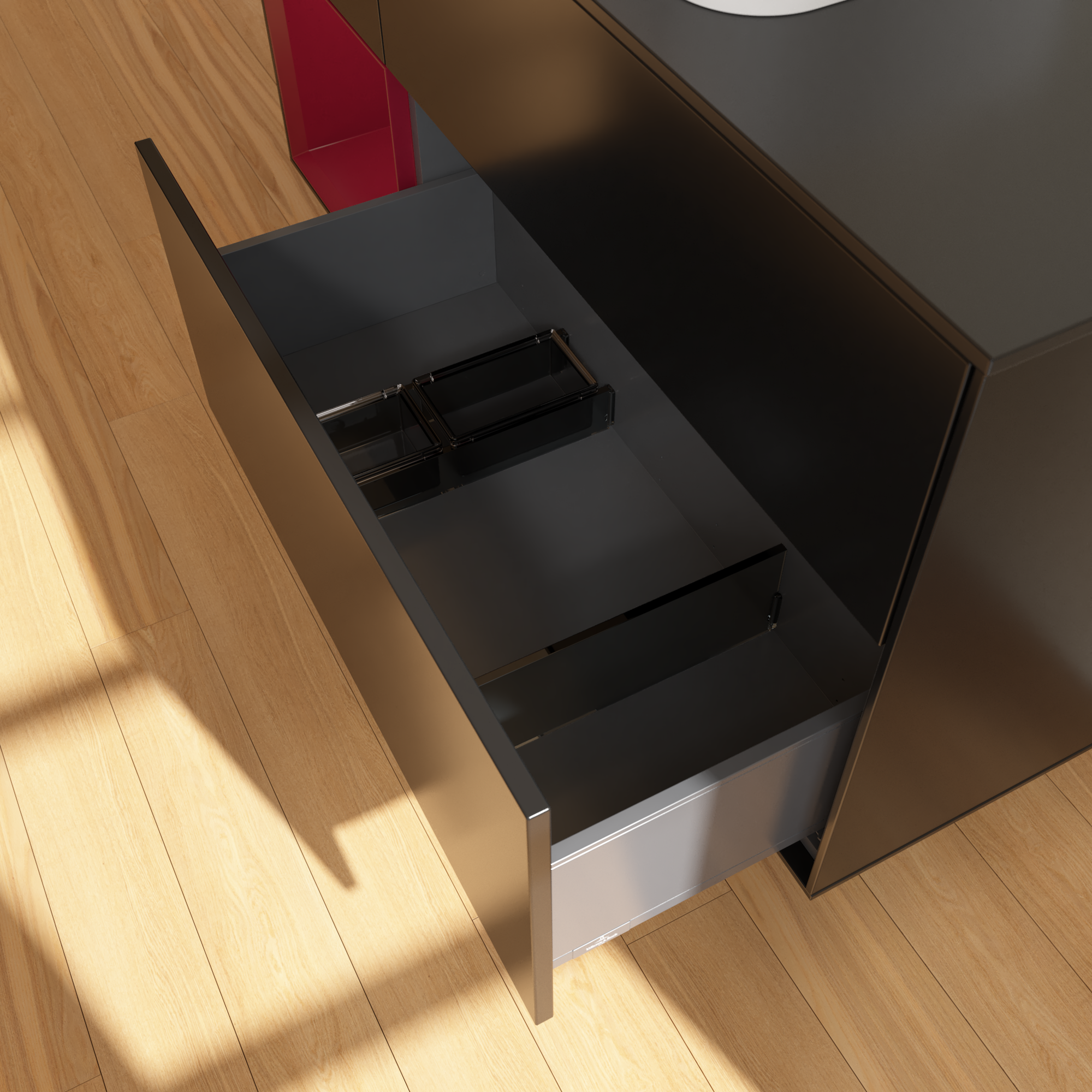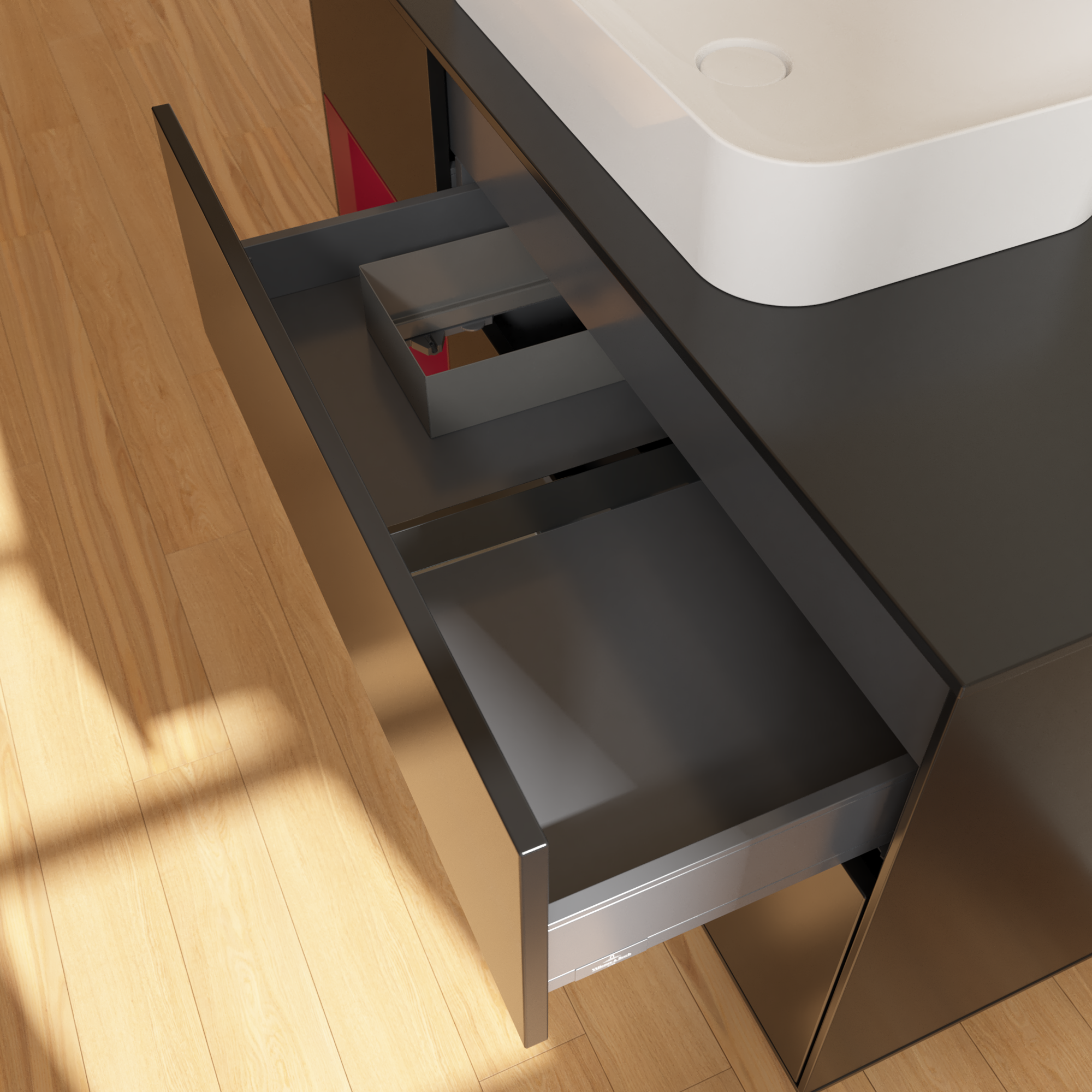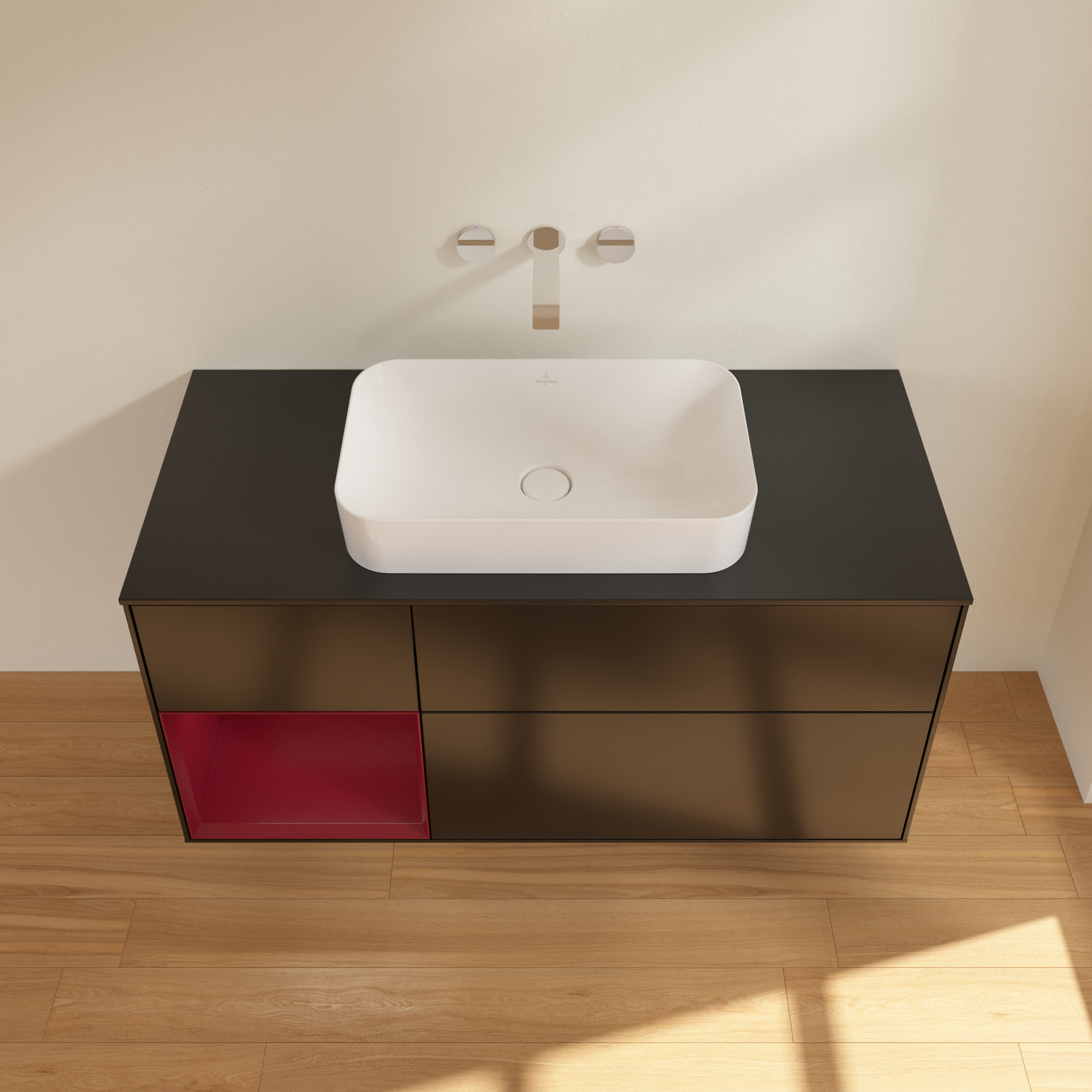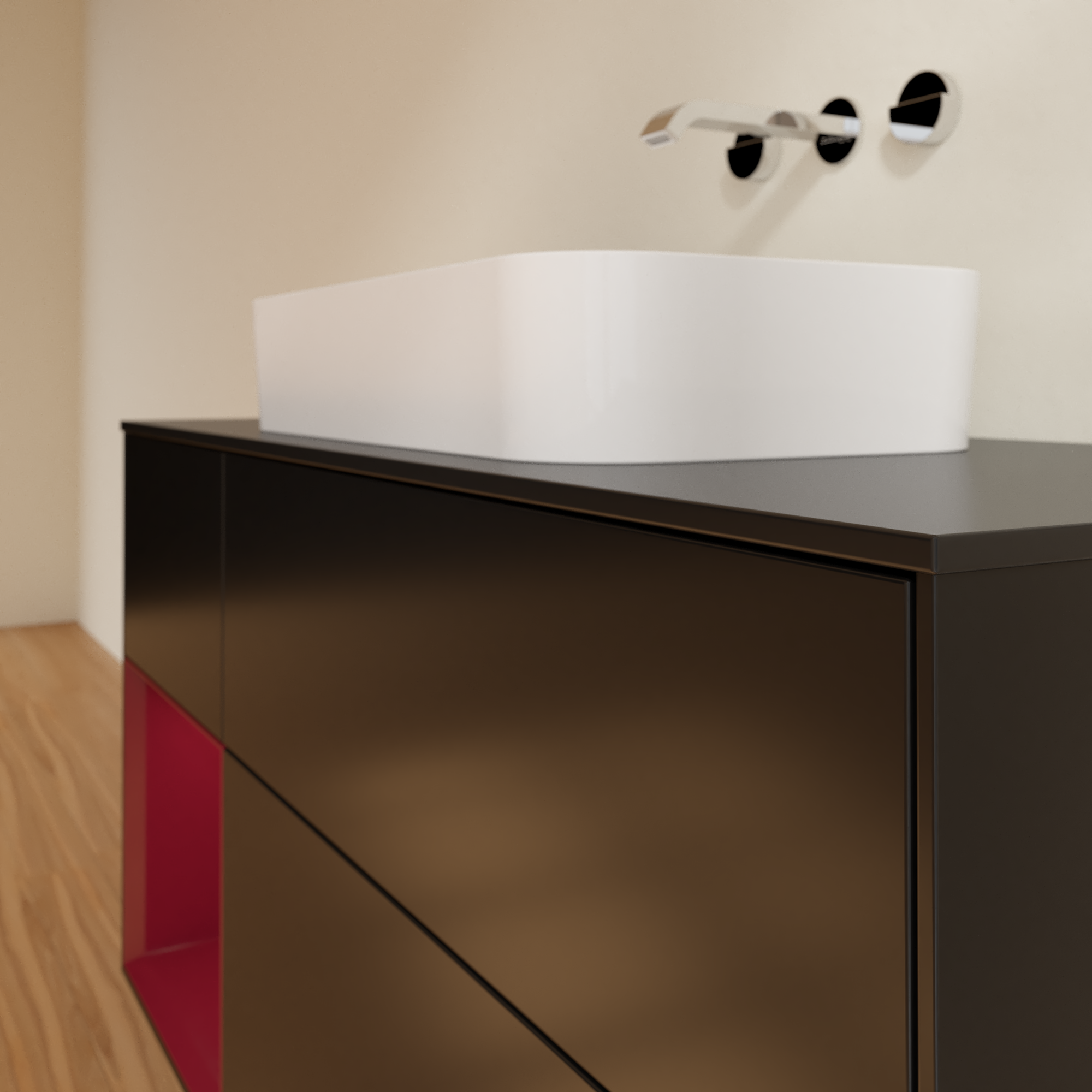 Finion Meuble sous plan, avec éclairage, 3 tiroirs sur rails, 1200x603x501mm, Caisson: Black Matt Lacquer, Façade: Black Matt Lacquer, Élément d’étagère: Peony Matt Lacquer, Plaque de recouvrement: Glass Black Matt