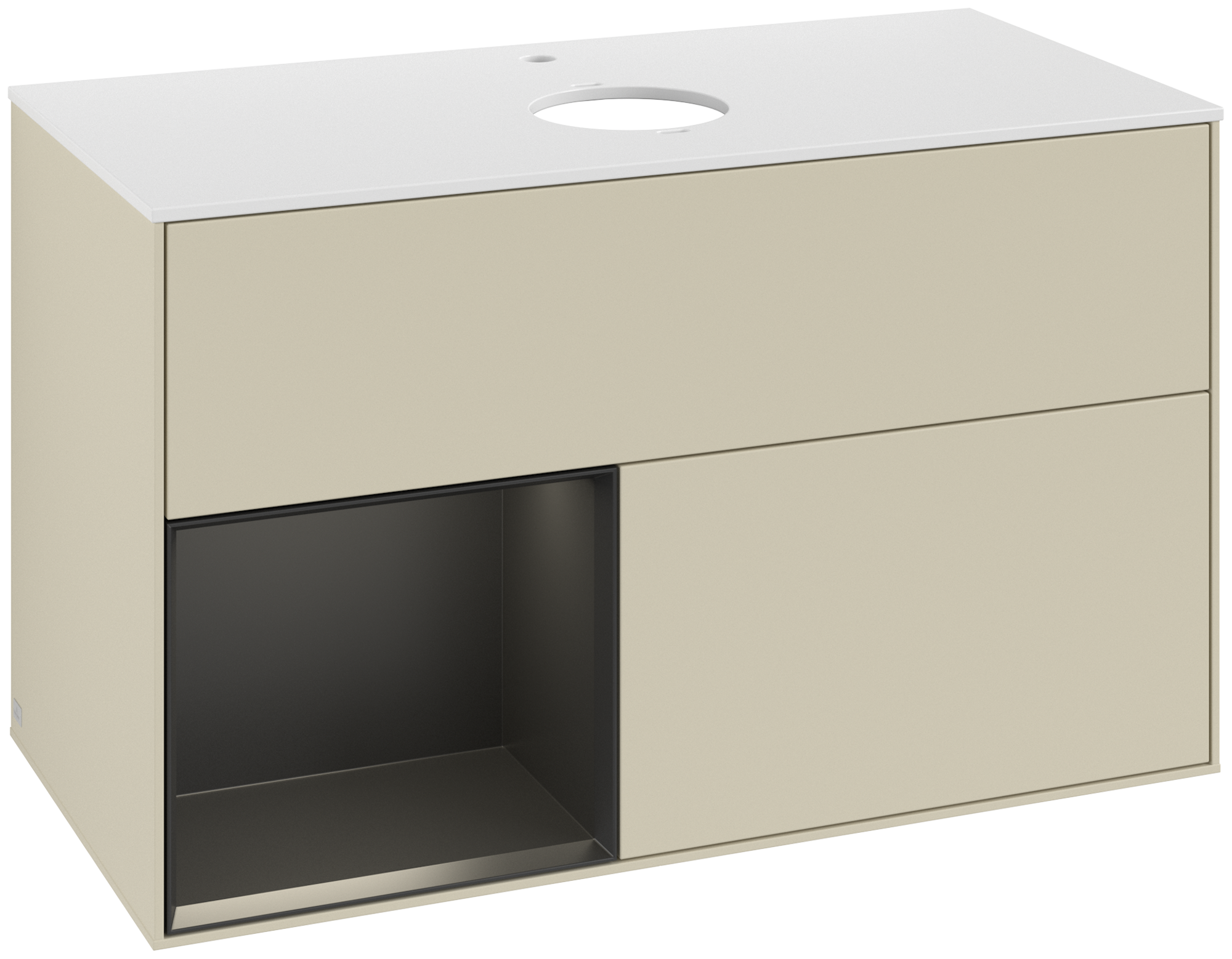 Finion Meuble sous plan, avec éclairage, 2 tiroirs sur rails, 1000x603x501mm, Caisson: Silk Grey Matt Lacquer, Façade: Silk Grey Matt Lacquer, Élément d’étagère: Black Matt Lacquer, Plaque de recouvrement: Glass White Matt