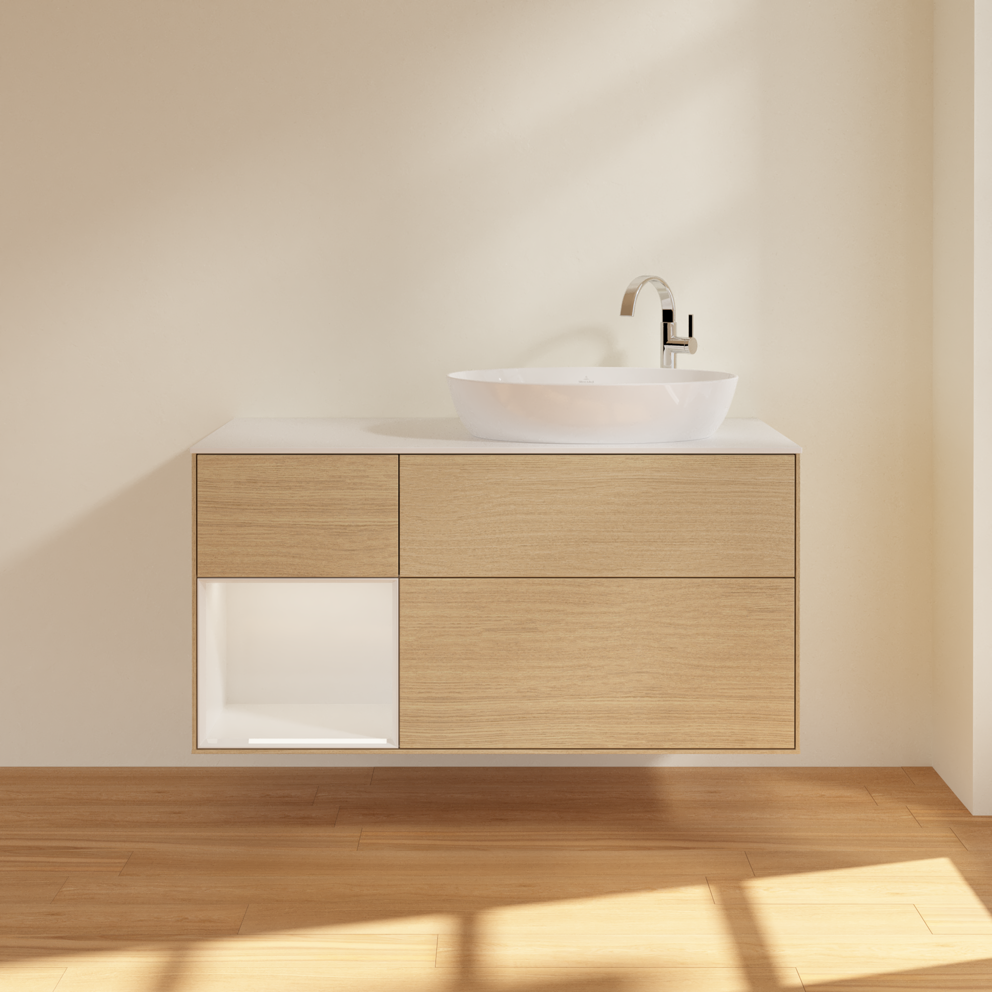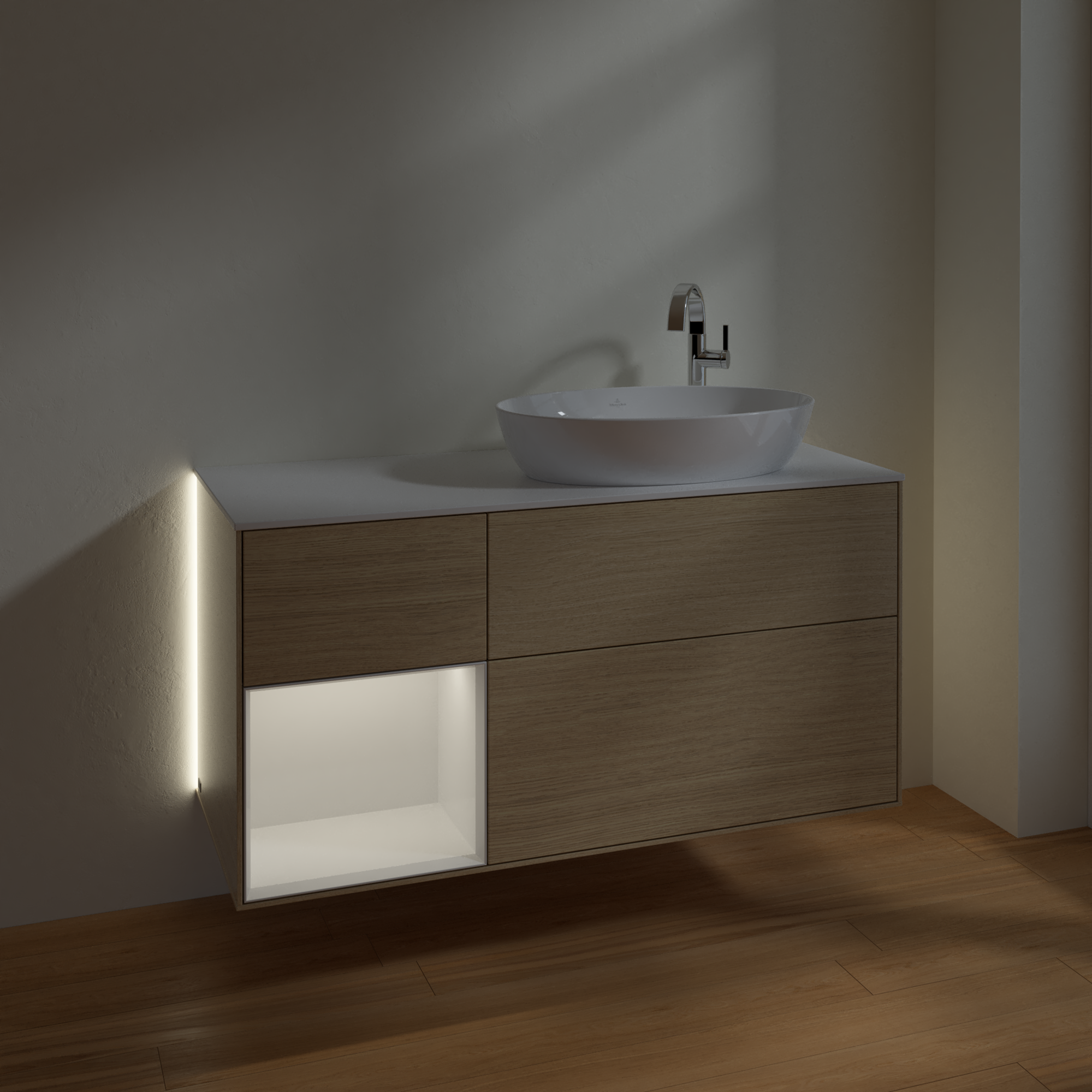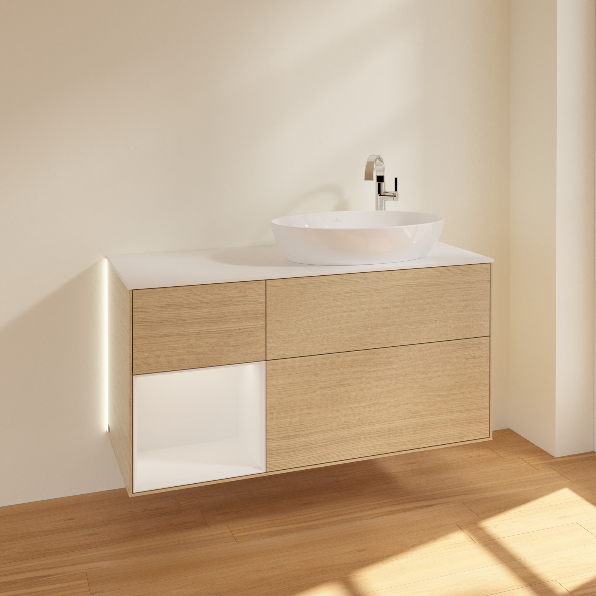 Finion Meuble sous plan, avec éclairage, 3 tiroirs sur rails, 1200x603x501mm, Caisson: Oak Veneer, Façade: Oak Veneer, Élément d’étagère: Glossy White Lacquer, Plaque de recouvrement: Glass White Matt