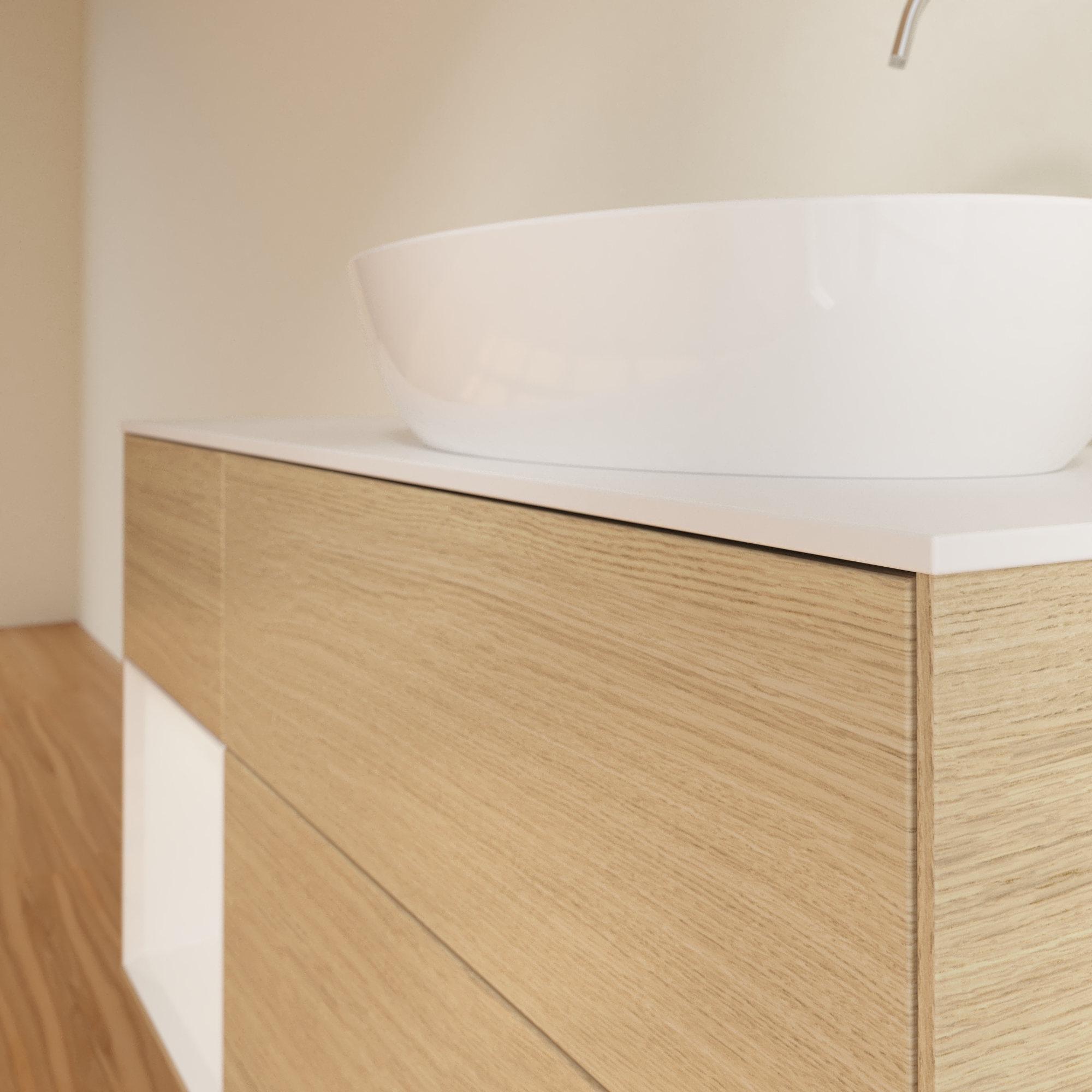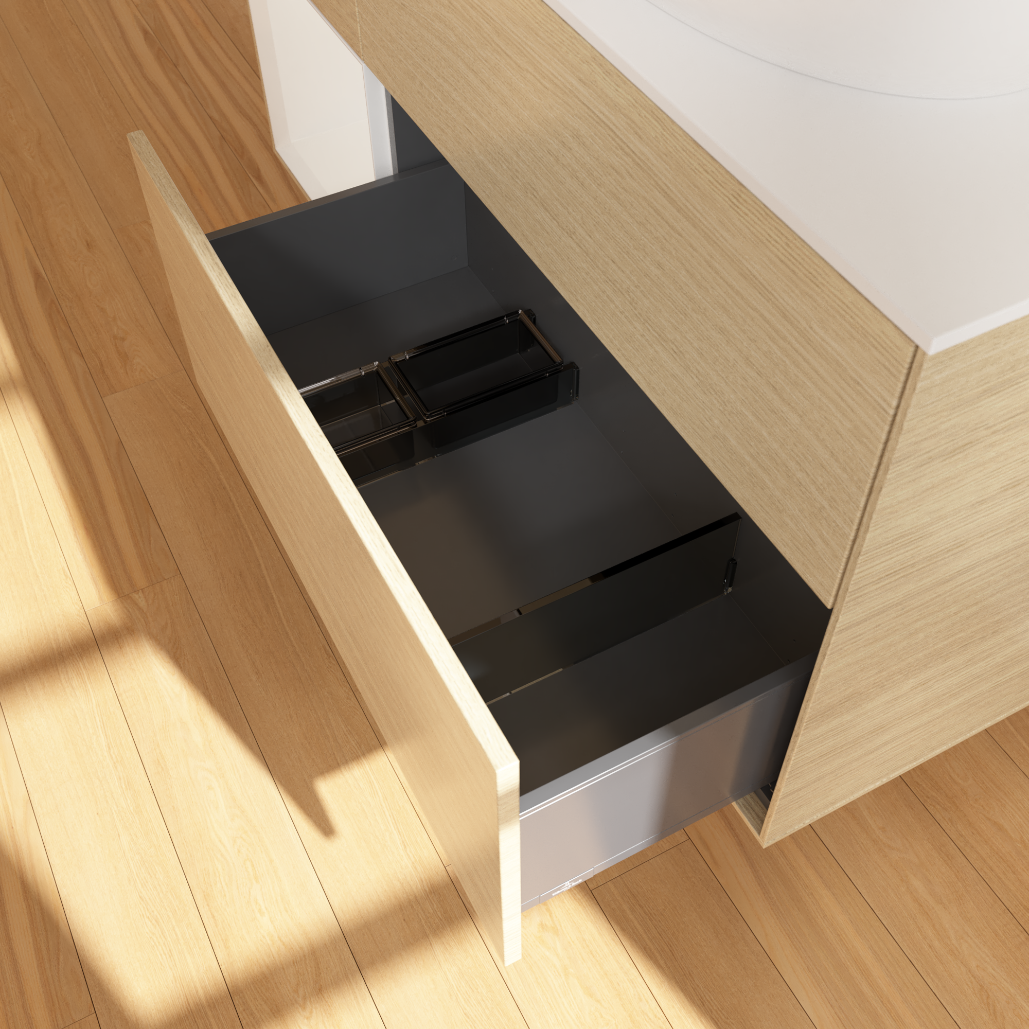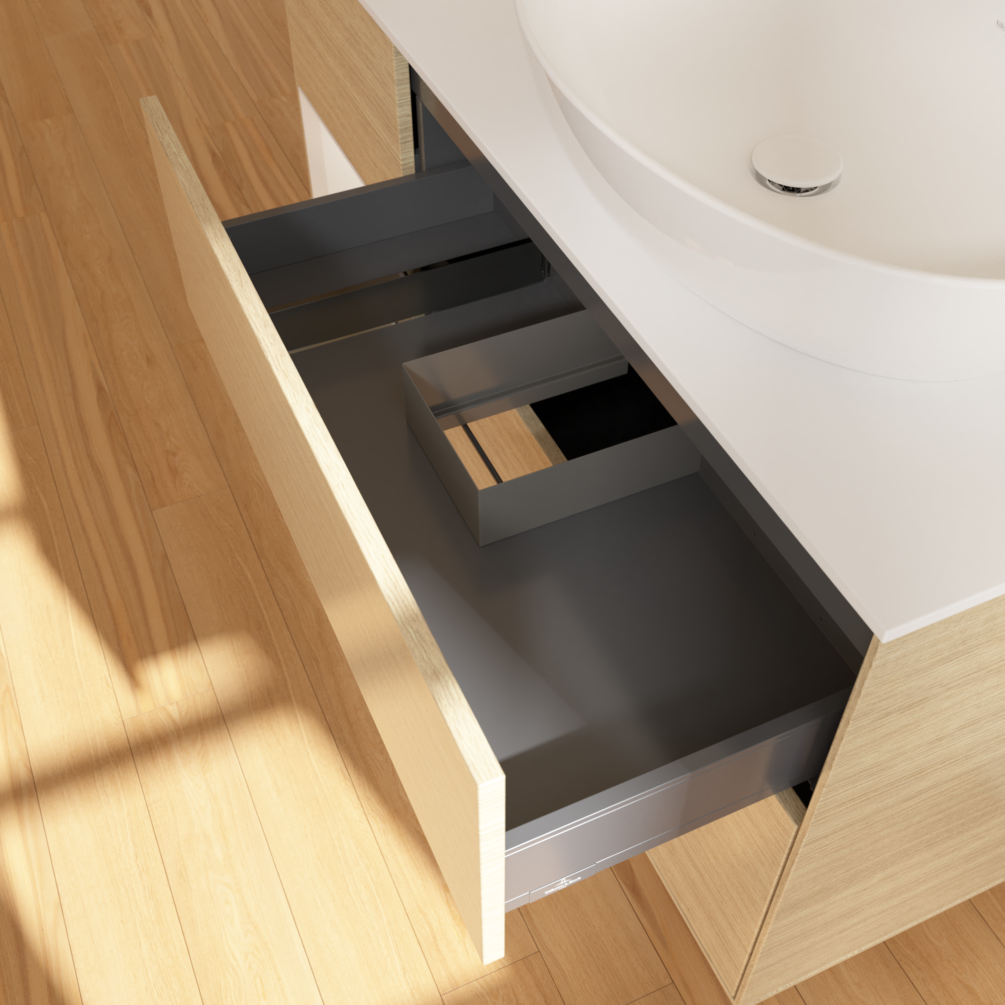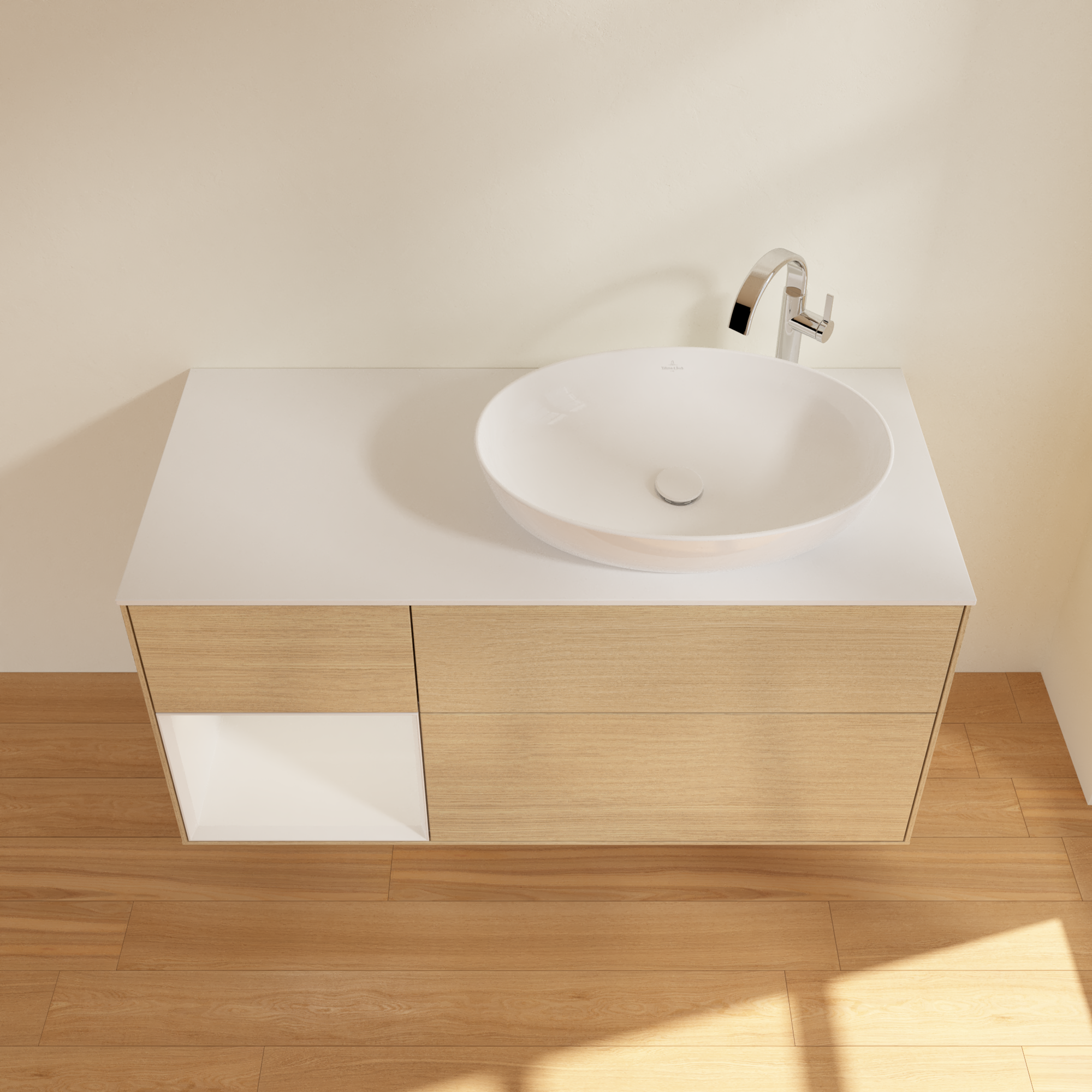 Finion Meuble sous plan, avec éclairage, 3 tiroirs sur rails, 1200x603x501mm, Caisson: Oak Veneer, Façade: Oak Veneer, Élément d’étagère: Glossy White Lacquer, Plaque de recouvrement: Glass White Matt
