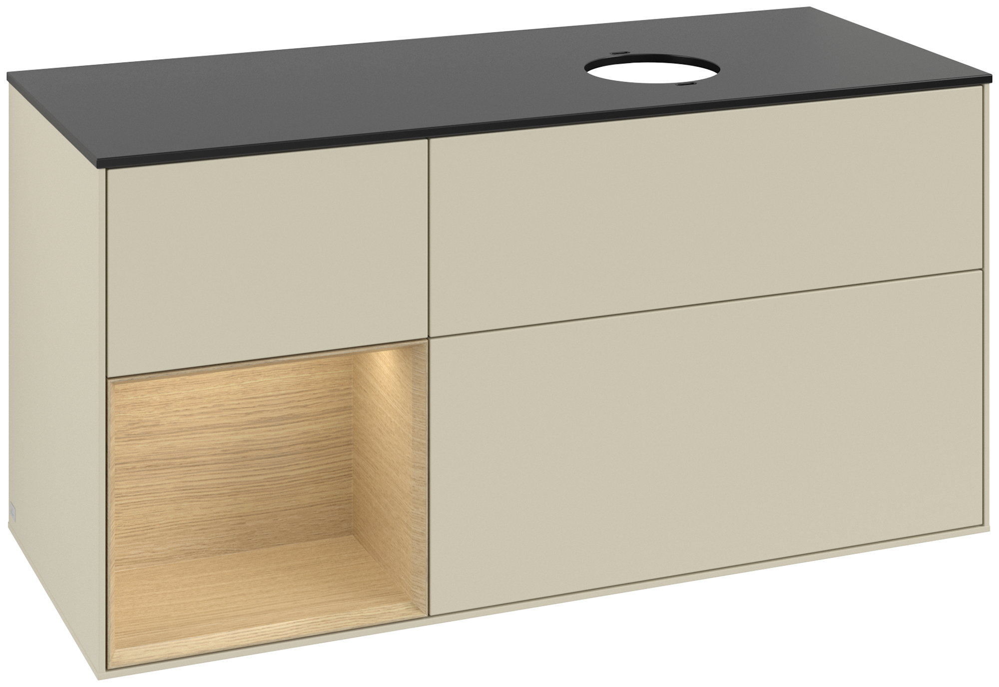 Finion Meuble sous plan, avec éclairage, 3 tiroirs sur rails, 1200x603x501mm, Caisson: Silk Grey Matt Lacquer, Façade: Silk Grey Matt Lacquer, Élément d’étagère: Oak Veneer, Plaque de recouvrement: Glass Black Matt