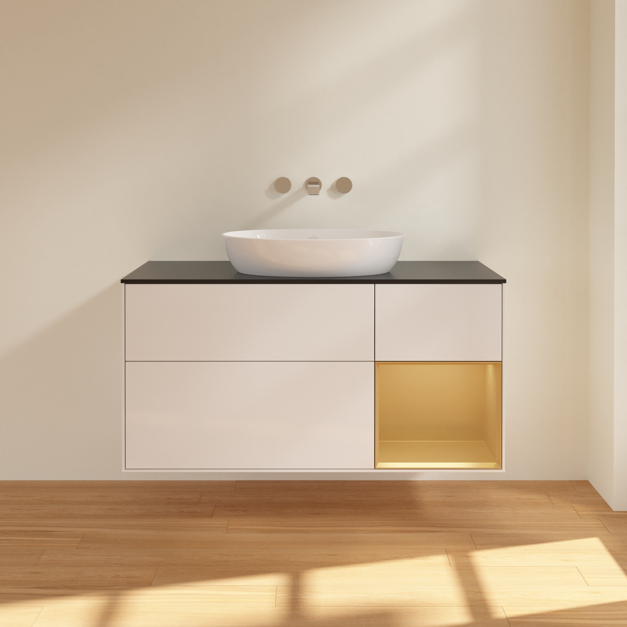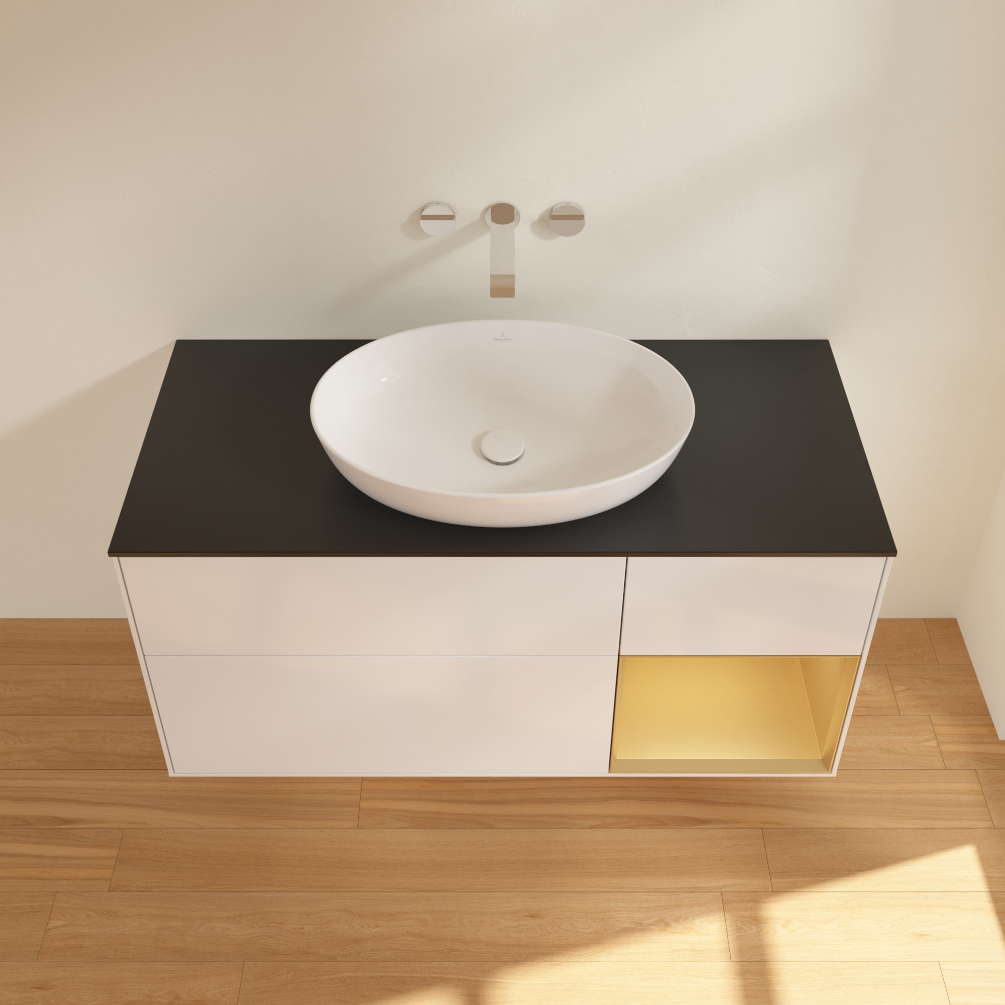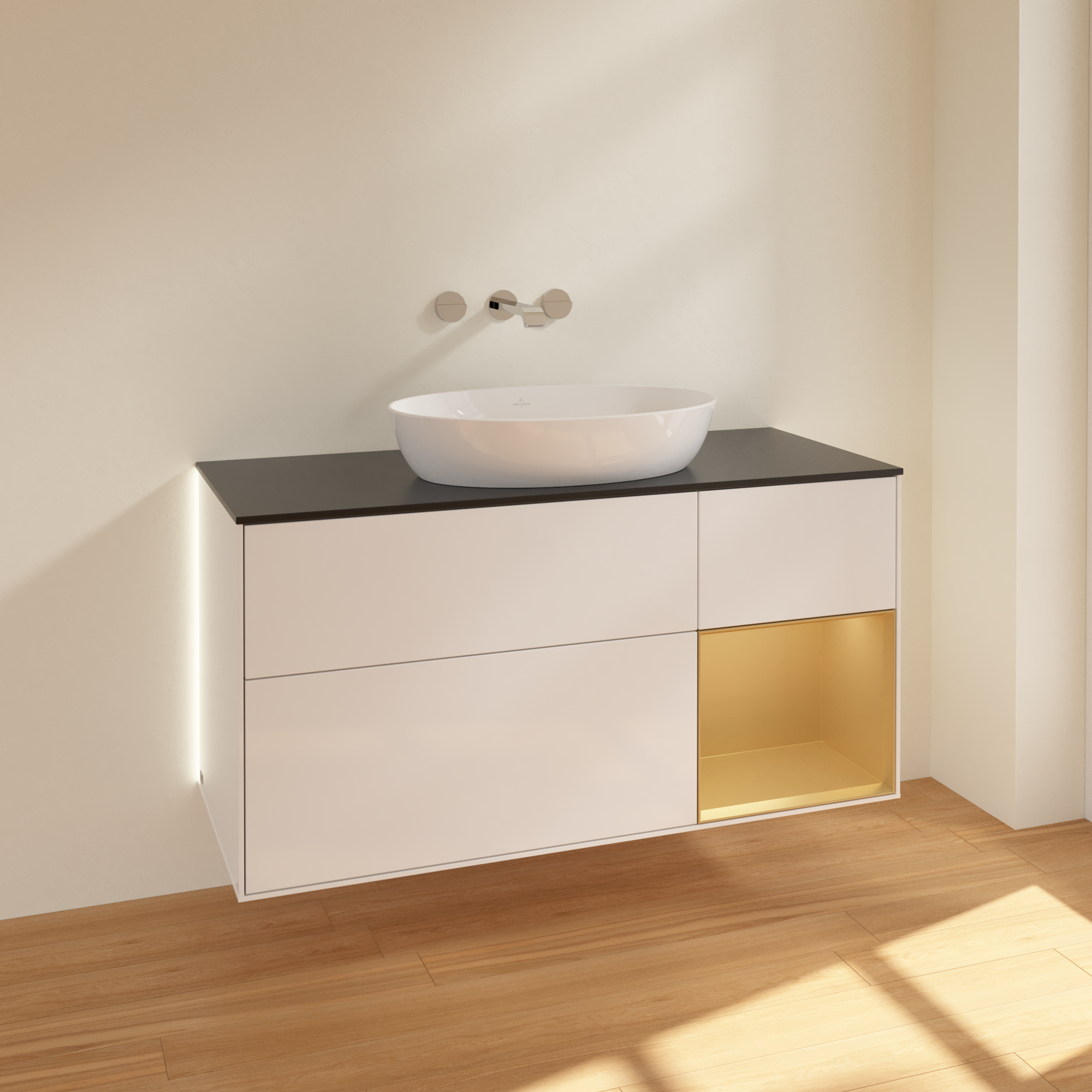 Finion Meuble sous plan, avec éclairage, 3 tiroirs sur rails, 1200x603x501mm, Caisson: Glossy White Lacquer, Façade: Glossy White Lacquer, Élément d’étagère: Gold Matt Lacquer, Plaque de recouvrement: Glass Black Matt