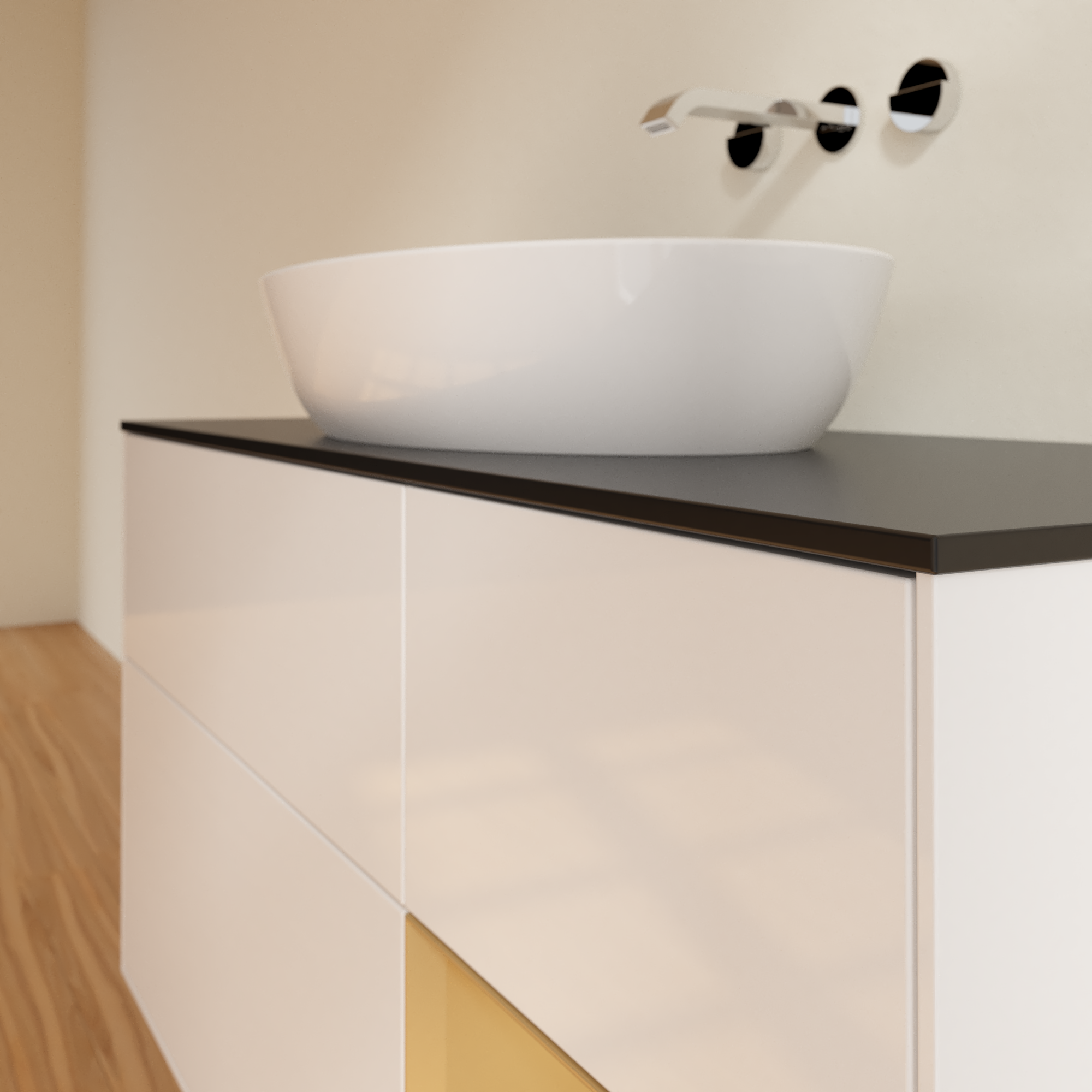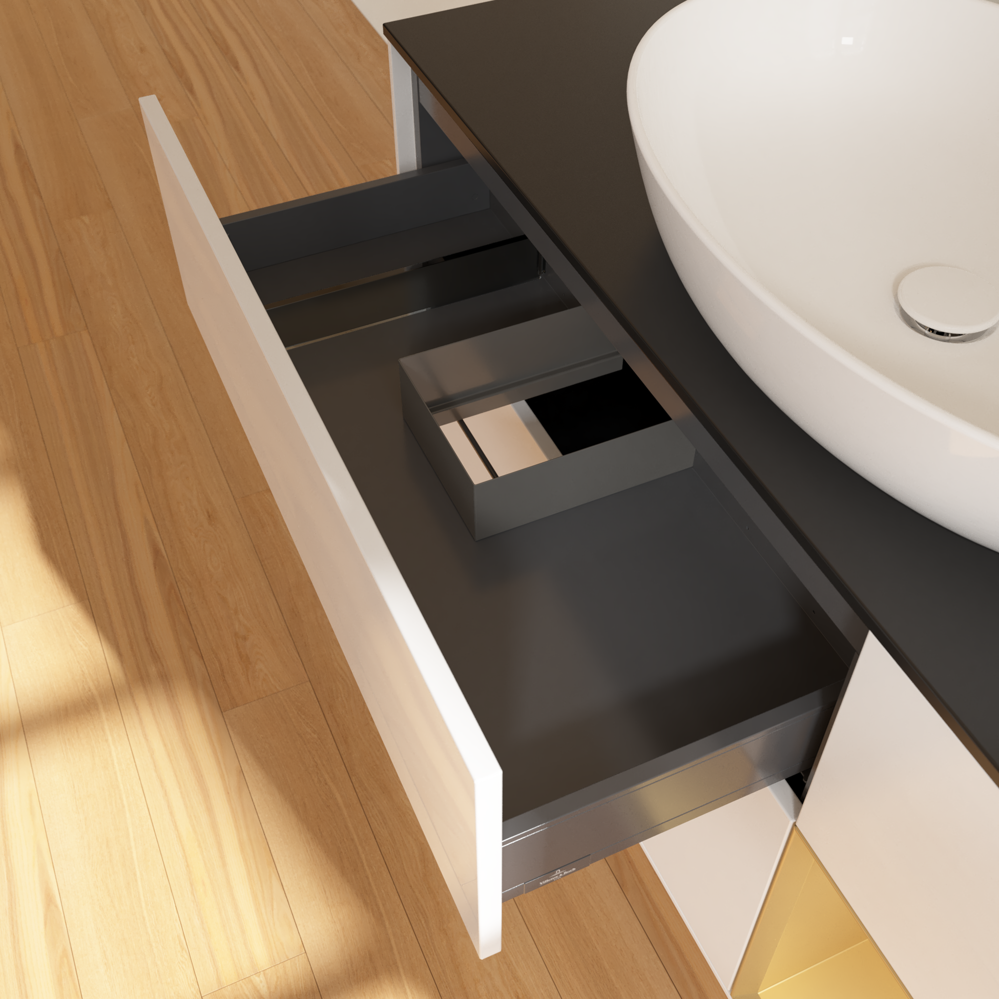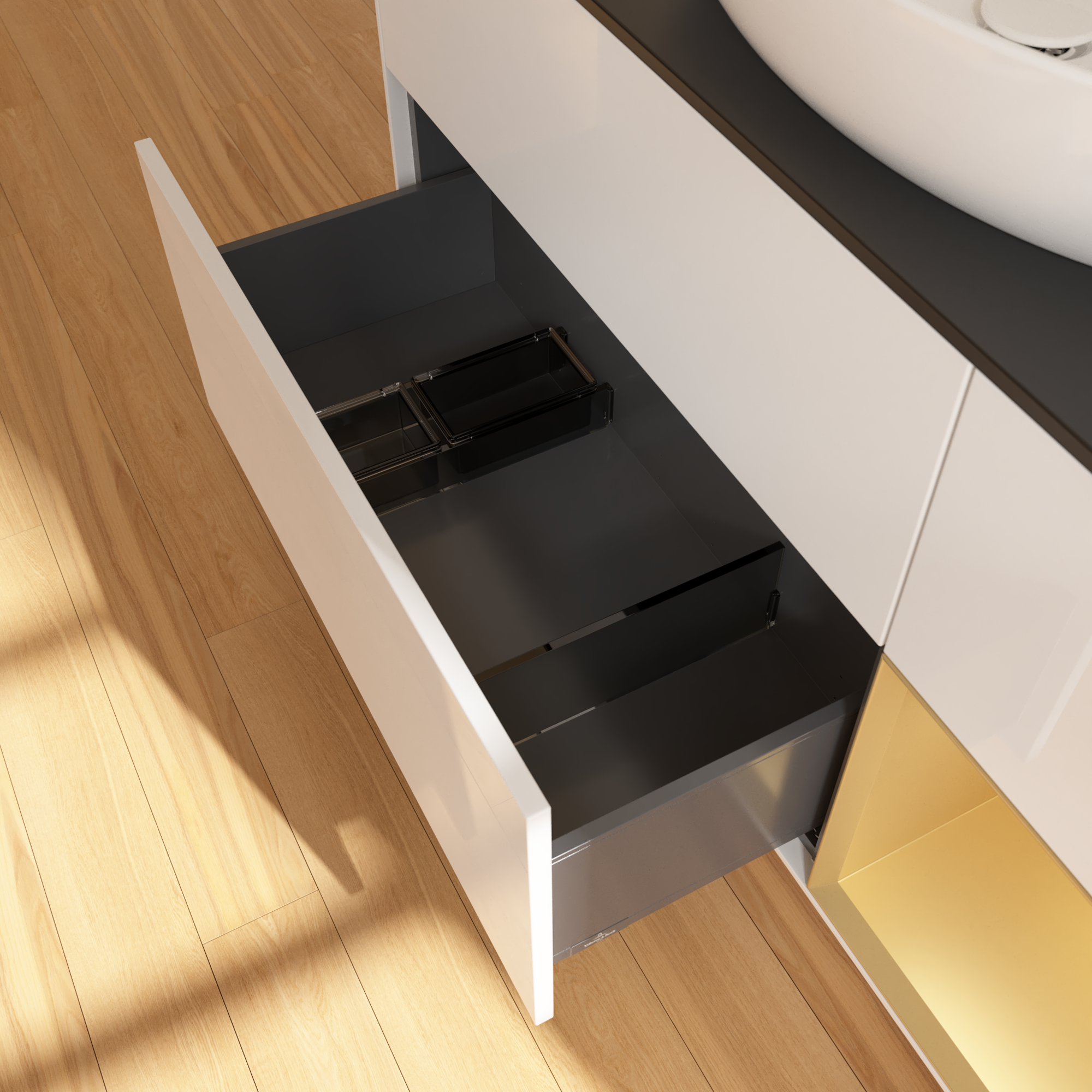 Finion Meuble sous plan, avec éclairage, 3 tiroirs sur rails, 1200x603x501mm, Caisson: Glossy White Lacquer, Façade: Glossy White Lacquer, Élément d’étagère: Gold Matt Lacquer, Plaque de recouvrement: Glass Black Matt