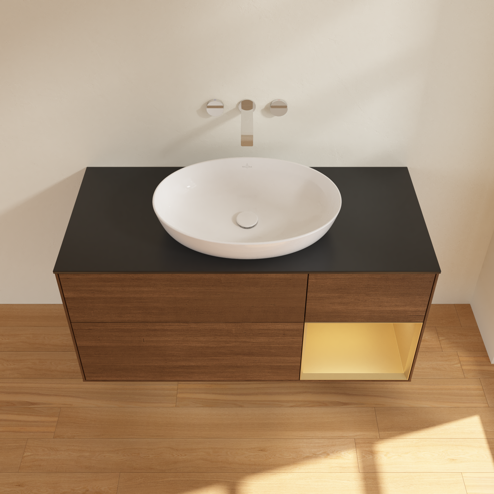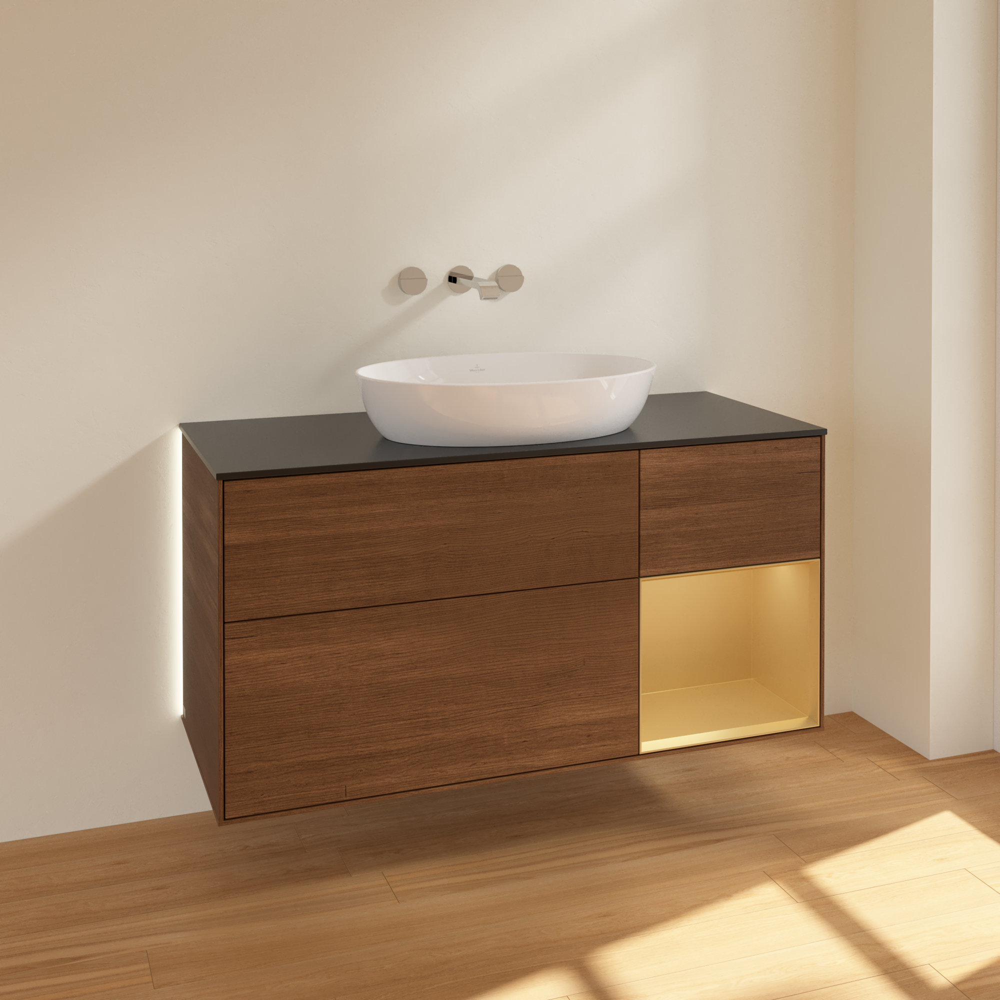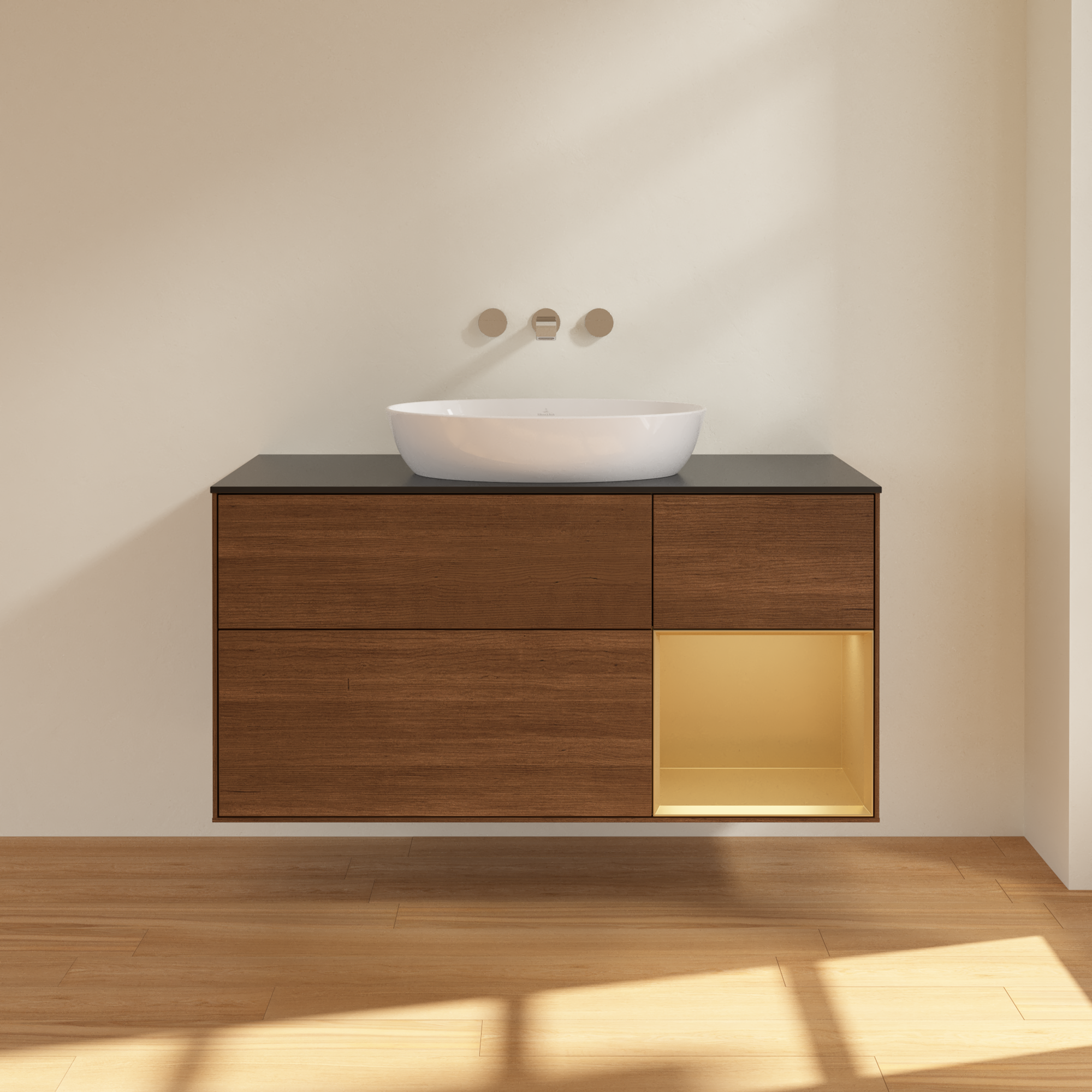 Finion Meuble sous plan, avec éclairage, 3 tiroirs sur rails, 1200x603x501mm, Caisson: Walnut Veneer, Façade: Walnut Veneer, Élément d’étagère: Gold Matt Lacquer, Plaque de recouvrement: Glass Black Matt