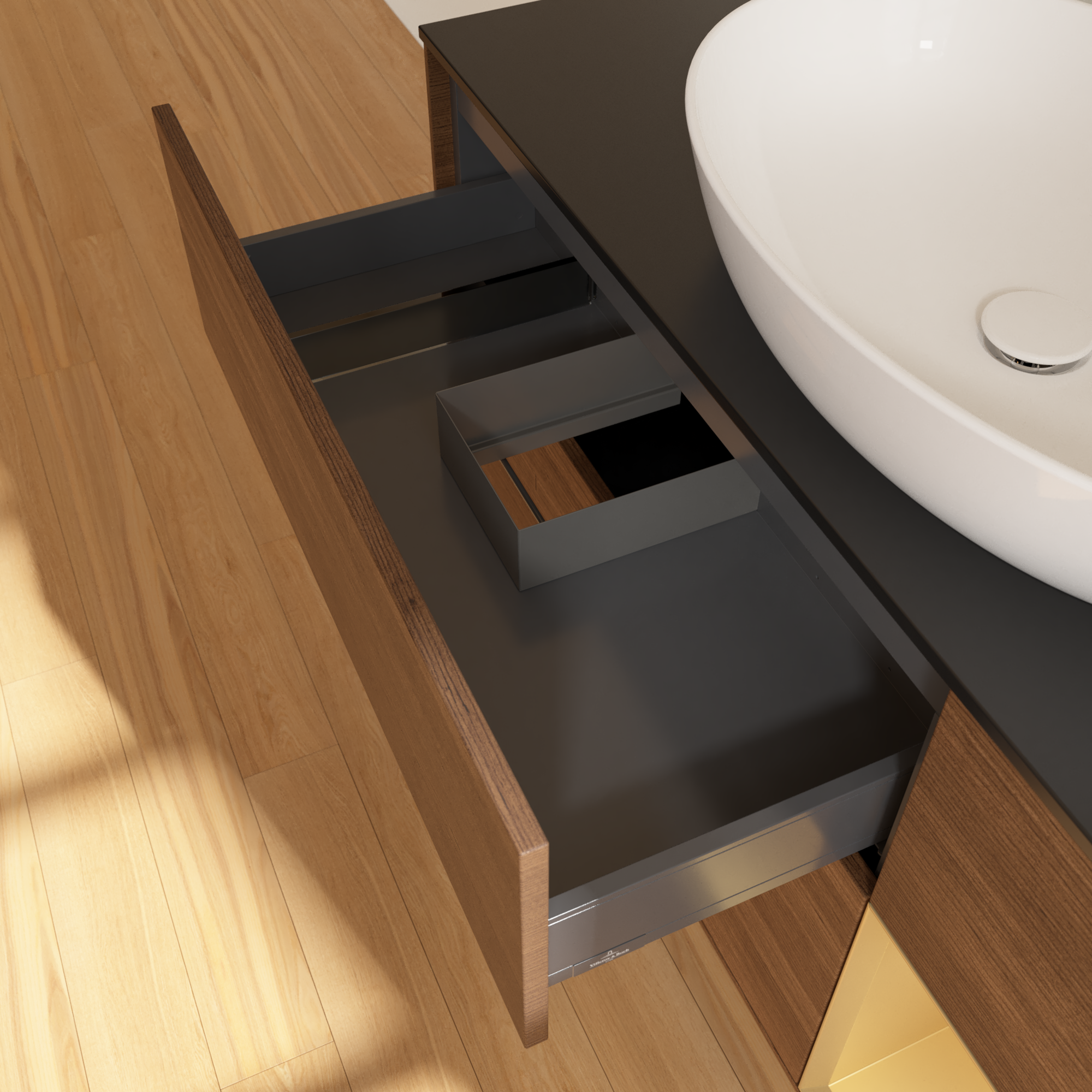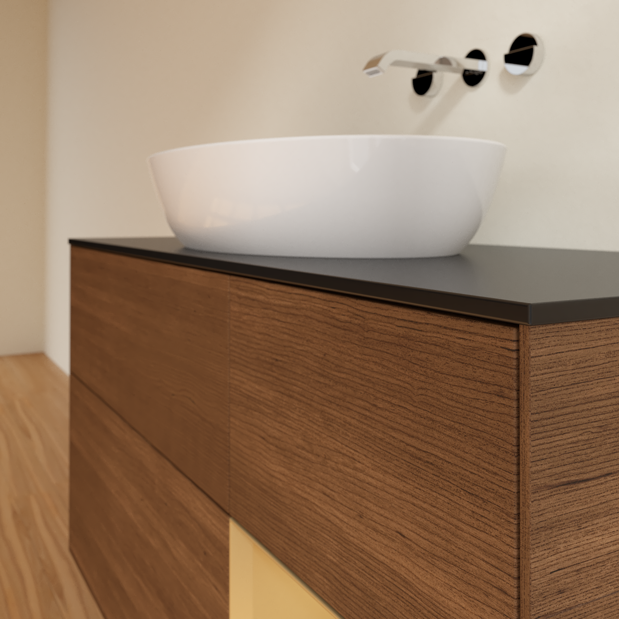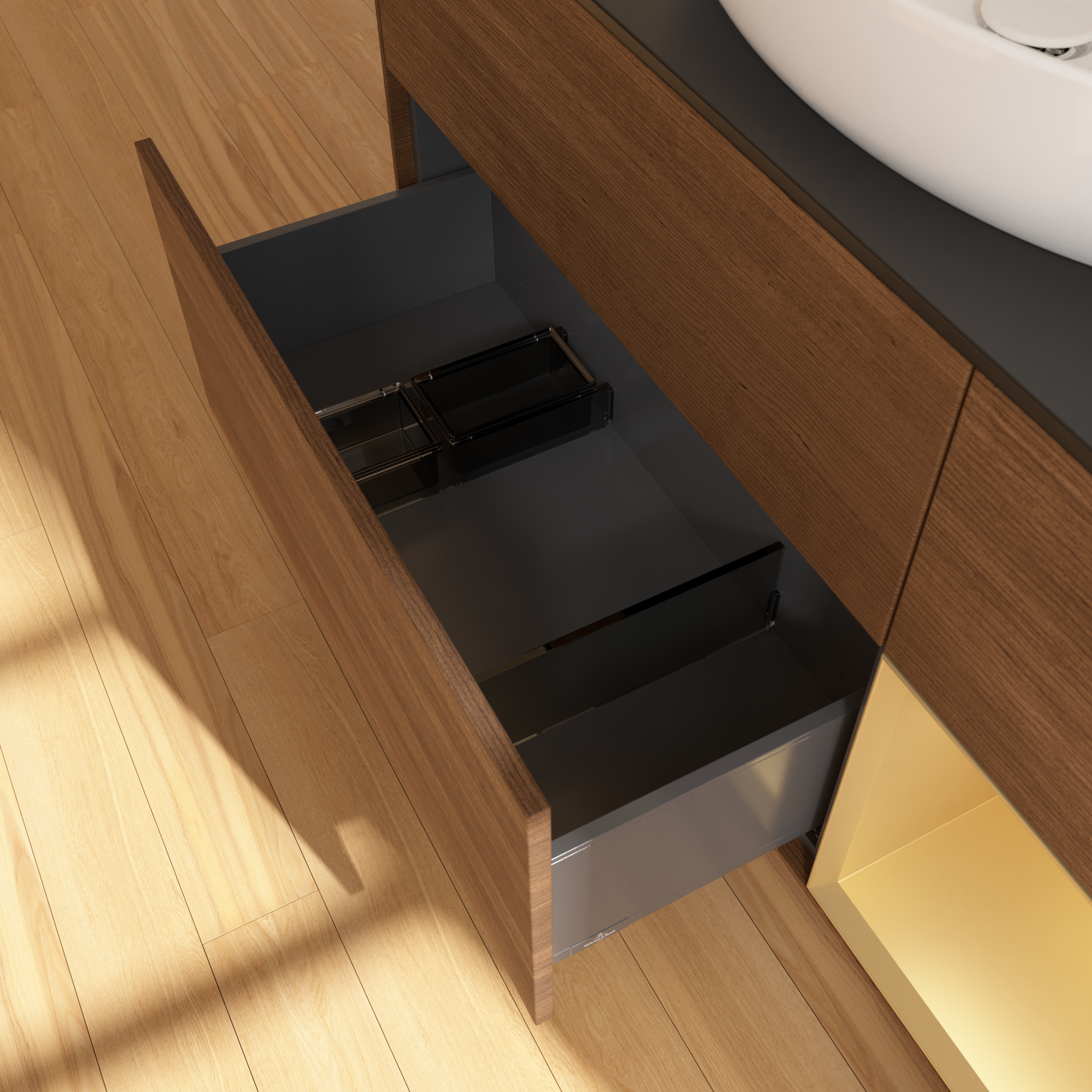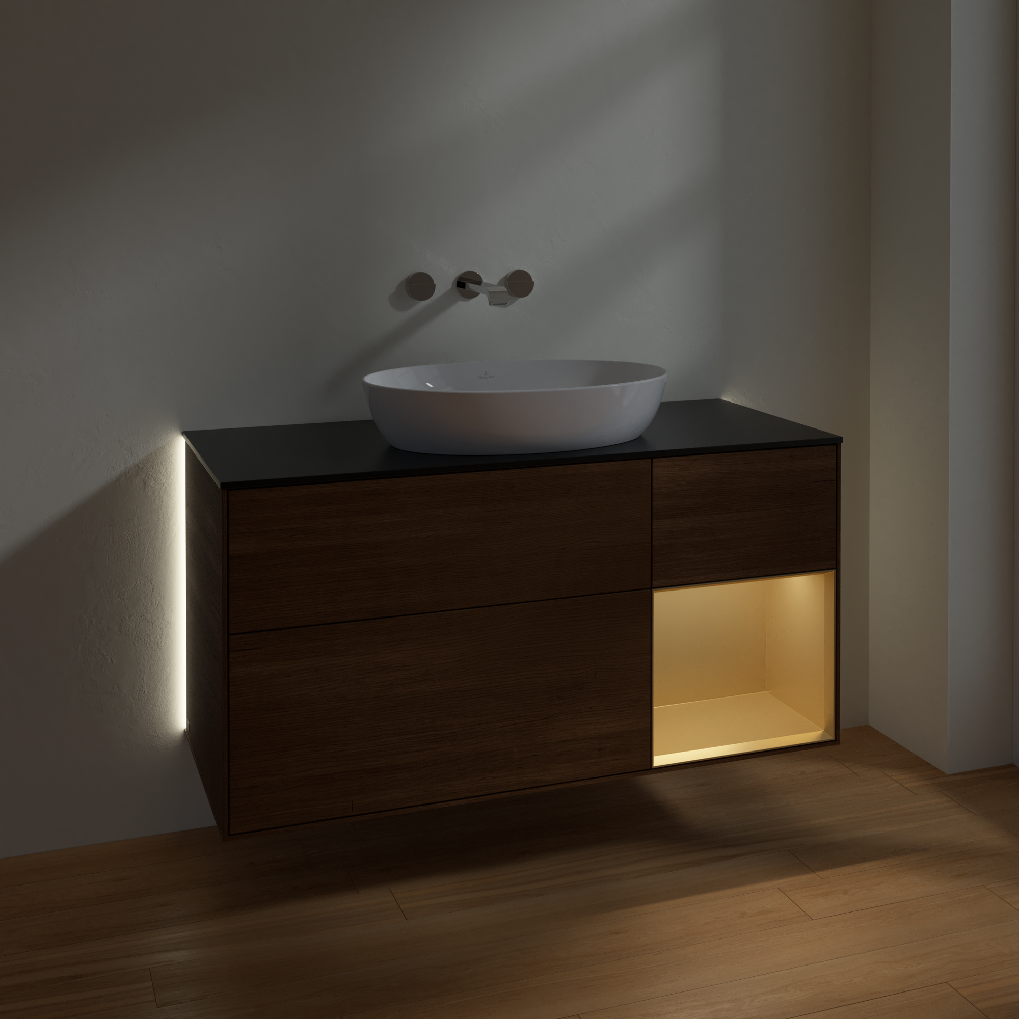 Finion Meuble sous plan, avec éclairage, 3 tiroirs sur rails, 1200x603x501mm, Caisson: Walnut Veneer, Façade: Walnut Veneer, Élément d’étagère: Gold Matt Lacquer, Plaque de recouvrement: Glass Black Matt
