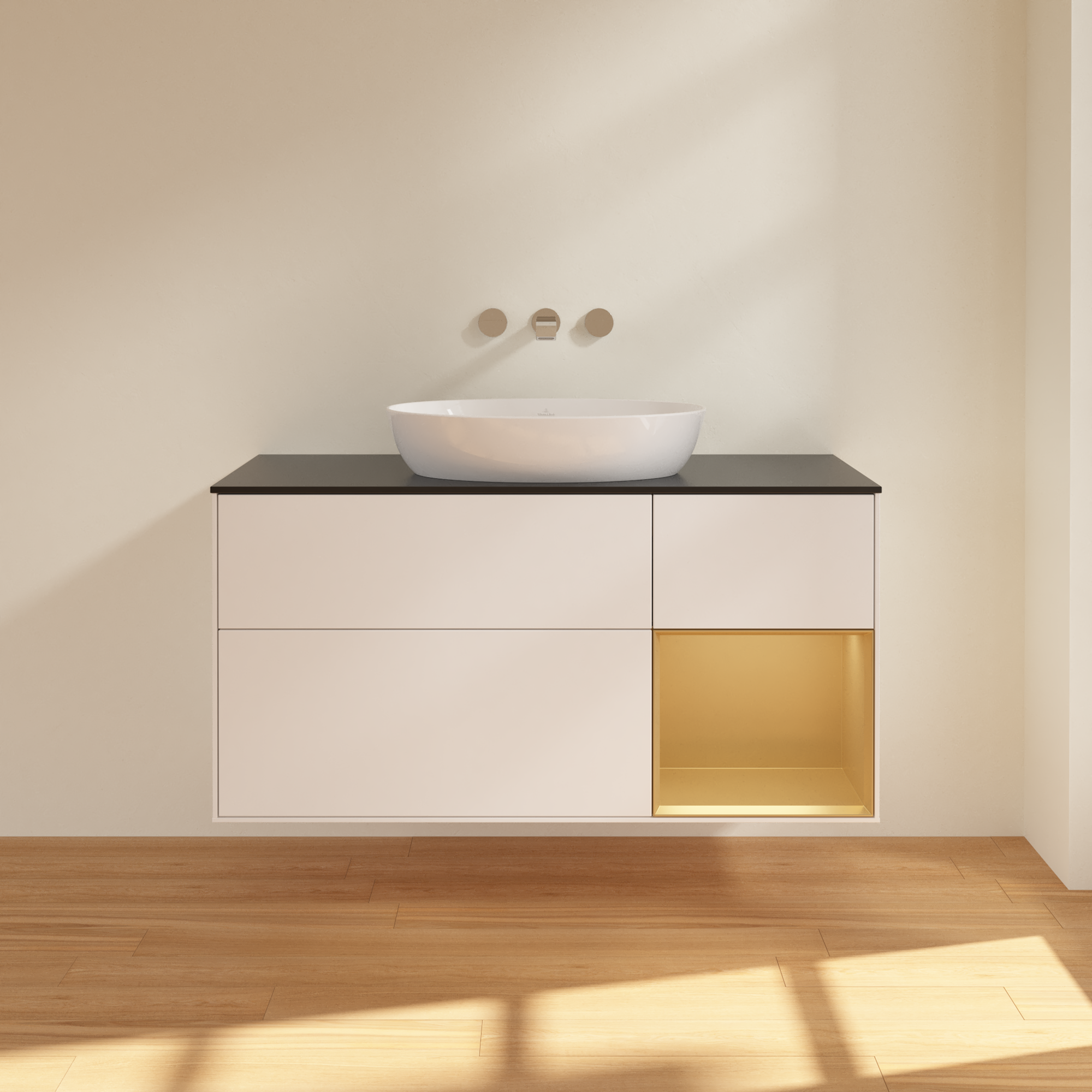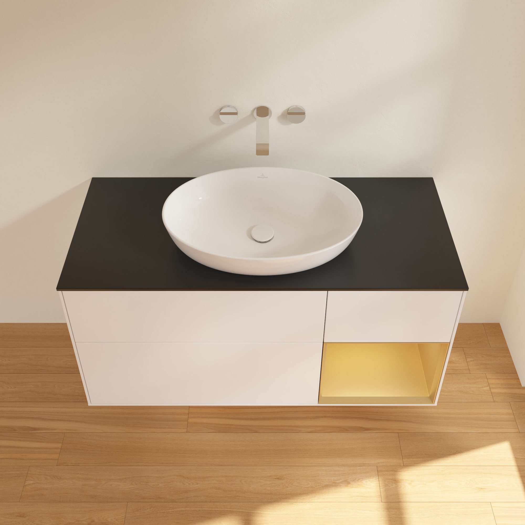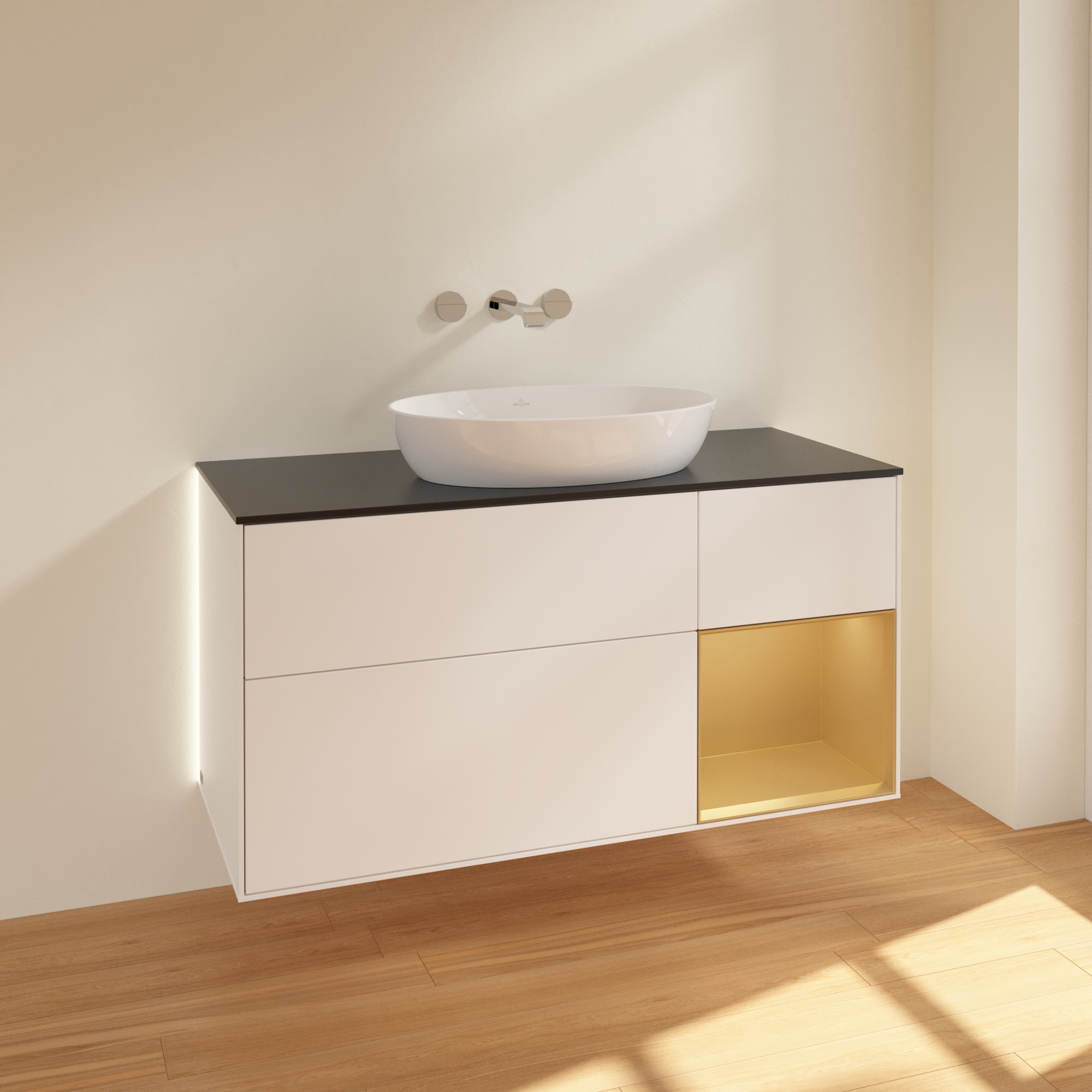 Finion Meuble sous plan, avec éclairage, 3 tiroirs sur rails, 1200x603x501mm, Caisson: White Matt Lacquer, Façade: White Matt Lacquer, Élément d’étagère: Gold Matt Lacquer, Plaque de recouvrement: Glass Black Matt