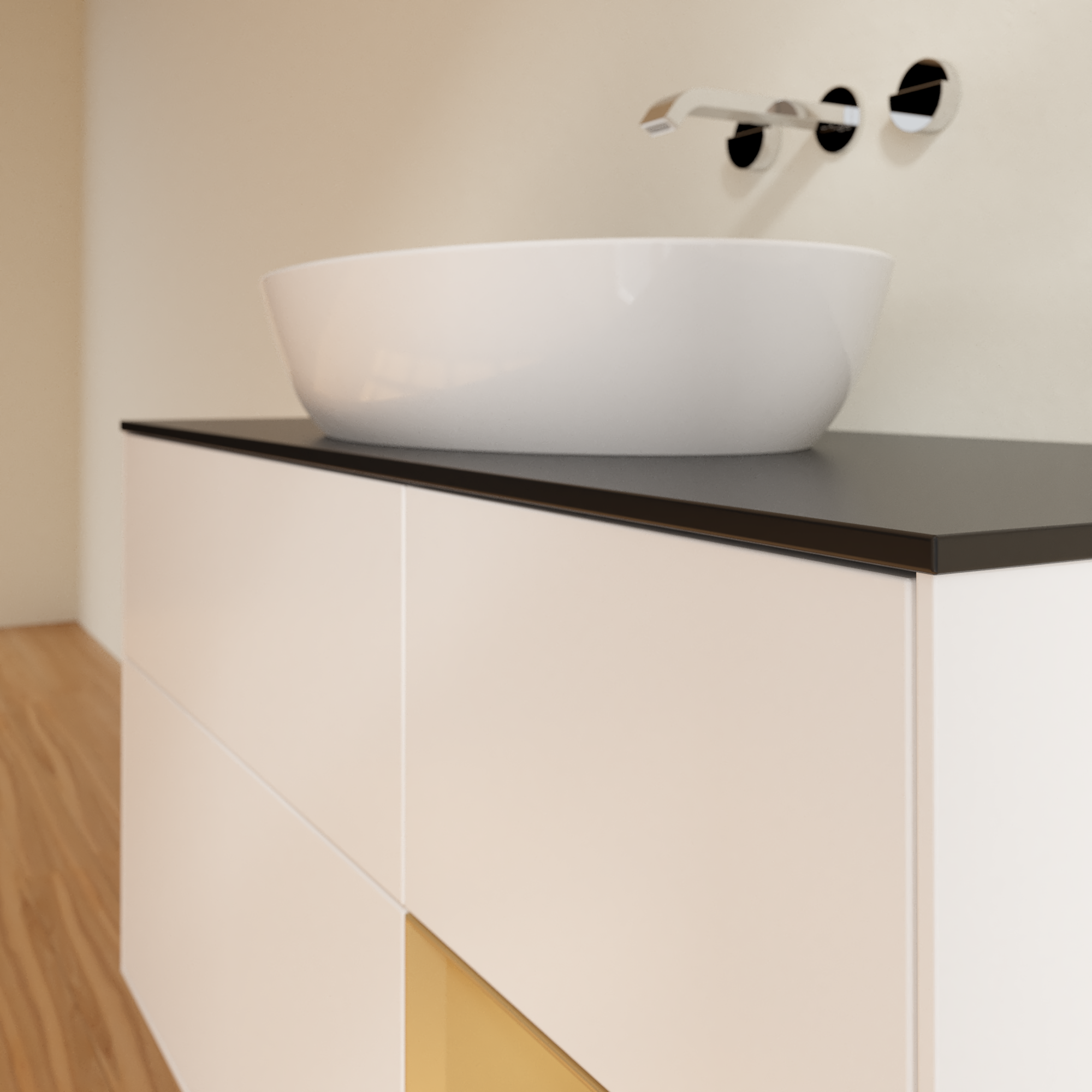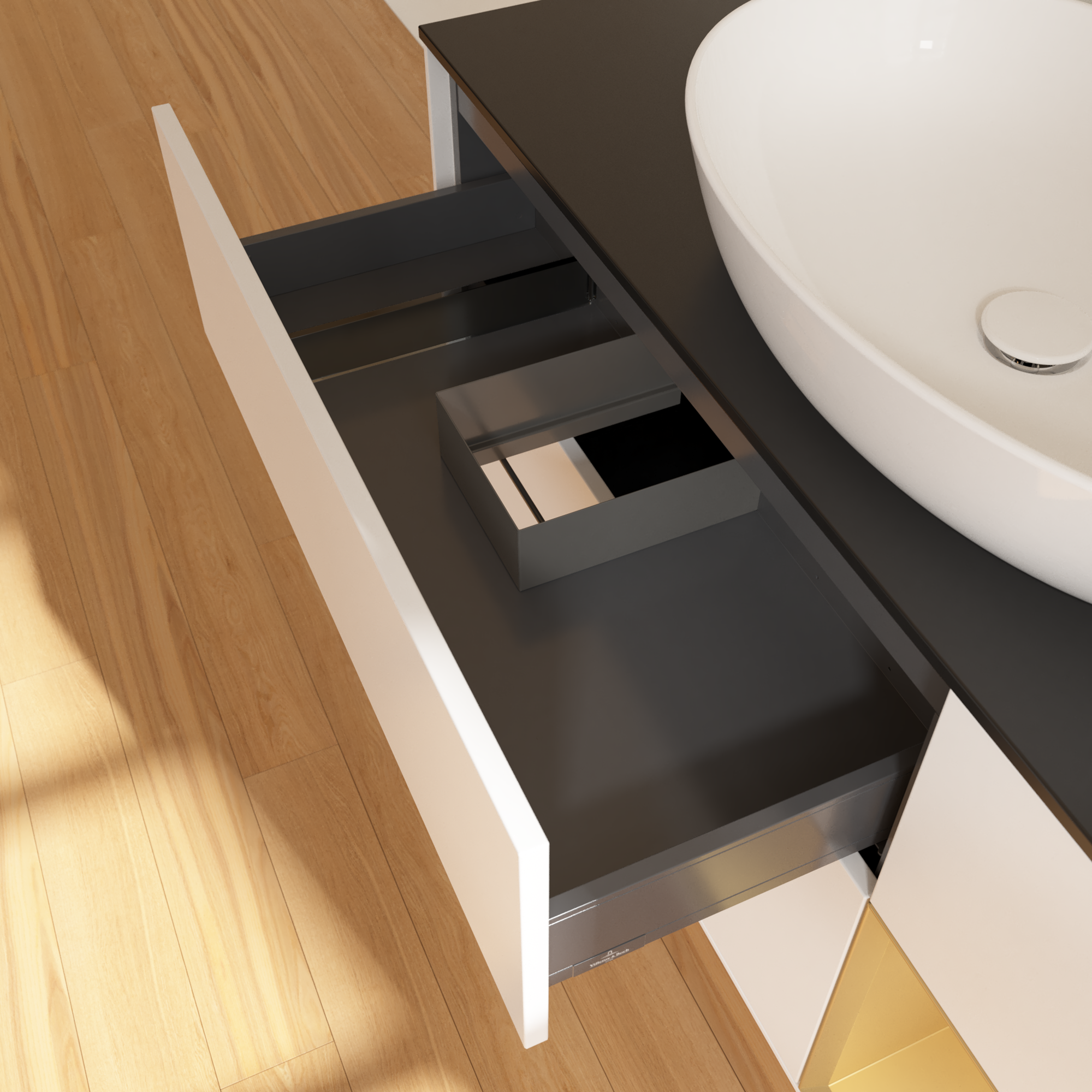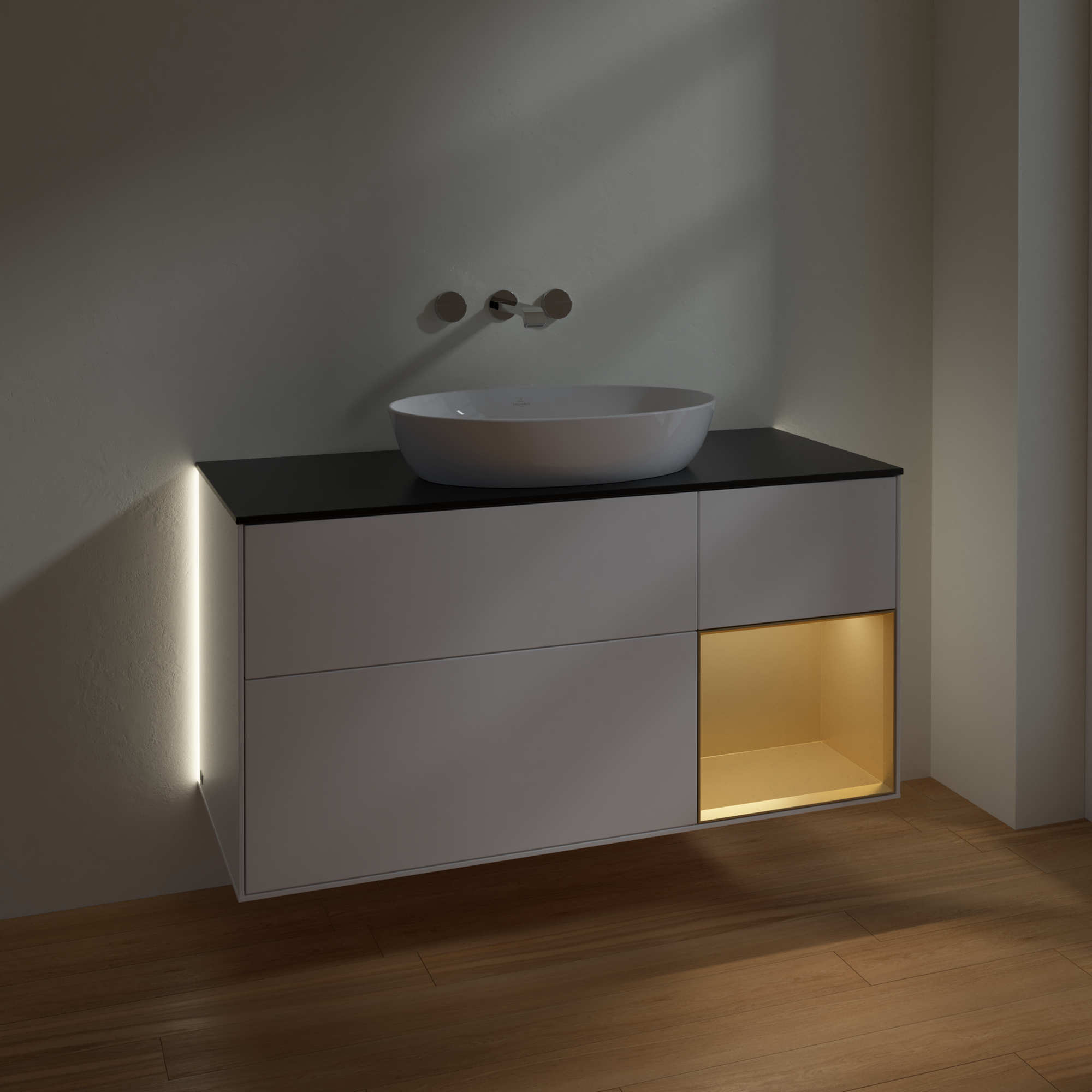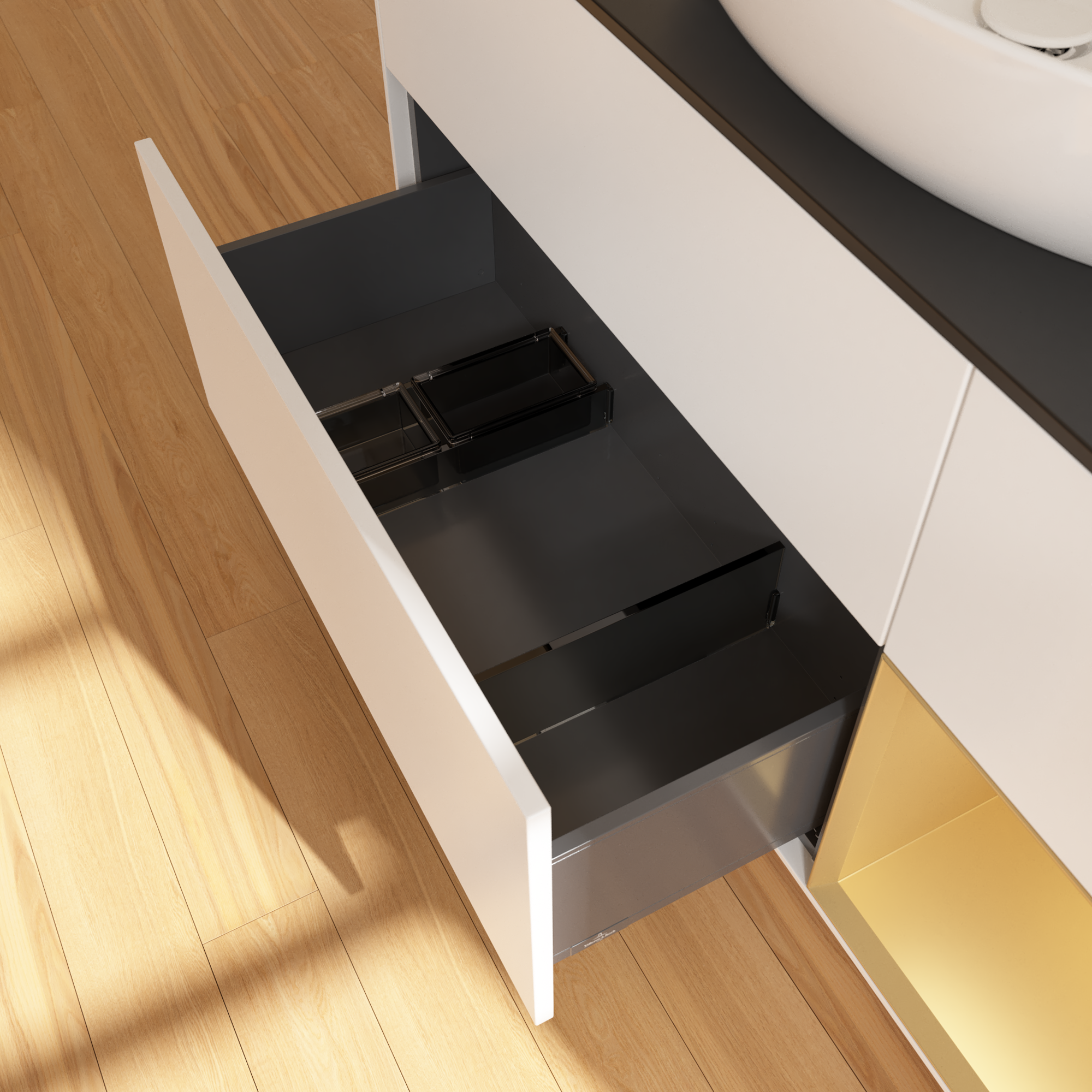 Finion Meuble sous plan, avec éclairage, 3 tiroirs sur rails, 1200x603x501mm, Caisson: White Matt Lacquer, Façade: White Matt Lacquer, Élément d’étagère: Gold Matt Lacquer, Plaque de recouvrement: Glass Black Matt