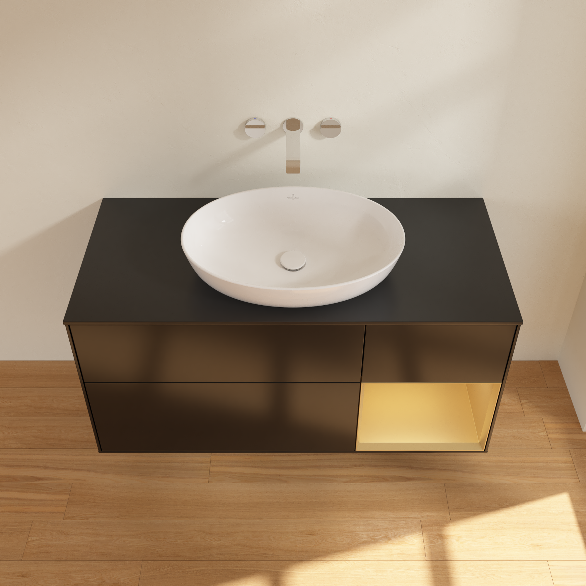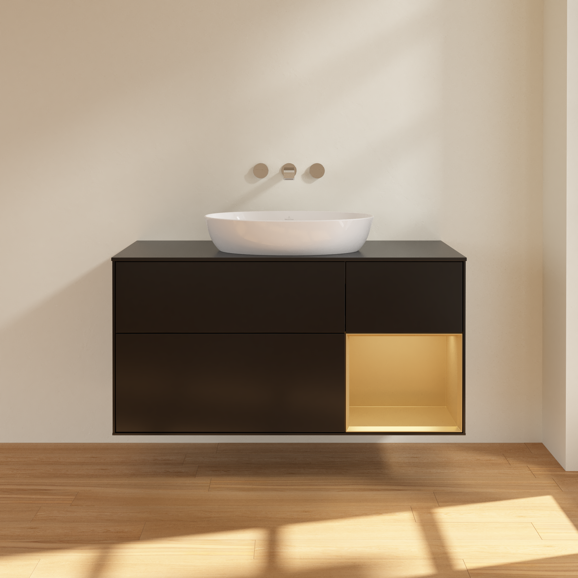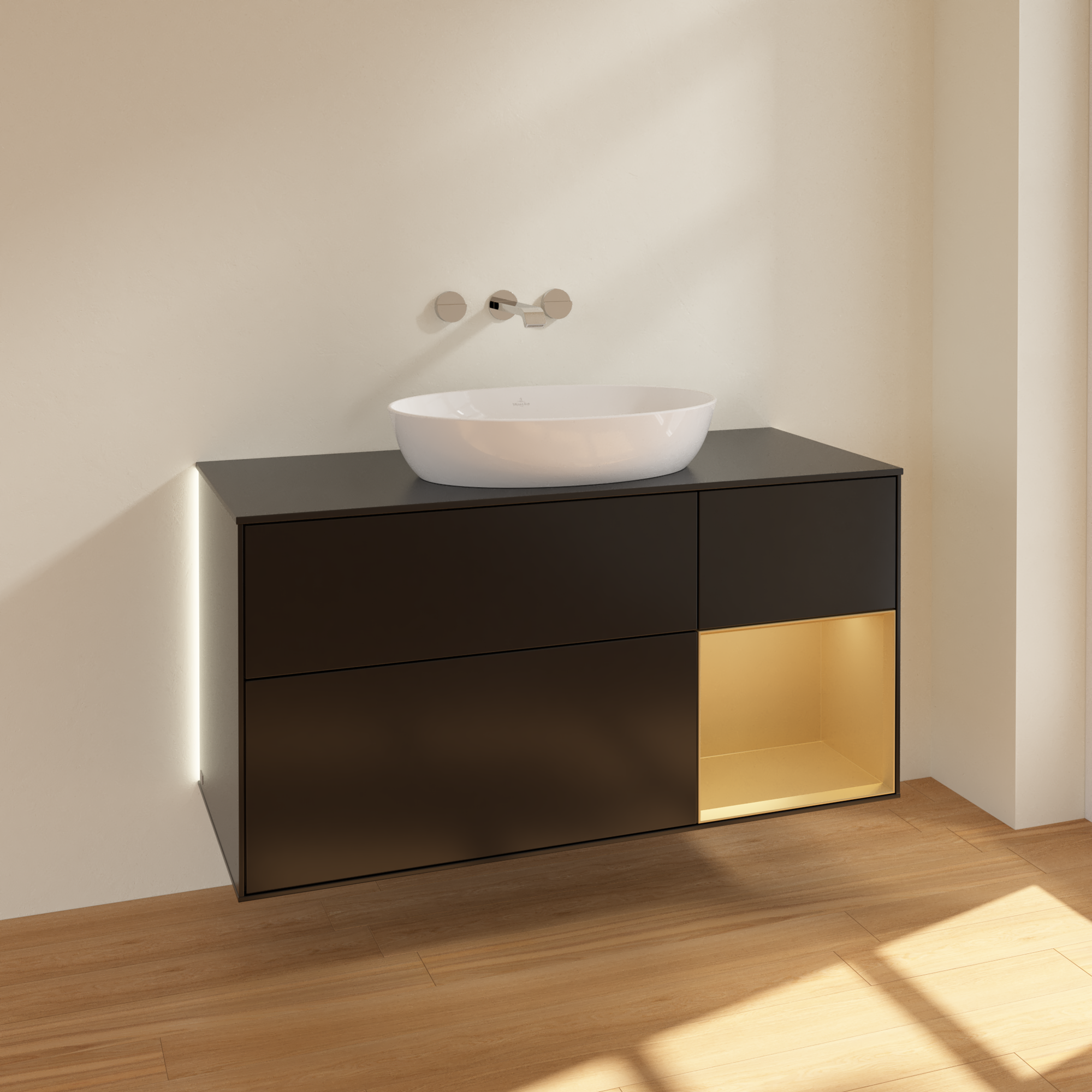 Finion Meuble sous plan, avec éclairage, 3 tiroirs sur rails, 1200x603x501mm, Caisson: Black Matt Lacquer, Façade: Black Matt Lacquer, Élément d’étagère: Gold Matt Lacquer, Plaque de recouvrement: Glass Black Matt