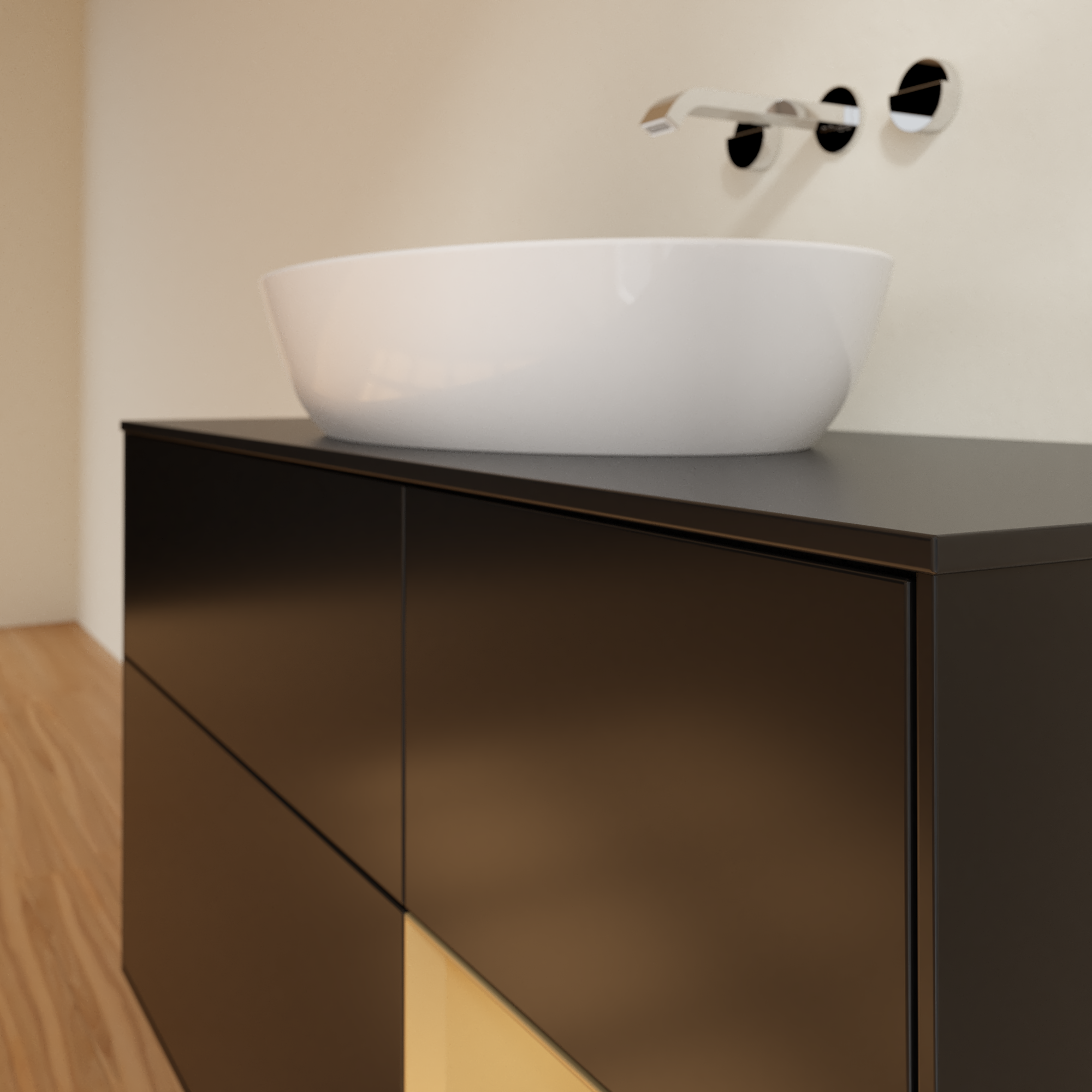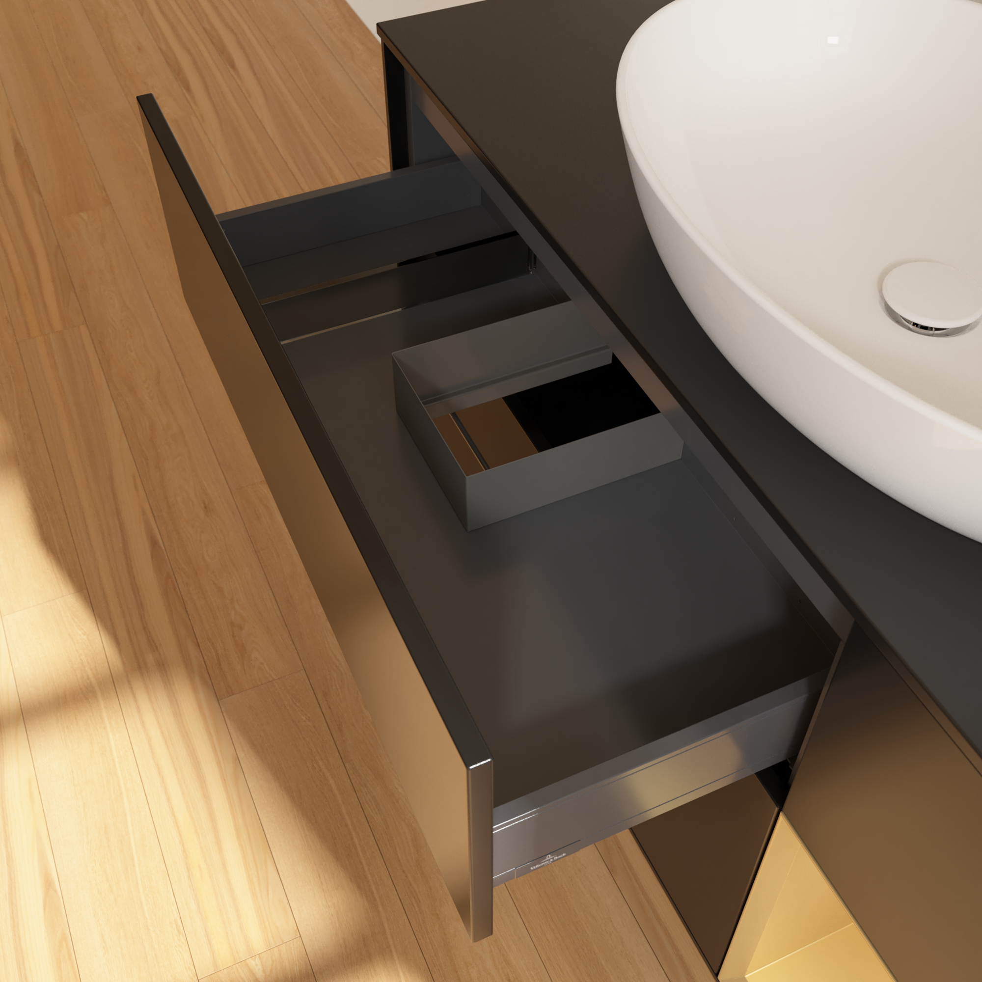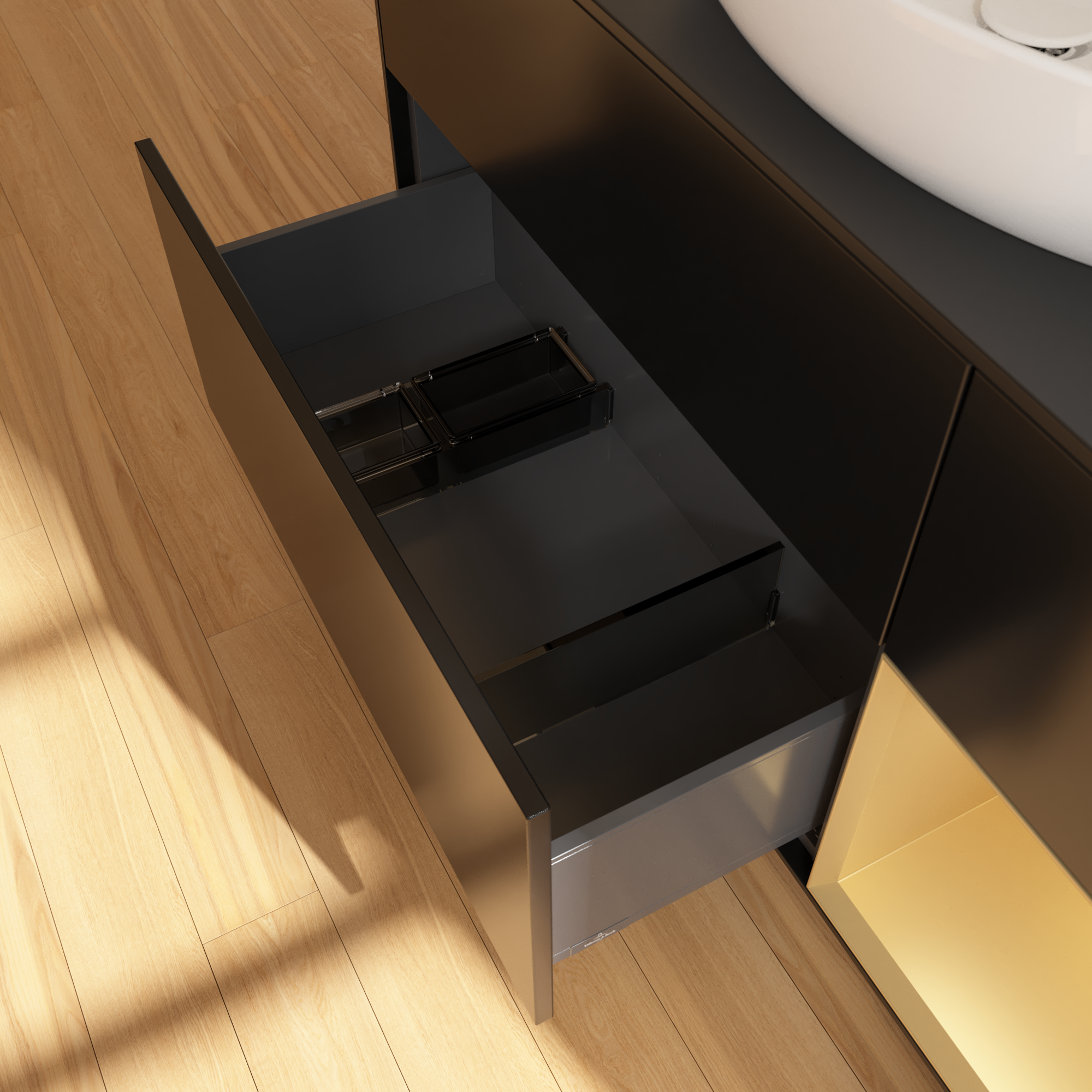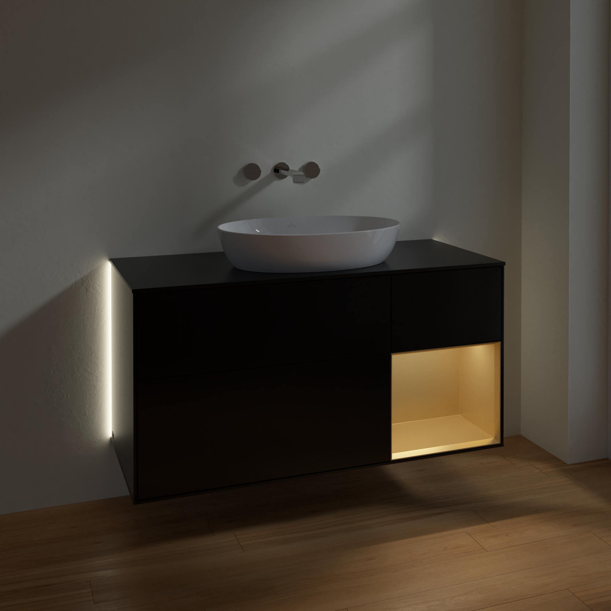 Finion Meuble sous plan, avec éclairage, 3 tiroirs sur rails, 1200x603x501mm, Caisson: Black Matt Lacquer, Façade: Black Matt Lacquer, Élément d’étagère: Gold Matt Lacquer, Plaque de recouvrement: Glass Black Matt