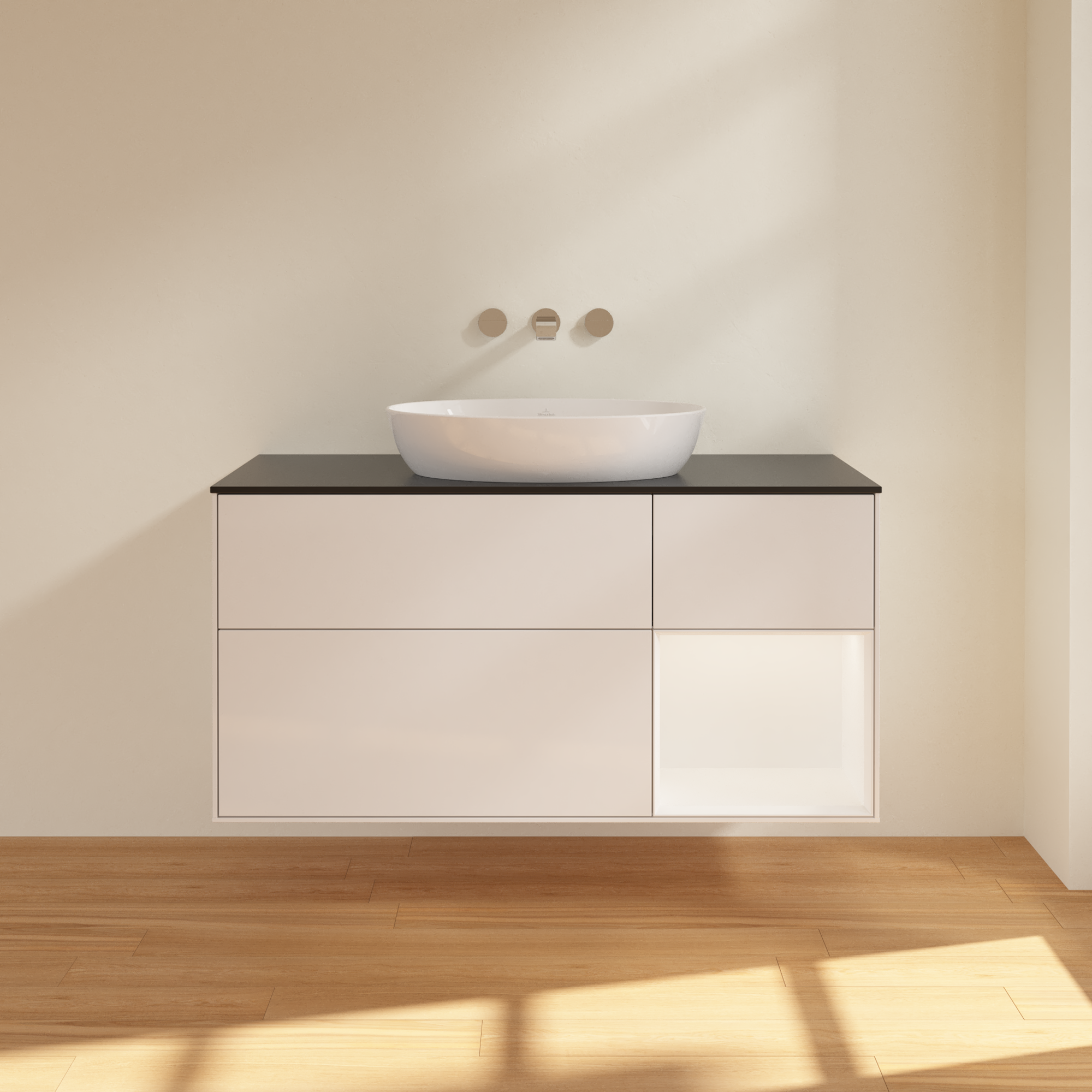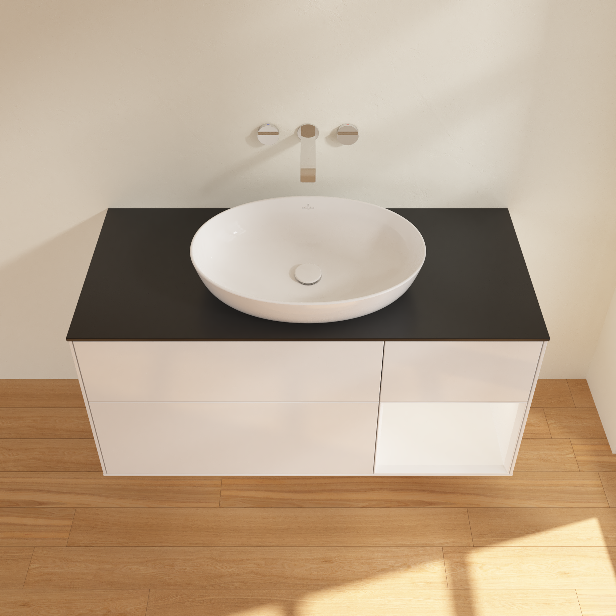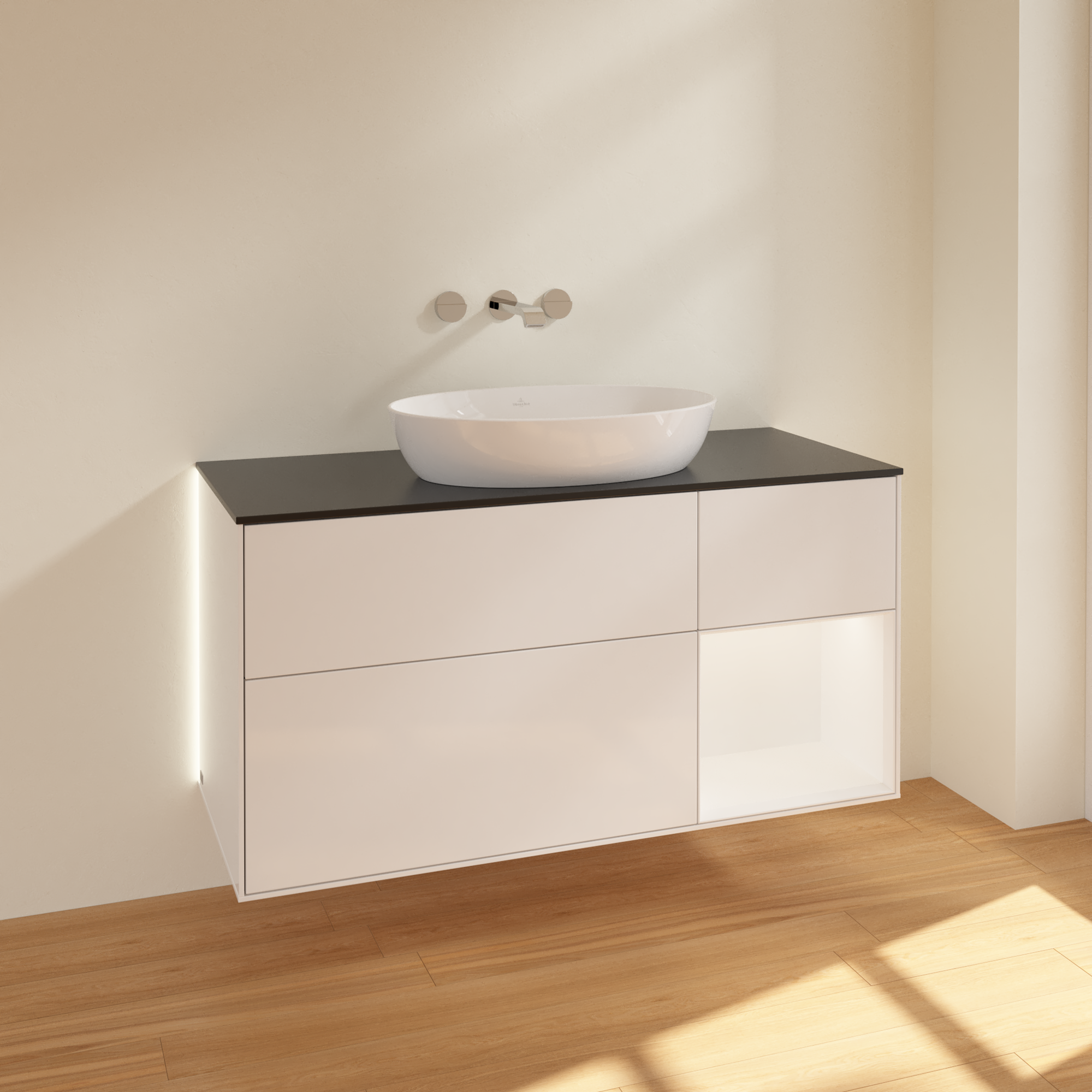 Finion Meuble sous plan, avec éclairage, 3 tiroirs sur rails, 1200x603x501mm, Caisson: Glossy White Lacquer, Façade: Glossy White Lacquer, Élément d’étagère: White Matt Lacquer, Plaque de recouvrement: Glass Black Matt