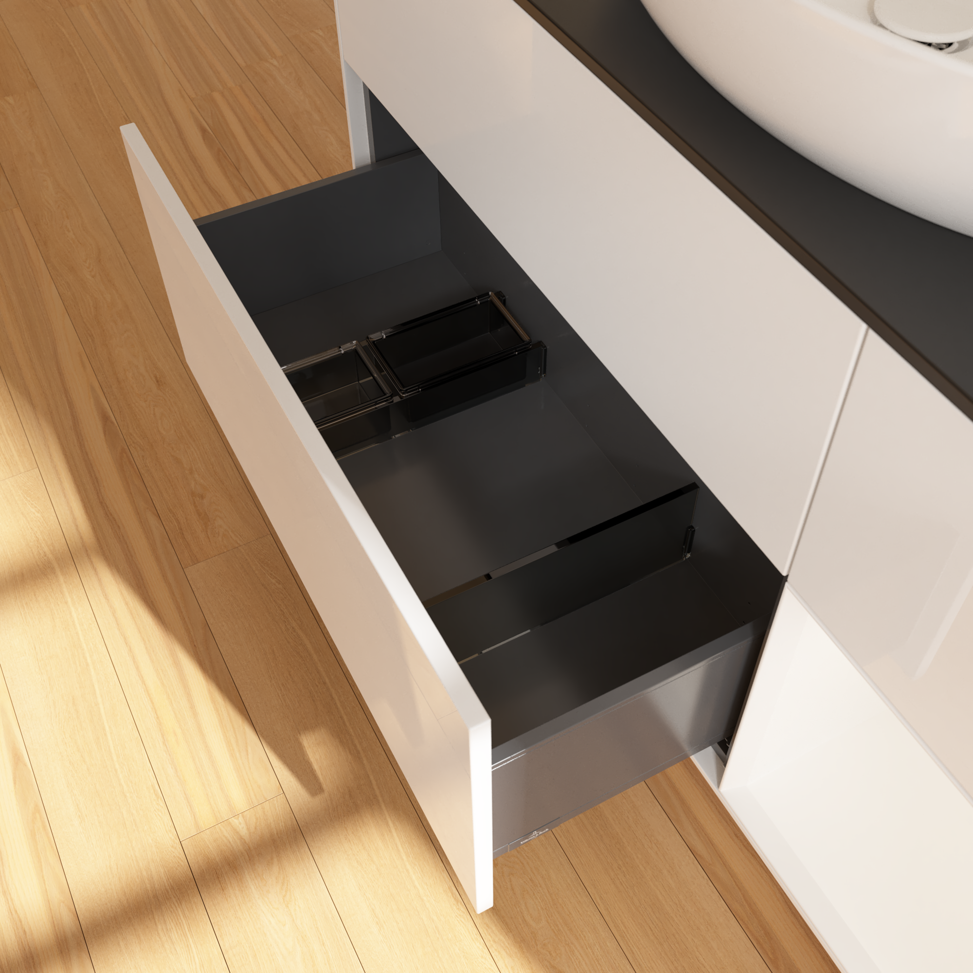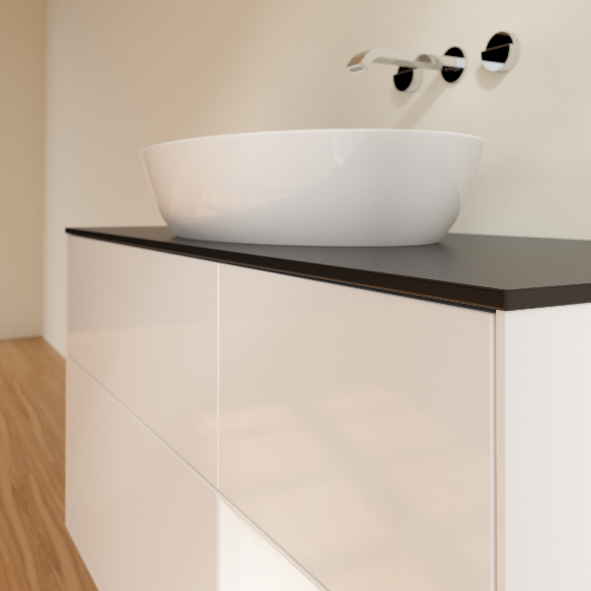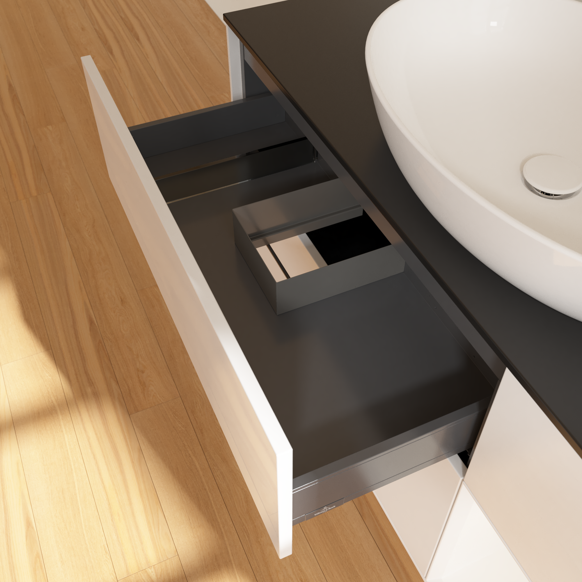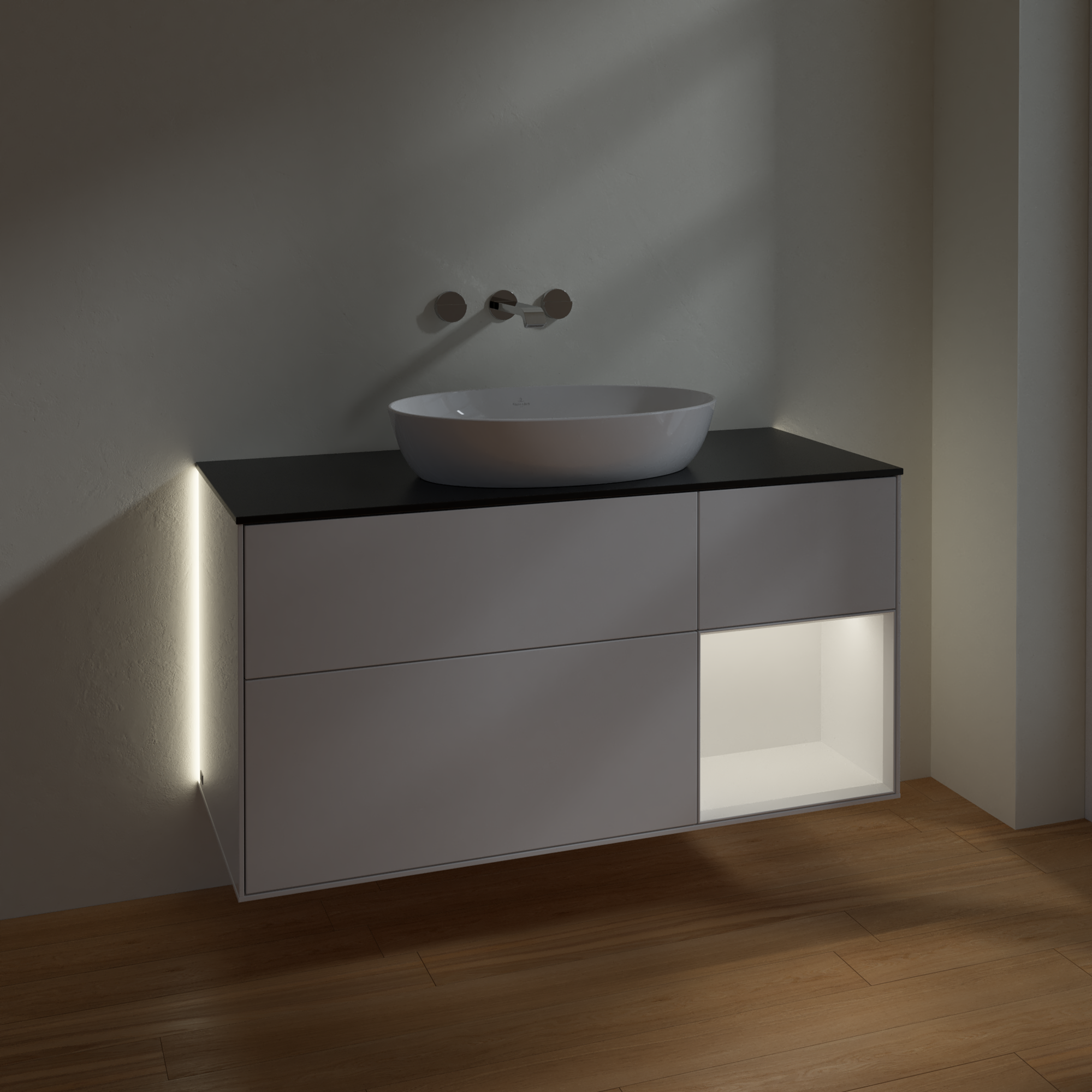 Finion Meuble sous plan, avec éclairage, 3 tiroirs sur rails, 1200x603x501mm, Caisson: Glossy White Lacquer, Façade: Glossy White Lacquer, Élément d’étagère: White Matt Lacquer, Plaque de recouvrement: Glass Black Matt