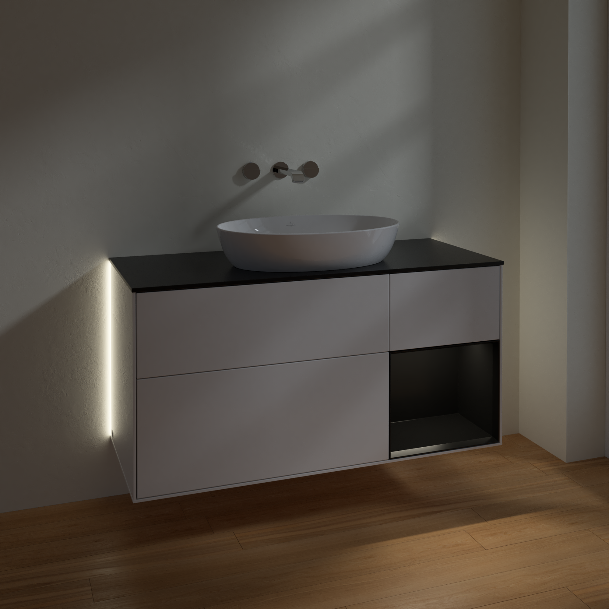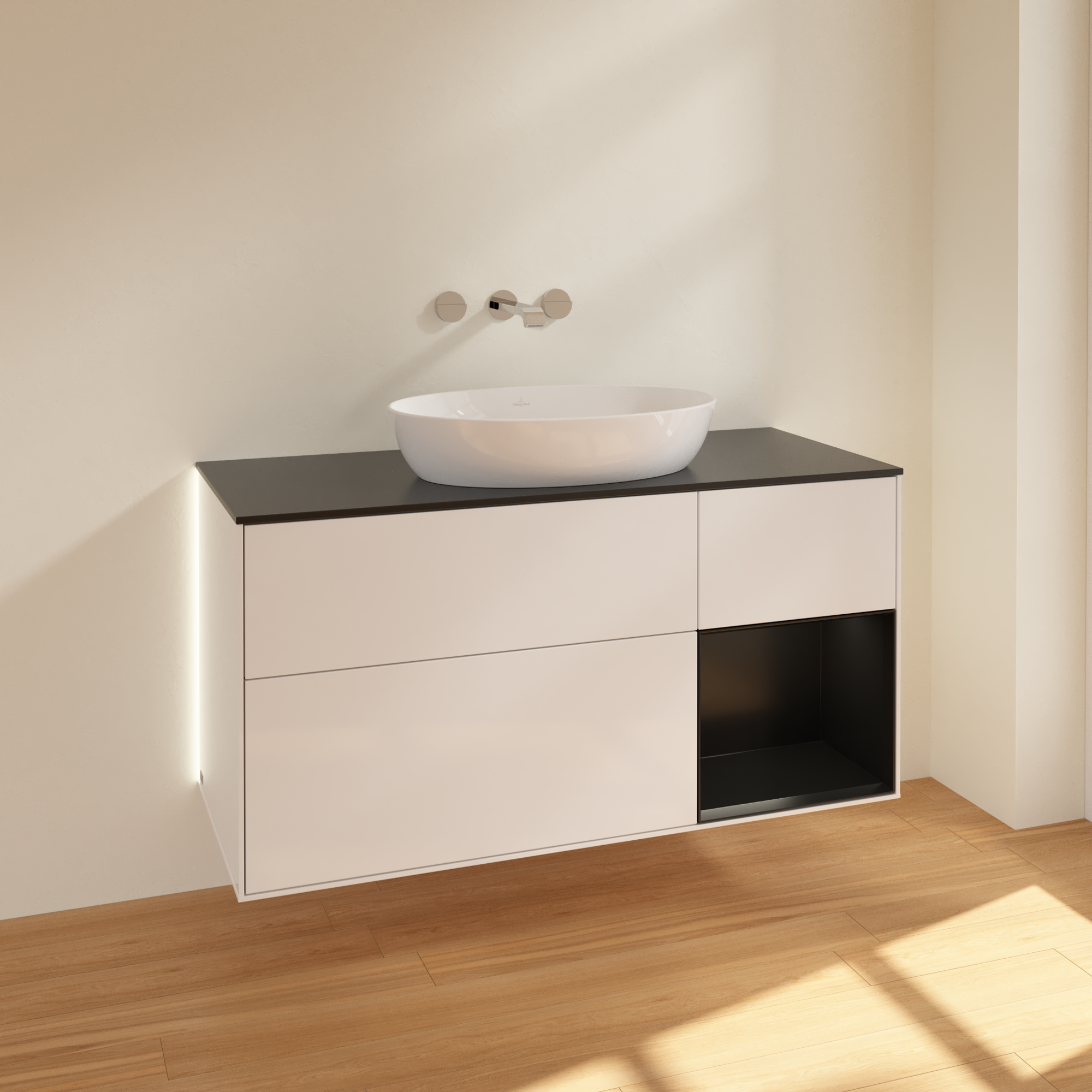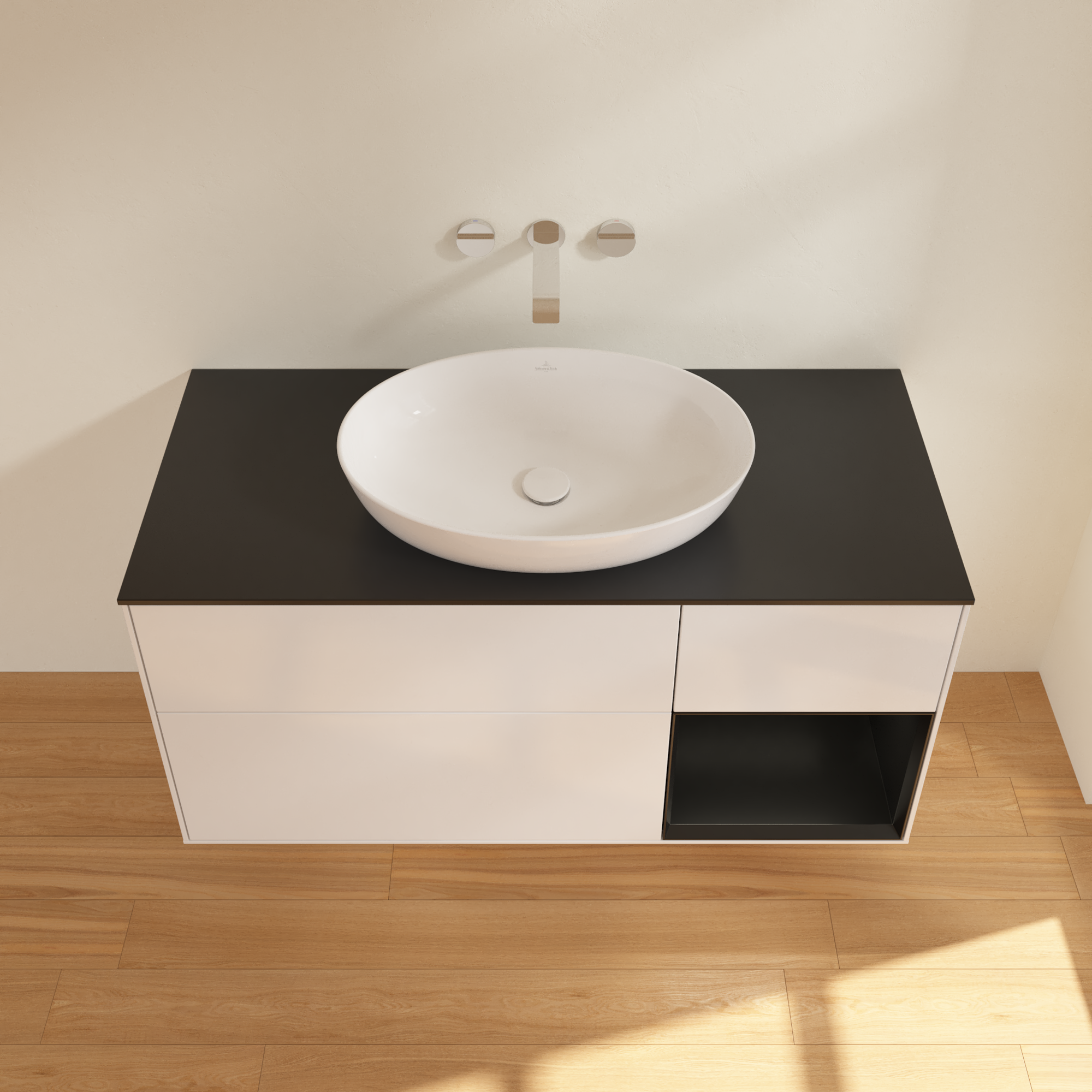 Finion Meuble sous plan, avec éclairage, 3 tiroirs sur rails, 1200x603x501mm, Caisson: Glossy White Lacquer, Façade: Glossy White Lacquer, Élément d’étagère: Black Matt Lacquer, Plaque de recouvrement: Glass Black Matt