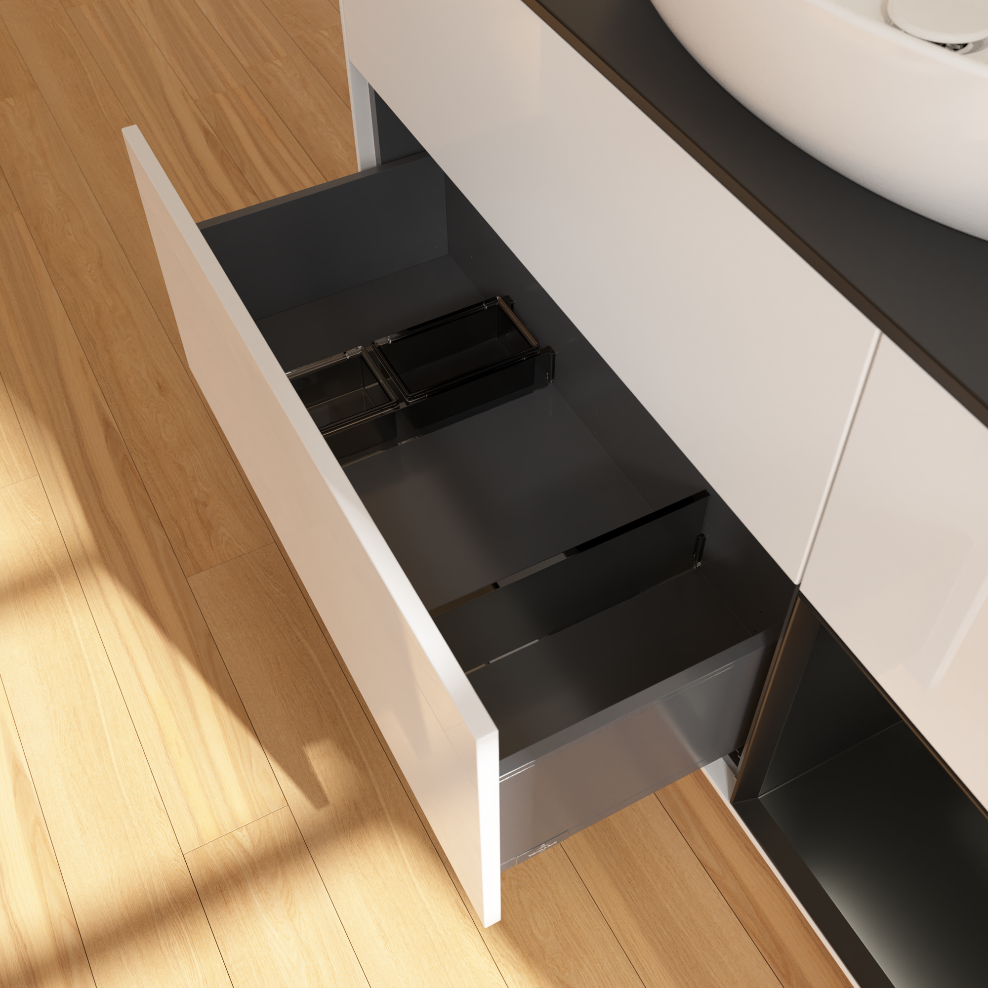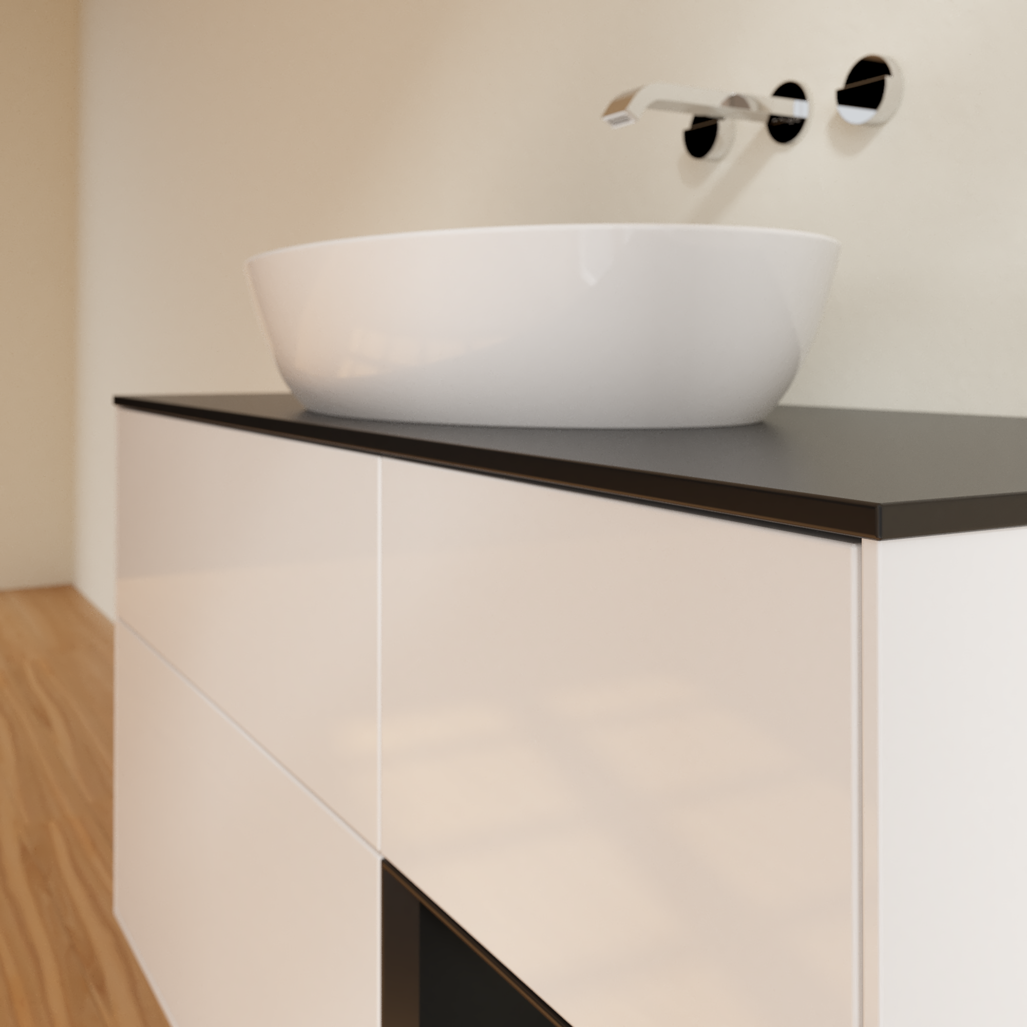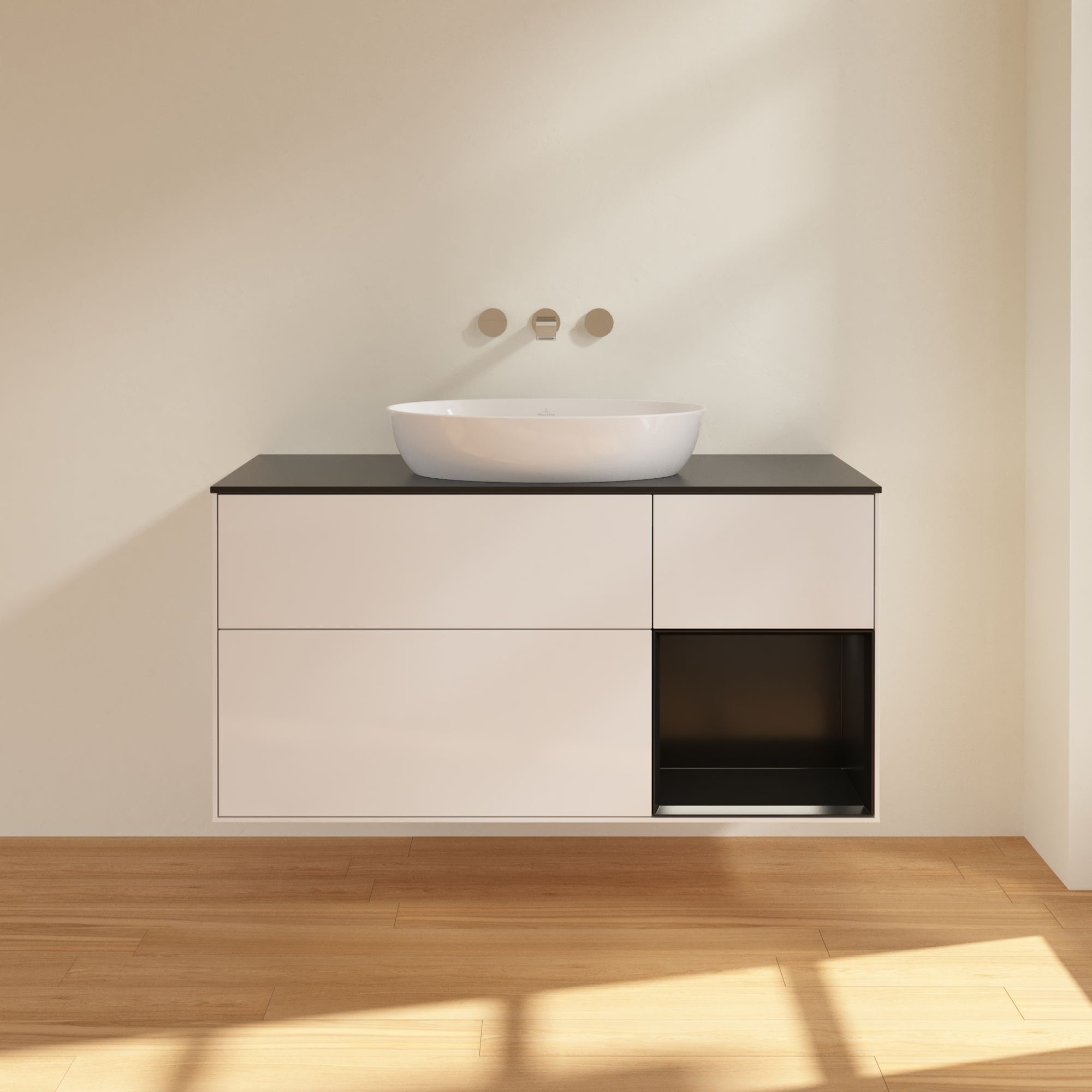 Finion Meuble sous plan, avec éclairage, 3 tiroirs sur rails, 1200x603x501mm, Caisson: Glossy White Lacquer, Façade: Glossy White Lacquer, Élément d’étagère: Black Matt Lacquer, Plaque de recouvrement: Glass Black Matt