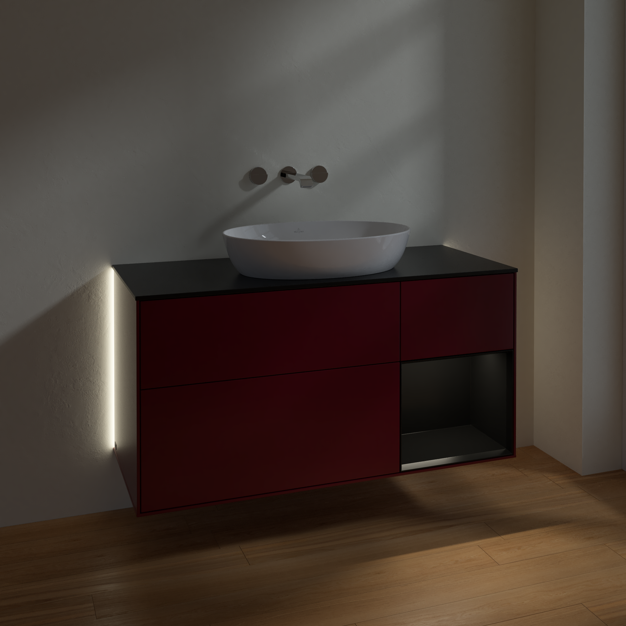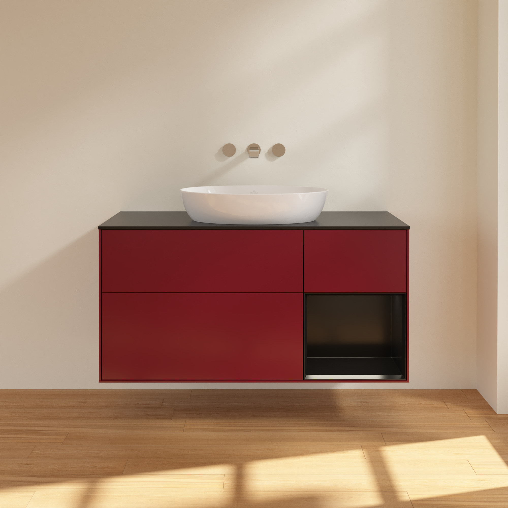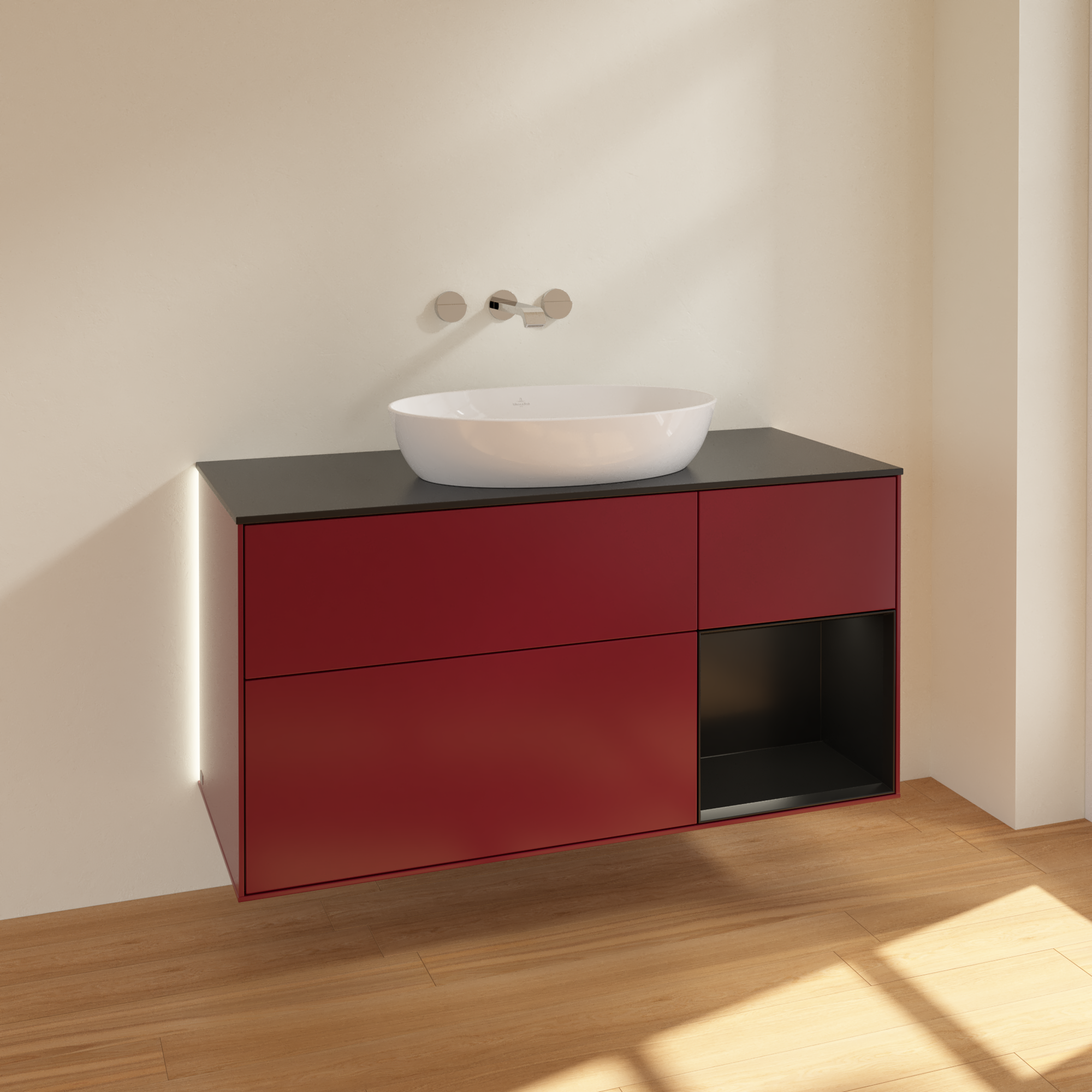 Finion Meuble sous plan, avec éclairage, 3 tiroirs sur rails, 1200x603x501mm, Caisson: Peony Matt Lacquer, Façade: Peony Matt Lacquer, Élément d’étagère: Black Matt Lacquer, Plaque de recouvrement: Glass Black Matt