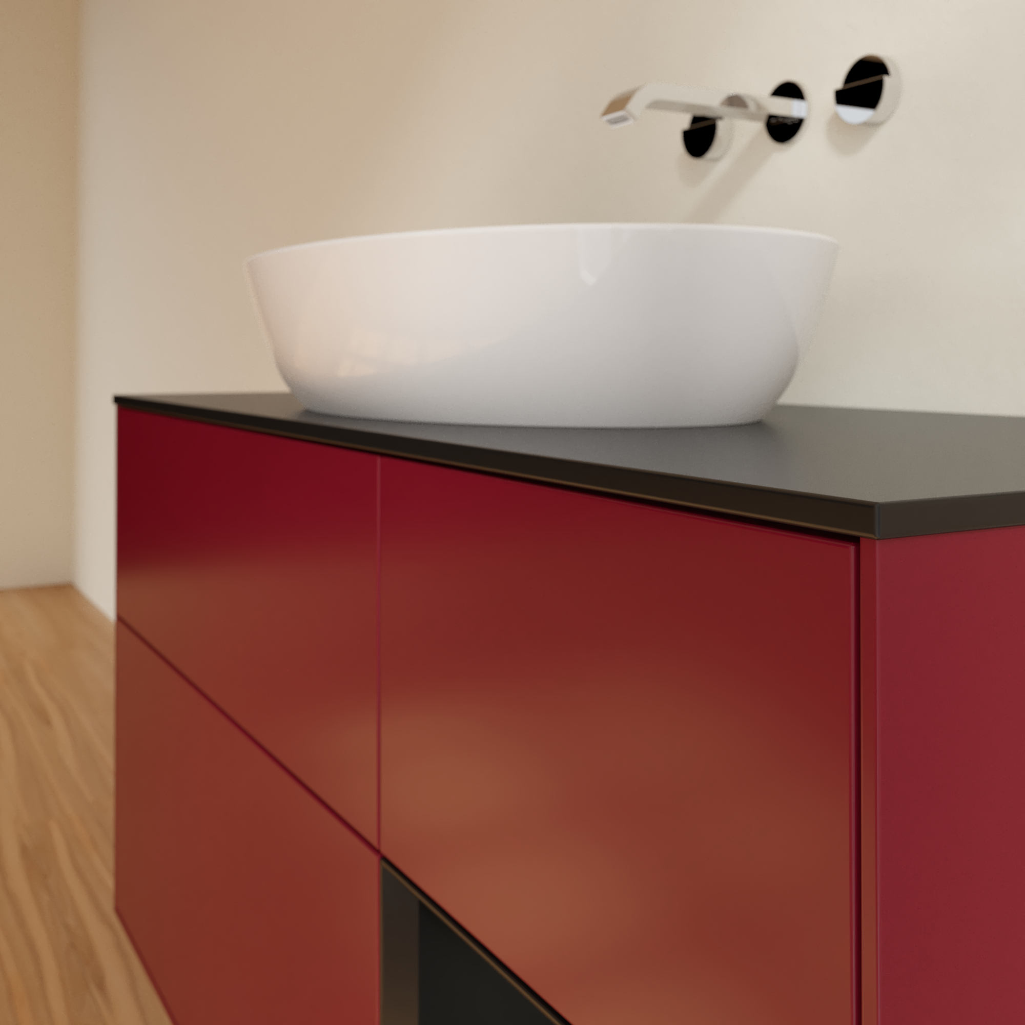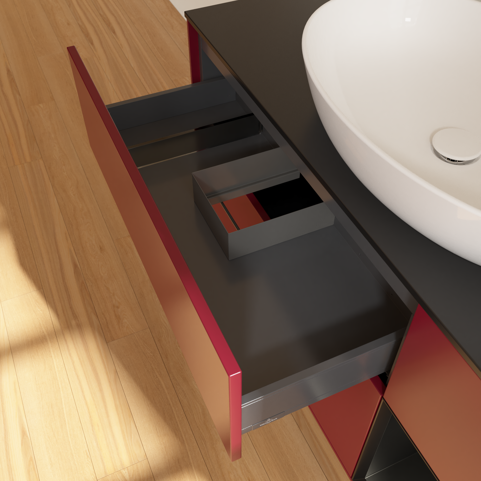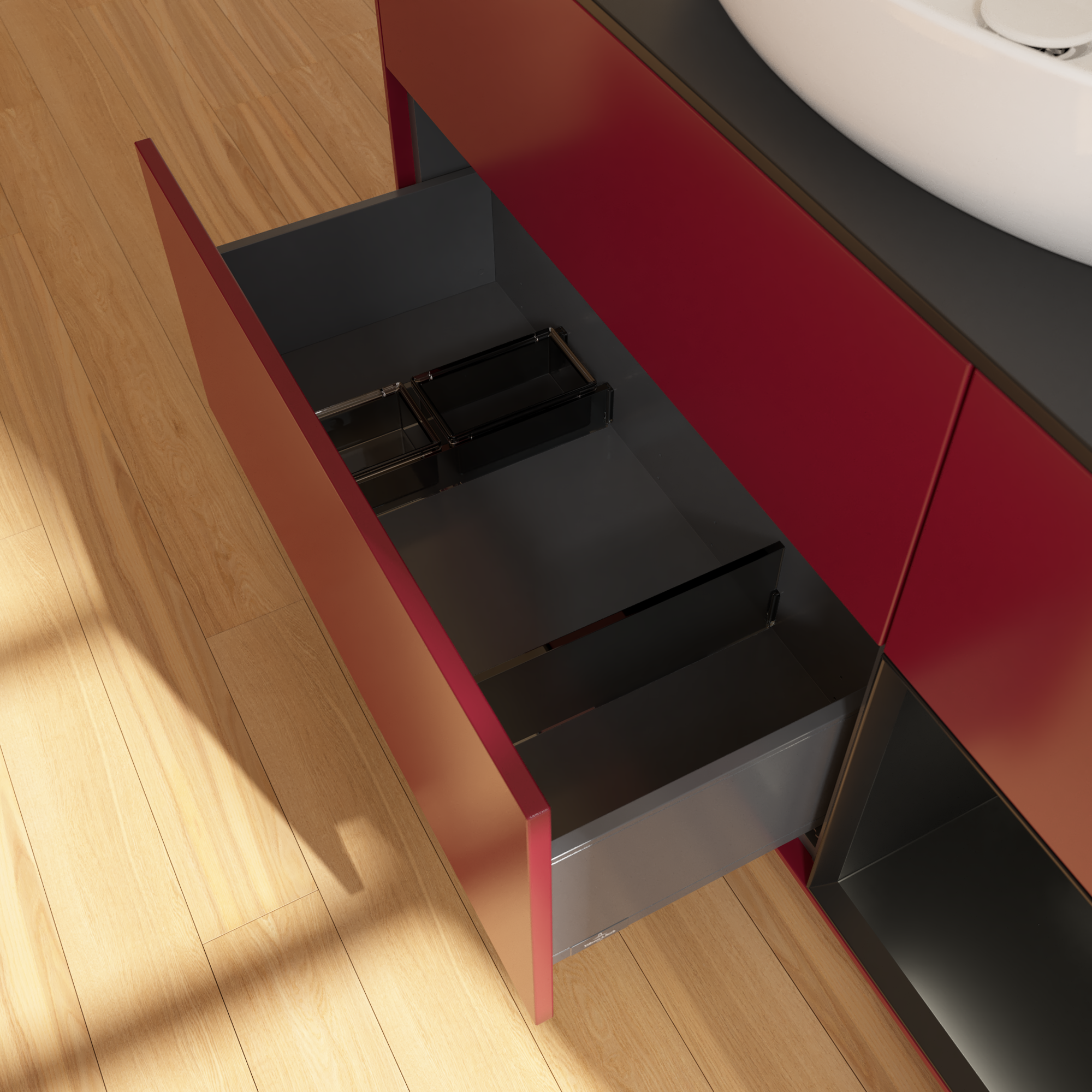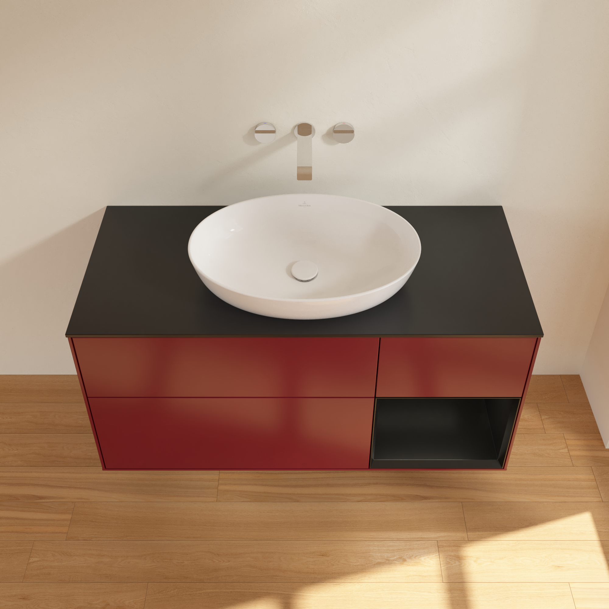 Finion Meuble sous plan, avec éclairage, 3 tiroirs sur rails, 1200x603x501mm, Caisson: Peony Matt Lacquer, Façade: Peony Matt Lacquer, Élément d’étagère: Black Matt Lacquer, Plaque de recouvrement: Glass Black Matt